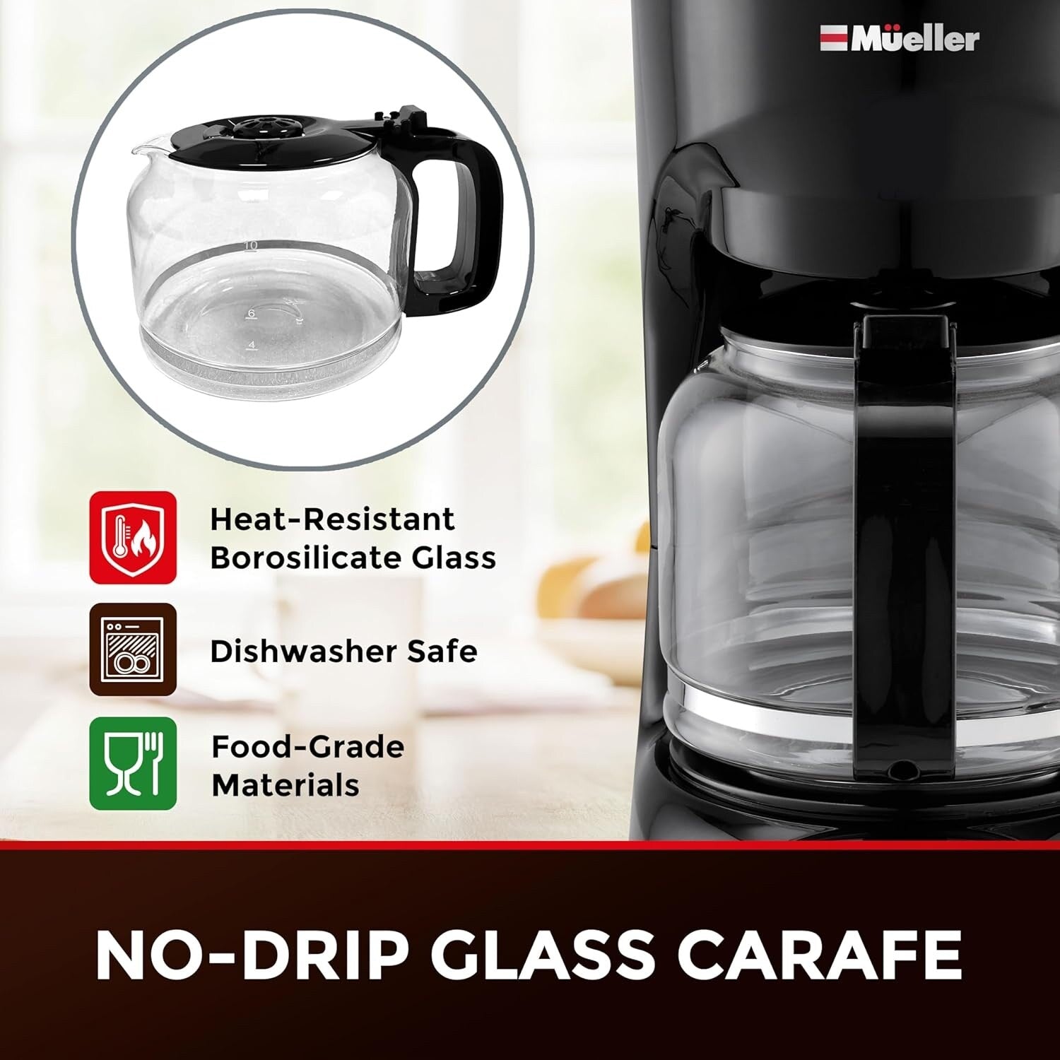 Generous Capacity & Durable Design: Glass carafe with 60oz capacity, this allows you to brew a large amount of coffee up to 12 full cups, or simply choose 2 or 4 at a time. It has an easy-grip handle for comfortable, drip-free pouring. The dishwasher safe carafe coffee pot is made of high-quality, non-porous borosilicate glass, which won’t absorb odors, while its superb heat-resistance will keep your coffee hotter for Ionger. Reusable Eco-Filter: Our permanent filter technology not only enriches the flavor of your coffee but also saves you the cost and waste of disposable filters. Easy to remove and clean, however filter paper can still be used if you prefer. Savor the flavor in every refill. Improved Keep Warm Safety: Our keep-warm function maintains your coffee's temperature, ensuring your last cup is as warm as the first. After your machine has brewed a fresh carafe of coffee, the warming plate will retain heat, and then will automatically turn off after 2 hours. Perfect for busy mornings or leisurely brunches. (*Not compatible with Smart devices.) Thoughtful Features: The Mueller coffee machine comes with a non-drip carafe and non-slip feet for stability, ensuring your brewing experience is clean and safe. Superior Quality With Mueller - We are here to offer you only the best quality products designed to make your life easier. If you need any help, please feel free to contact us.