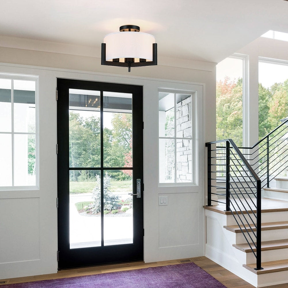 Add a touch of modern rustic style to your home with this 3-light semi-flush mount ceiling light. The sleek matte black metal frame and white fabric drum shade give this fixture a unique blend of industrial, rustic, and traditional elements. Perfect for transitional decor, this light is ideal for hallways, entryways, closets, and even bedrooms. Vintage-style Edison bulbs are recommended to enhance the farmhouse-industrial vibe.