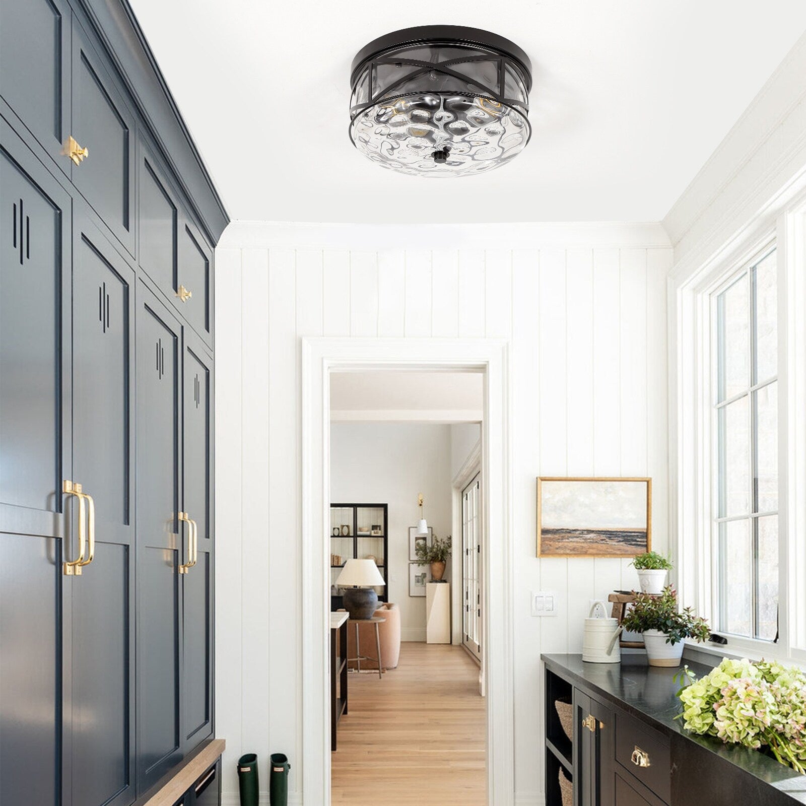 Featuring a modern design, this close to ceiling light fixture is made of a metal cage frame with clear hammered glass shade , create a chic and farmhouse look in your house.
