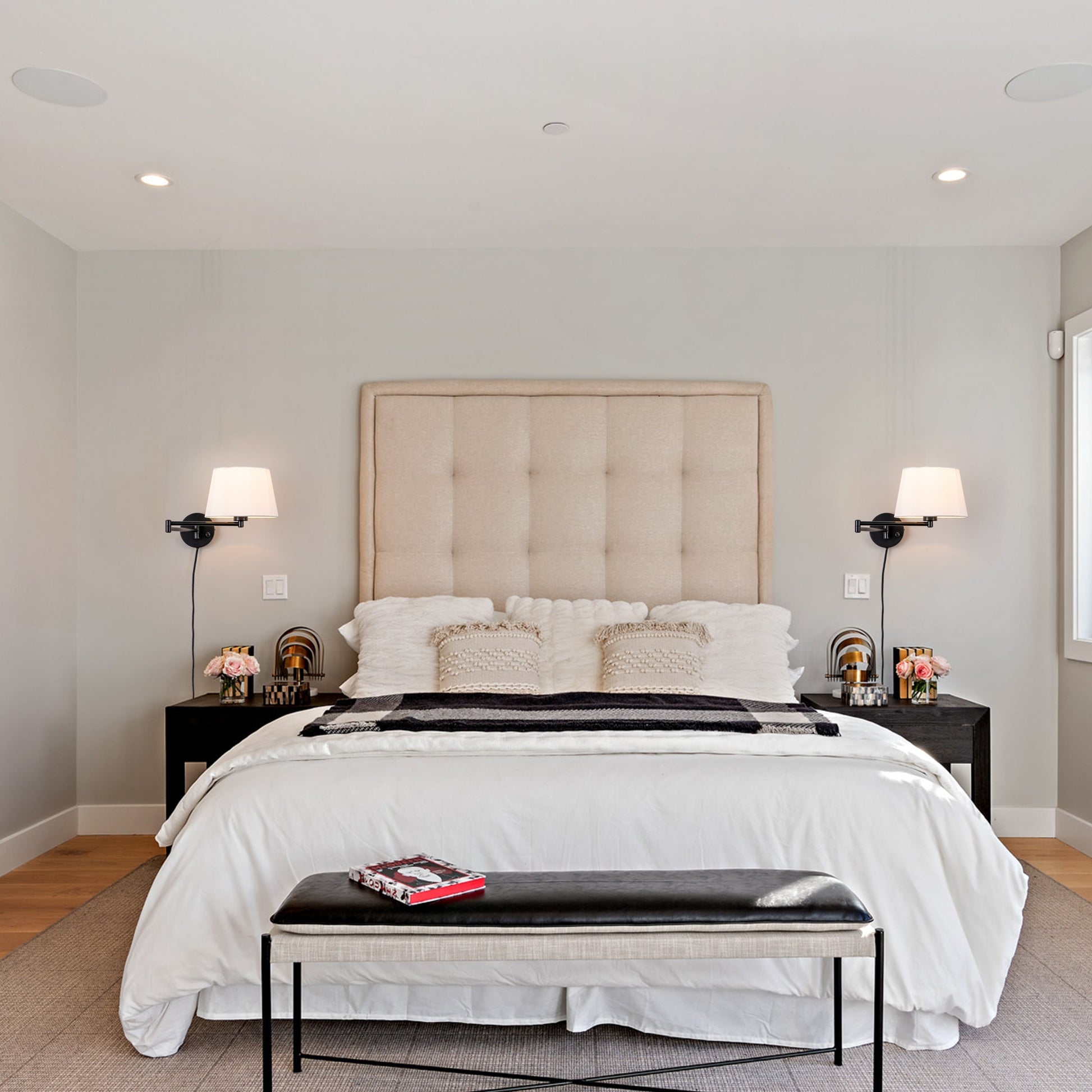 Add a touch of elegance to your home decor with these 2-Pack Black Swing Arm Wall Lights with Linen Shades. With its classic black finish and white linen shades, these lamps offer a modern feel and dramatic impact to any space. The double-jointed swing arms can be adjusted to direct light where it is needed most, while the built-in on-off switch on the wall plate gives you easy lighting control. These plug-in sconces are easy to install and a great addition to your bedroom, entryway, hallway, or living room.