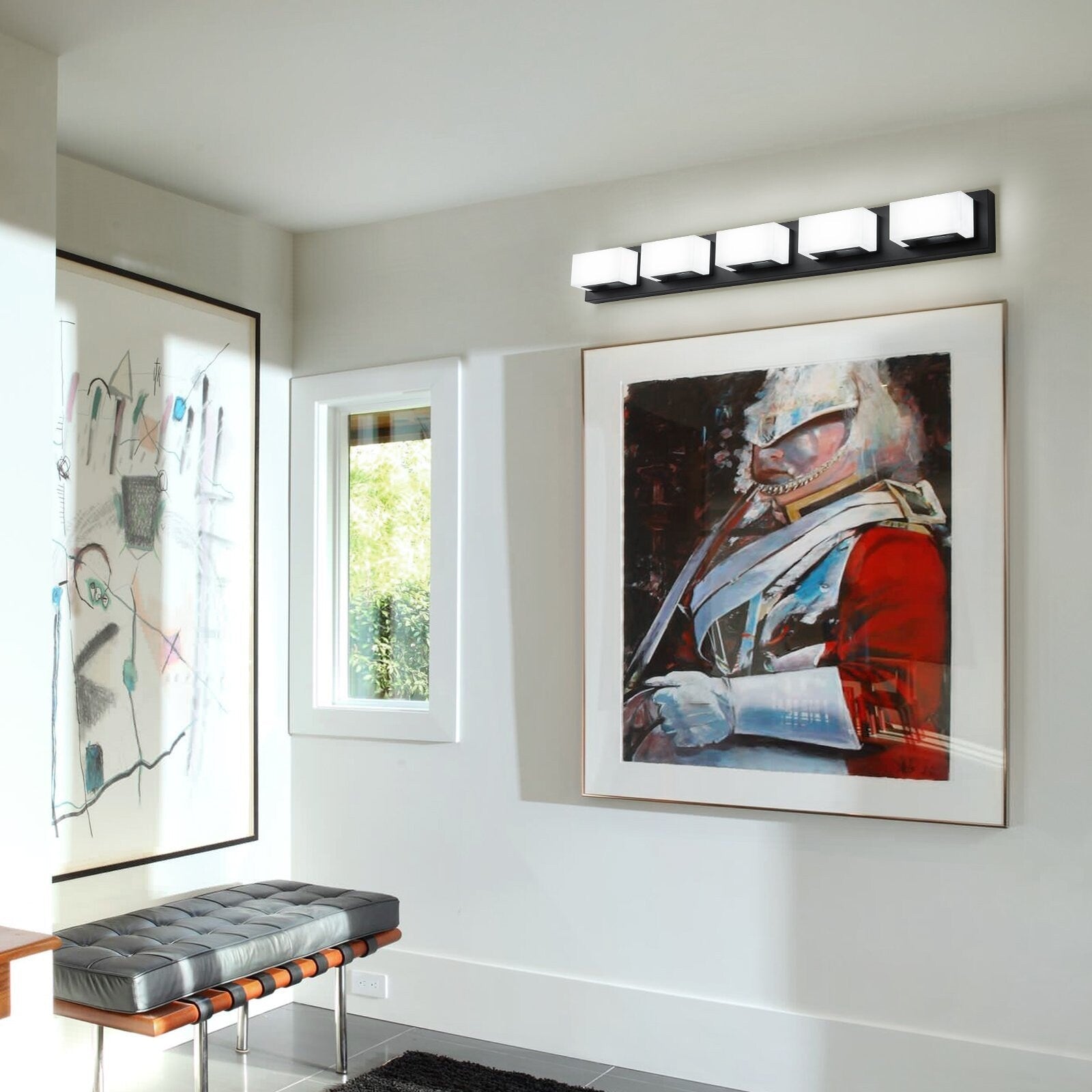 Add a sleek, contemporary flair to your bathroom or vanity area with this 3/4/5-Light rectangular LED vanity light. Designed with a unique hollow cube structure, this led vanity light features both inner and outer illumination, creating a clean, layered glow that enhances any modern interior. The matte black iron base pairs elegantly with frosted acrylic shades, offering a perfect balance of form and function. With energy-efficient LED lighting and a bright 6000K daylight color temperature, it's ideal for daily grooming or adding ambient brightness to your space.