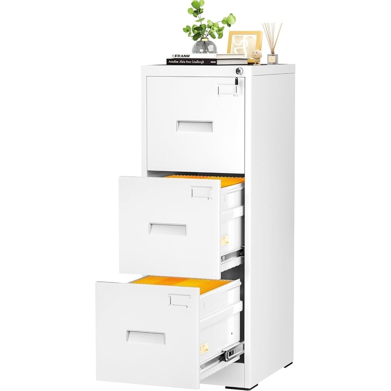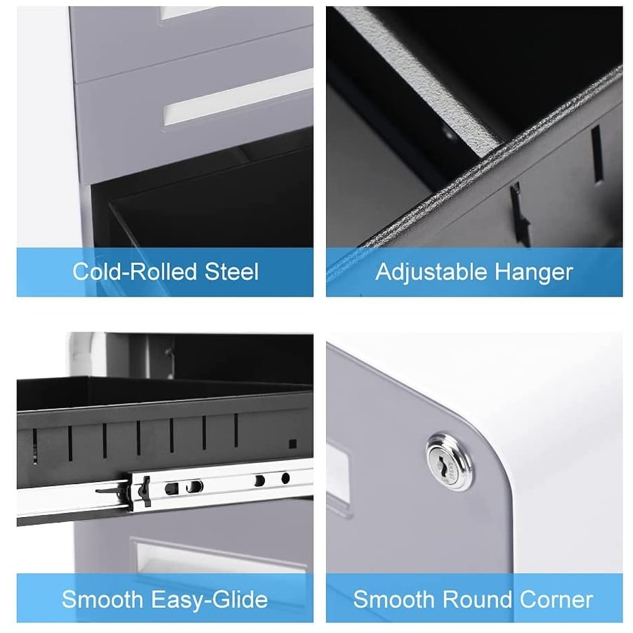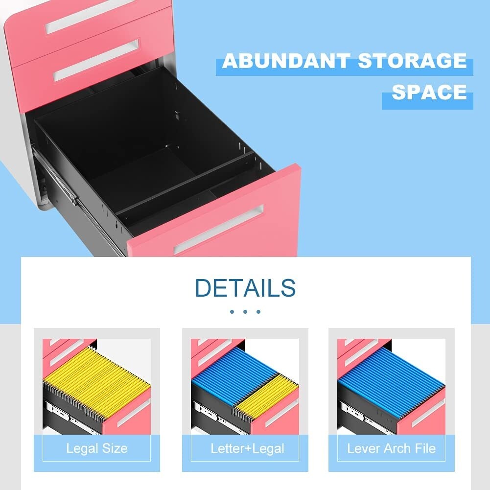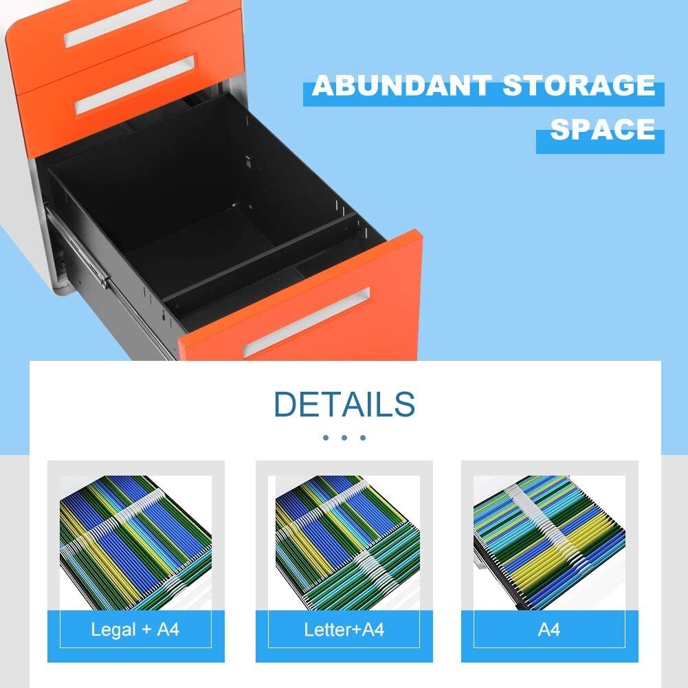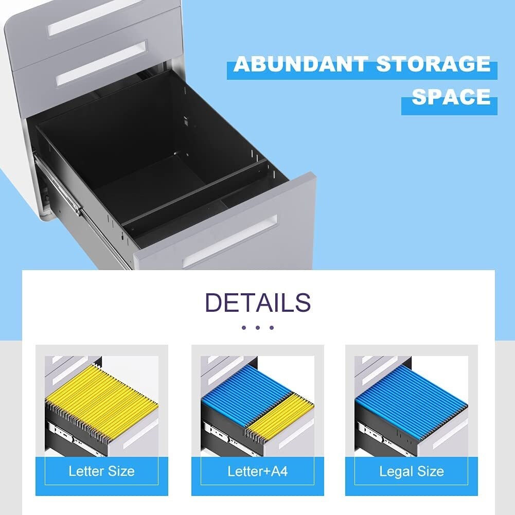 Keep important documents organized and within easy reach with this useful metal file cabinet. The three-drawer cabinet includes an adjustable file hanger to accommodate all standard file sizes. The drawers are lockable with the two included keys. With all drawers interlocking mechanism design, it will prevent tipping.