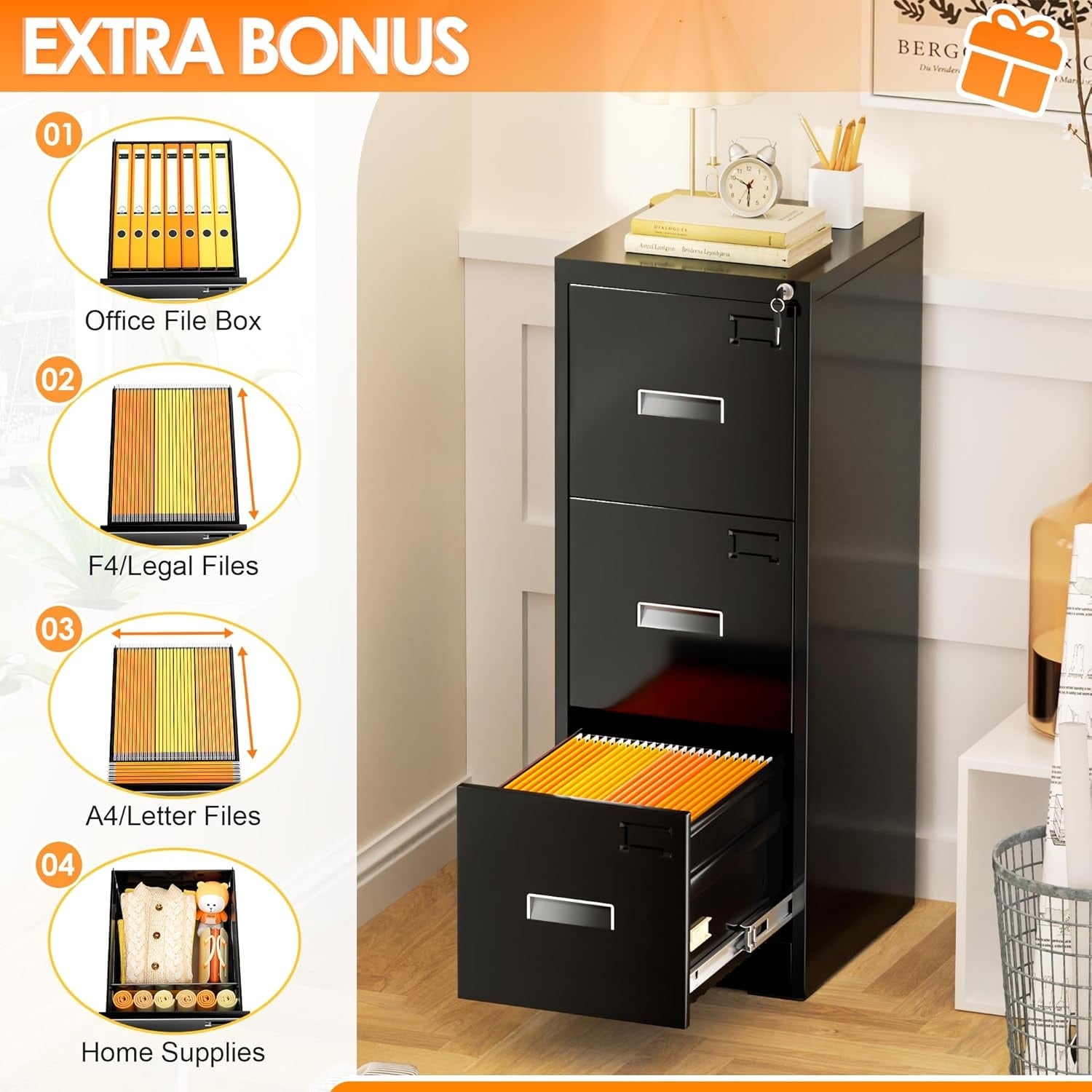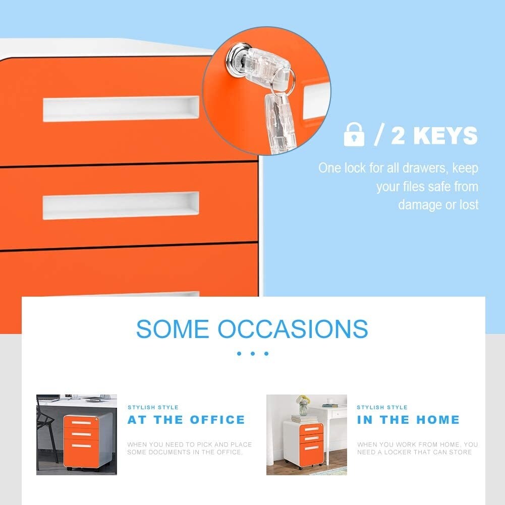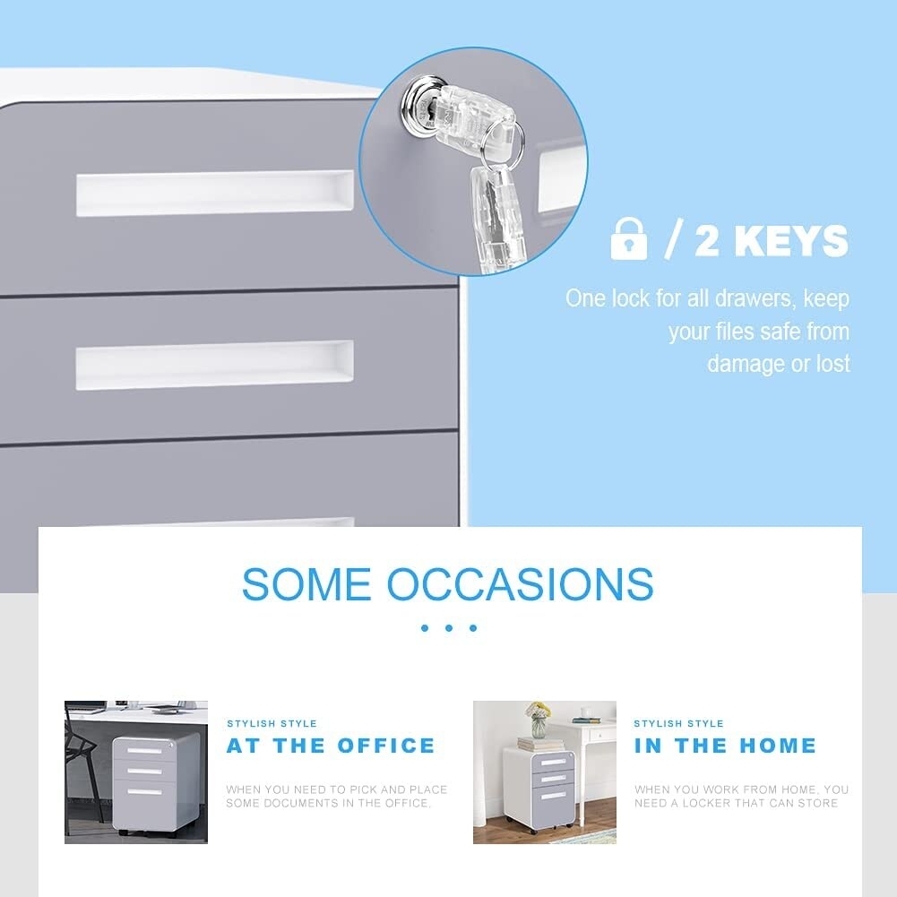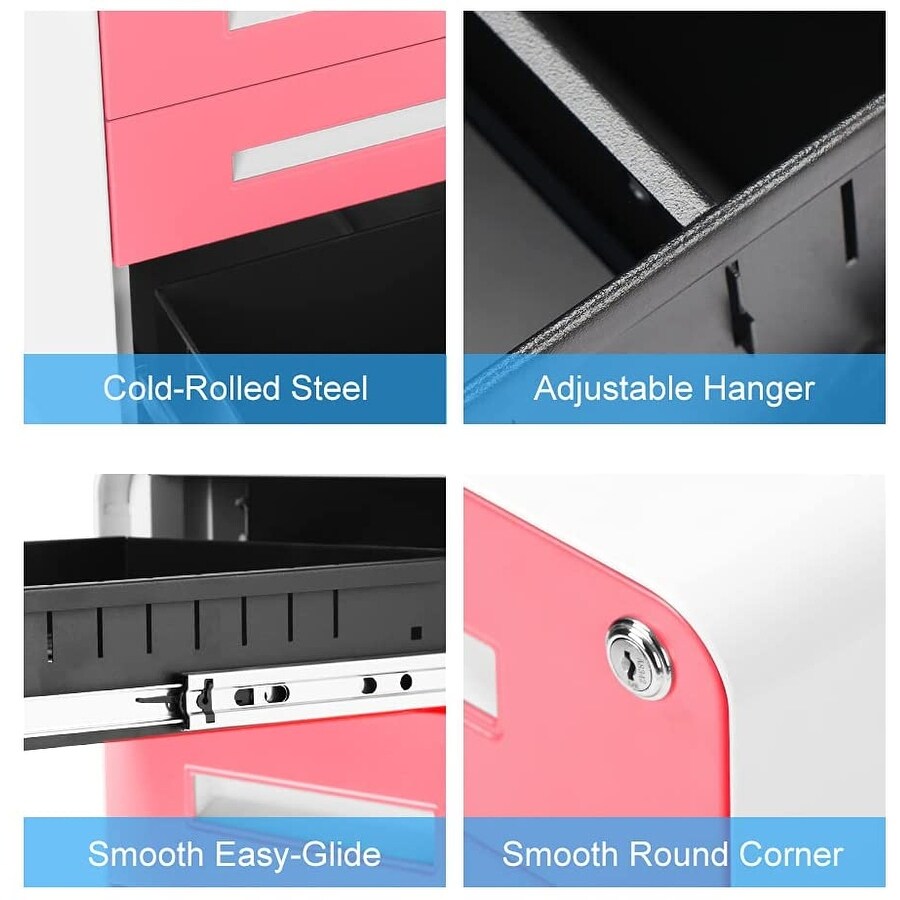 Keep important documents organized and within easy reach with this useful metal file cabinet. The three-drawer cabinet includes an adjustable file hanger to accommodate all standard file sizes. The drawers are lockable with the two included keys. With all drawers interlocking mechanism design, it will prevent tipping.