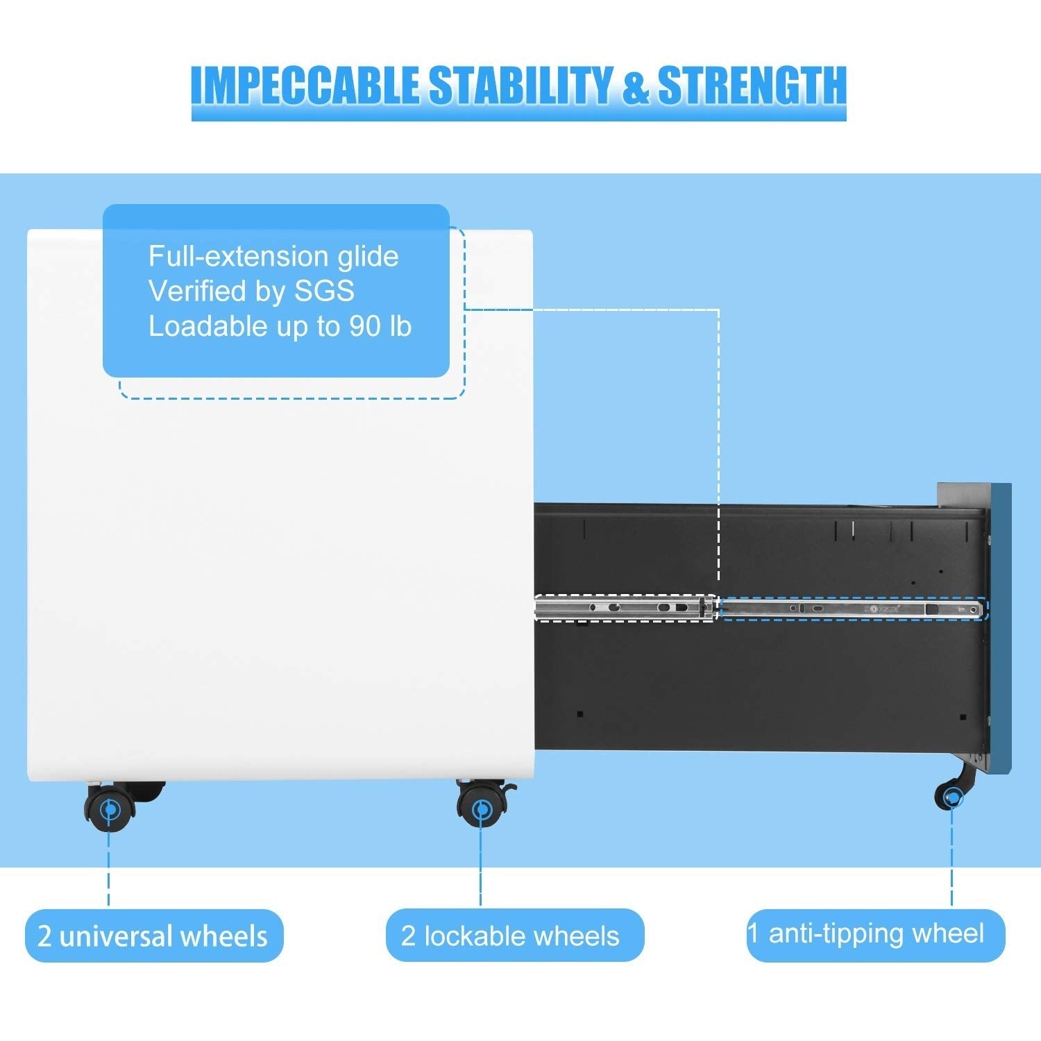 - 5 wheels (2 lockable, 2 universal, and 1 anti-tipping wheel on file drawer)