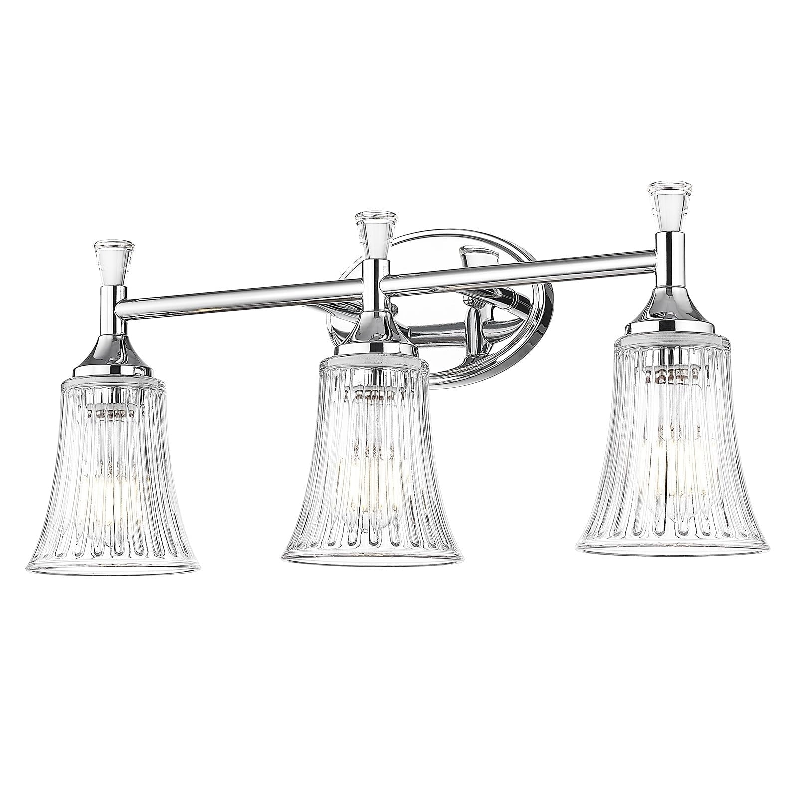 This bath mirror lamp is designed with bell shaped fluted glass shades and metal construction in a chrome finish. It fully emits soft light and gives your home an elegant ambiance. This sconce wall lighting is ideal for the bathroom, dressing room, powder room, headboard, vanity table, makeup dressing table, mirror cabinets, hallway, etc.