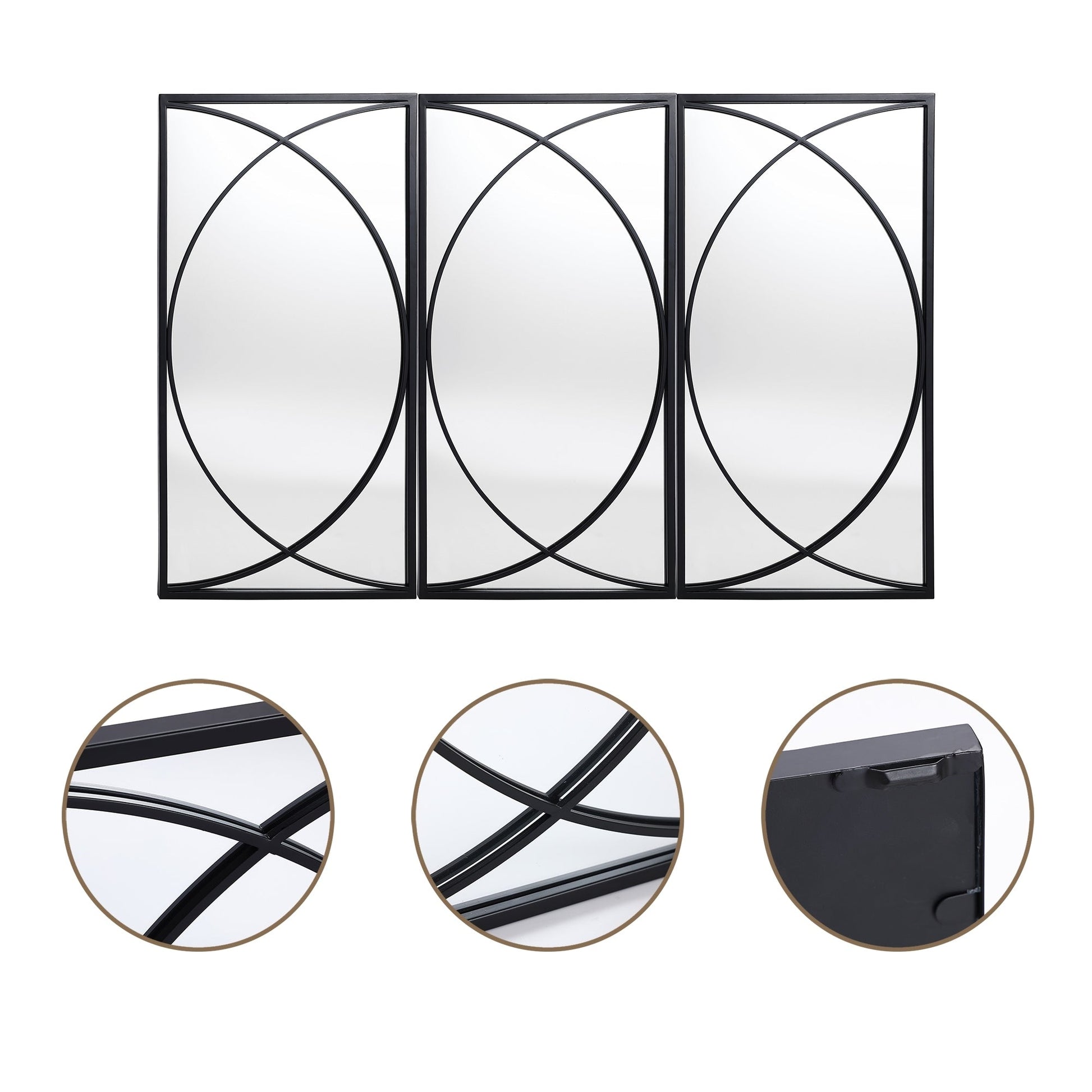 Upgrade your living space with these premium quality black metal rectangular wall mirrors. The set includes three mirrors with a contemporary design that can be arranged together or separately in various locations to add a personalized touch to your decor. The mirrors boast a high-quality glass surface that provides crystal-clear reflections, making them perfect for both functional and decorative purposes. The beautiful modern design features two semicircles intersecting in the middle, allowing you to mix and match them according to your needs and creativity..