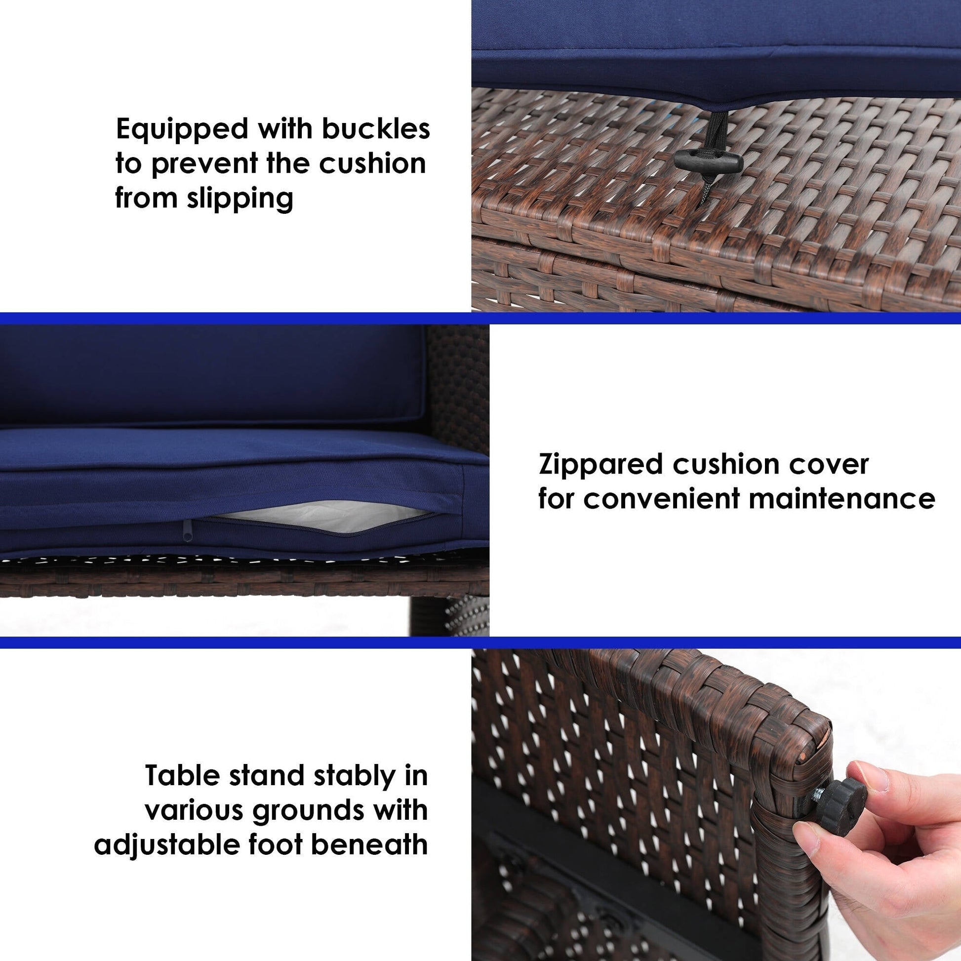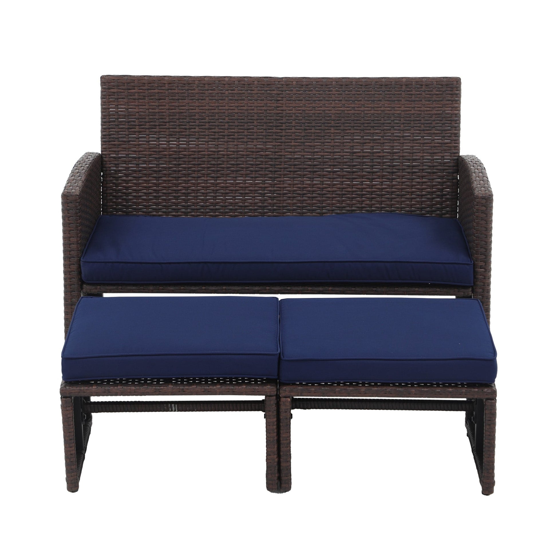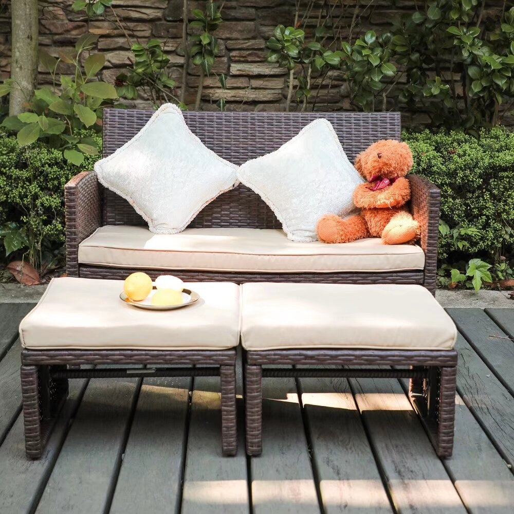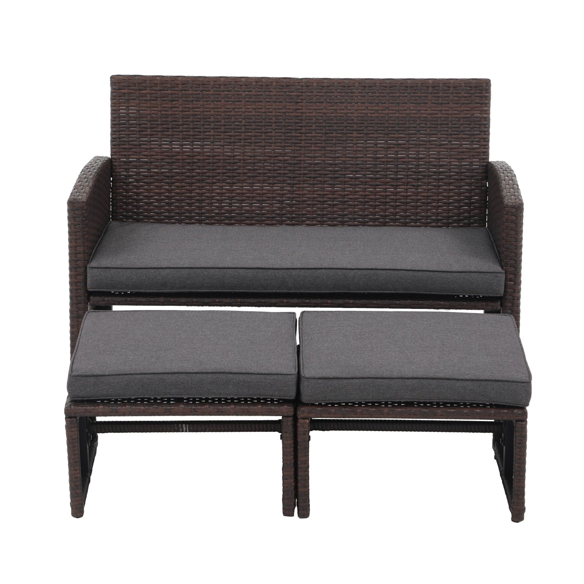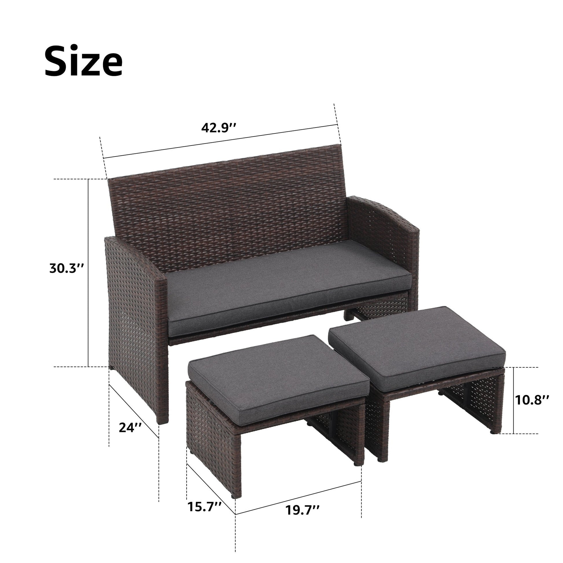Relax in style with this 3-piece Outdoor Rattan Sofa Set with Cushions. This set includes a loveseat and two ottomans with cushions, perfect for creating a comfortable outdoor living space. The handmade rattan finish and soft cushions with zippers provide contemporary appeal and ample comfort. Crafted with PE wicker that resists UV and aging, and a rust-resistant steel frame that offers stability and durability, this set is perfect for your patio, garden, backyard, or poolside. Ottoman can be stored under the loveseat for saving space. Plus, it's easy to assemble by following simple instructions.