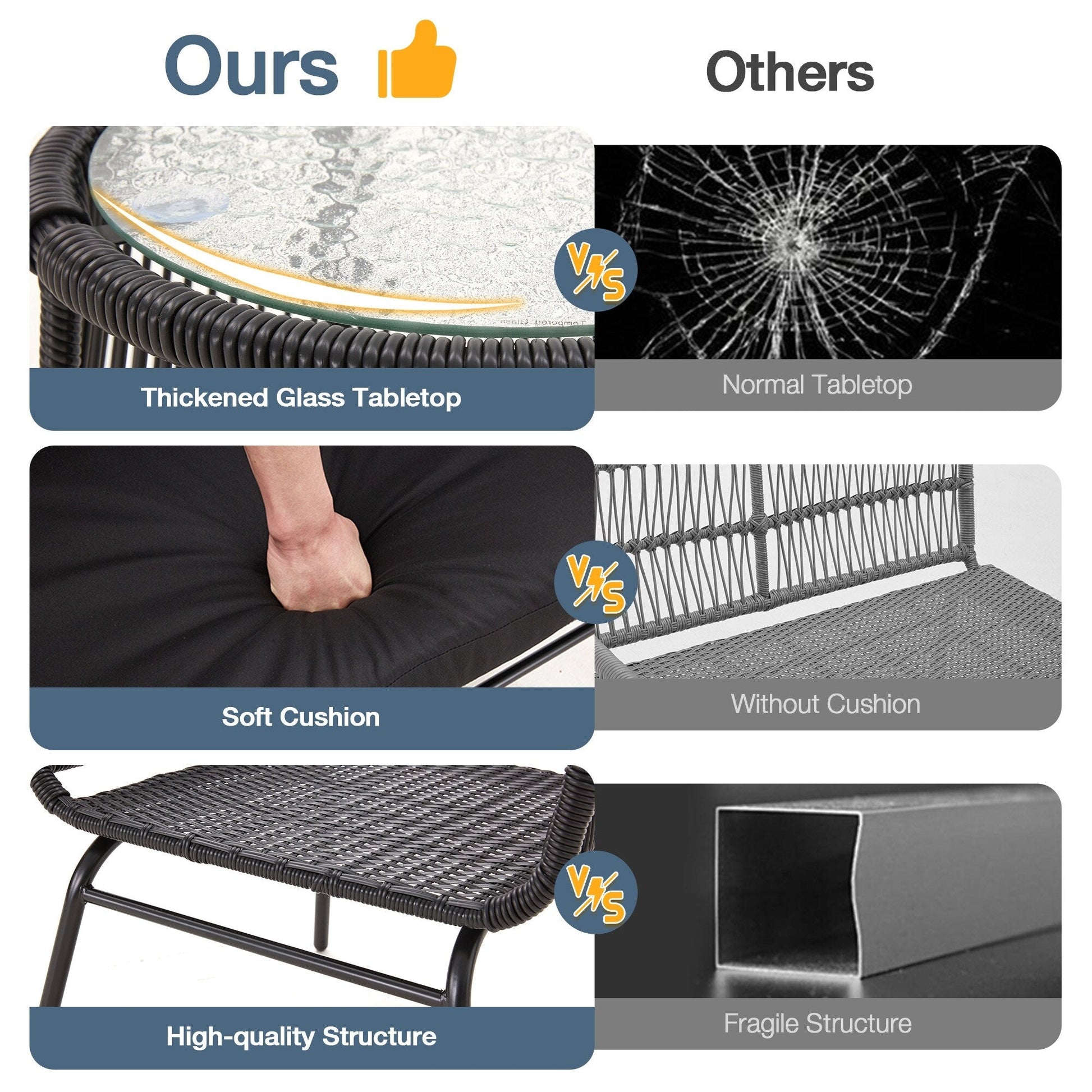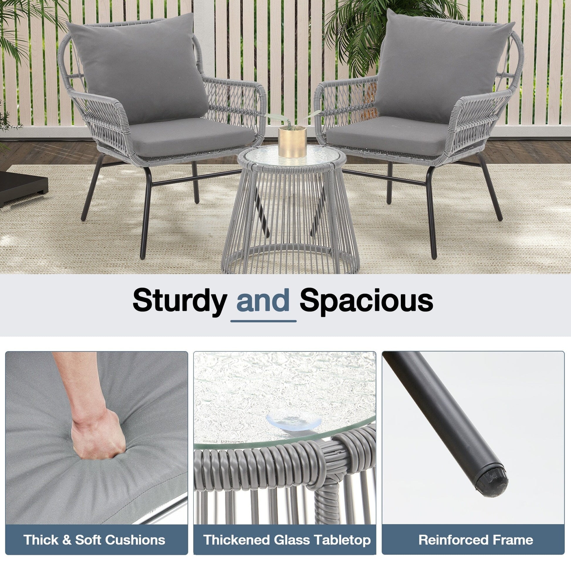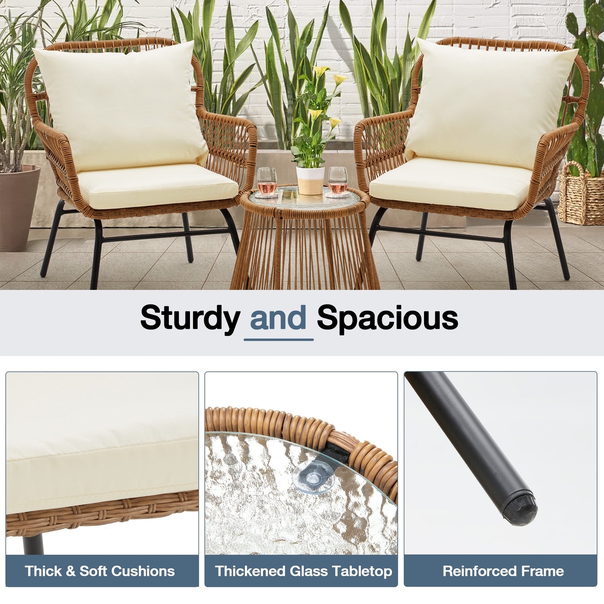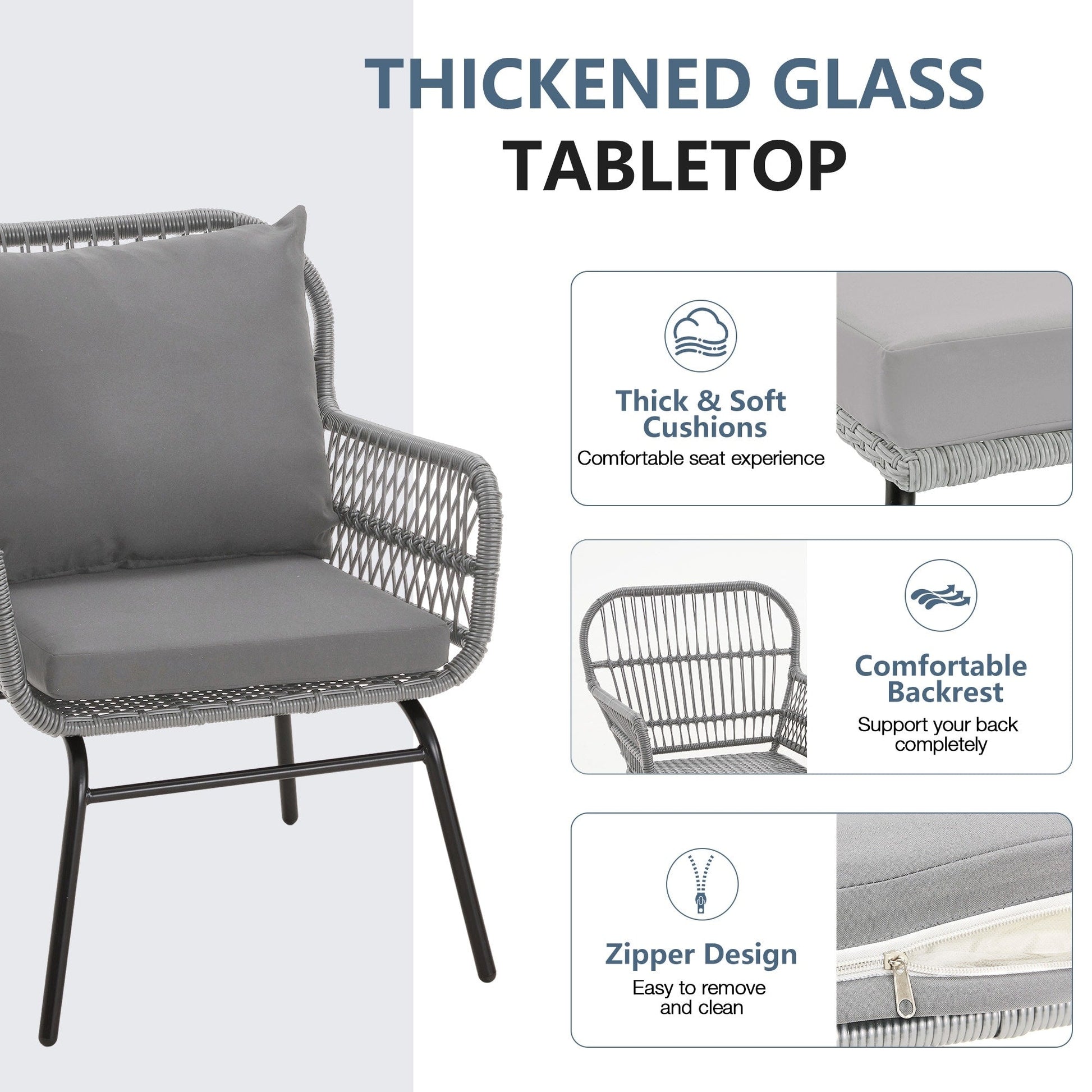 3-Piece Patio Conversation Bistro Set, Outdoor Rattan Furniture Set with Glass Table & 2 Wide Armchairs, Seat Cushions
