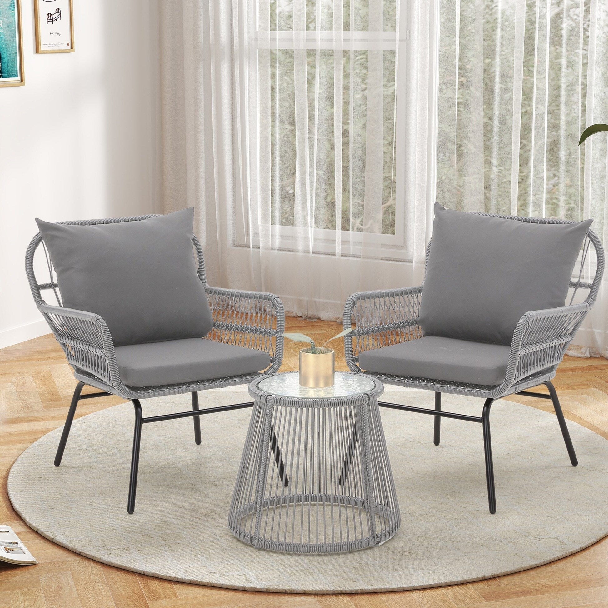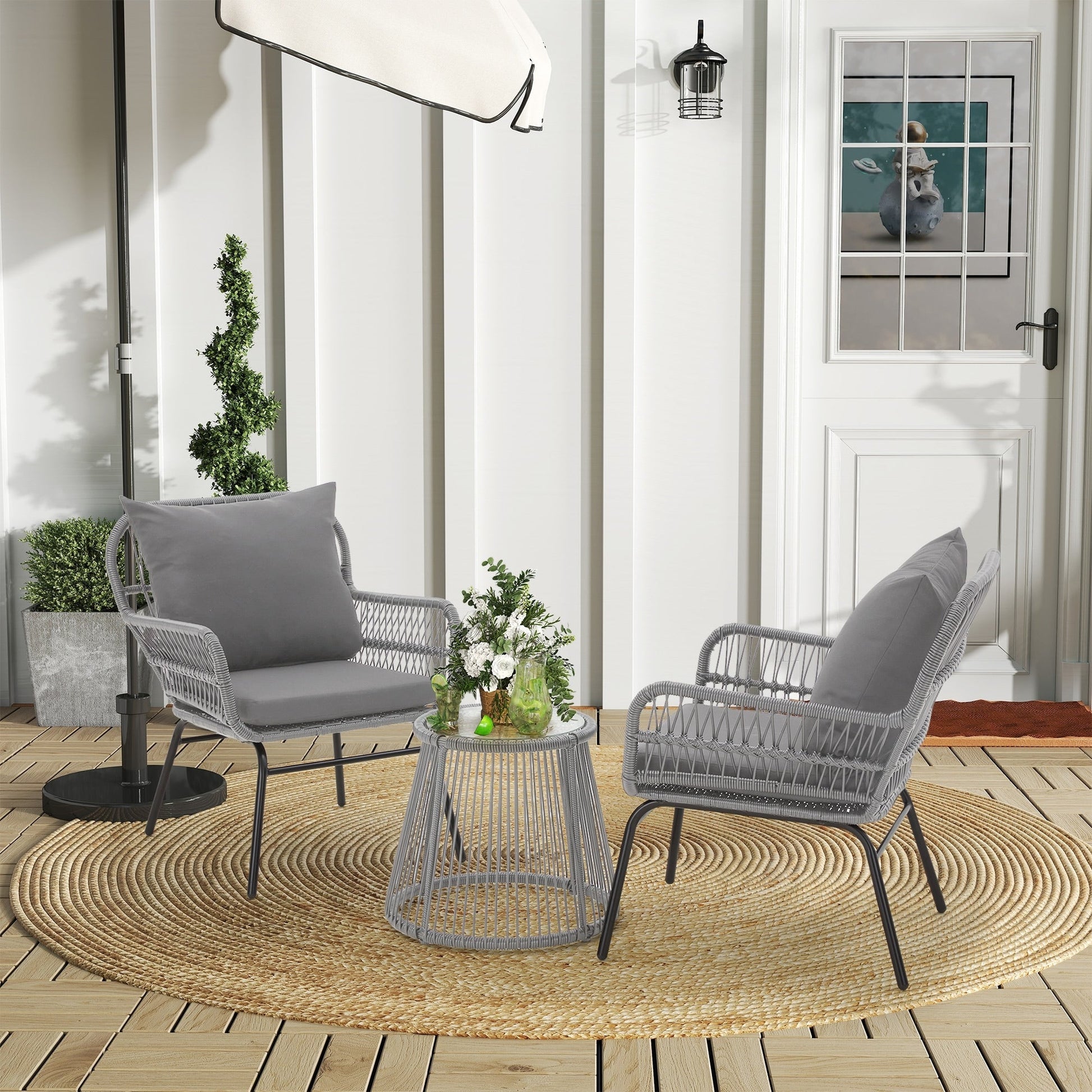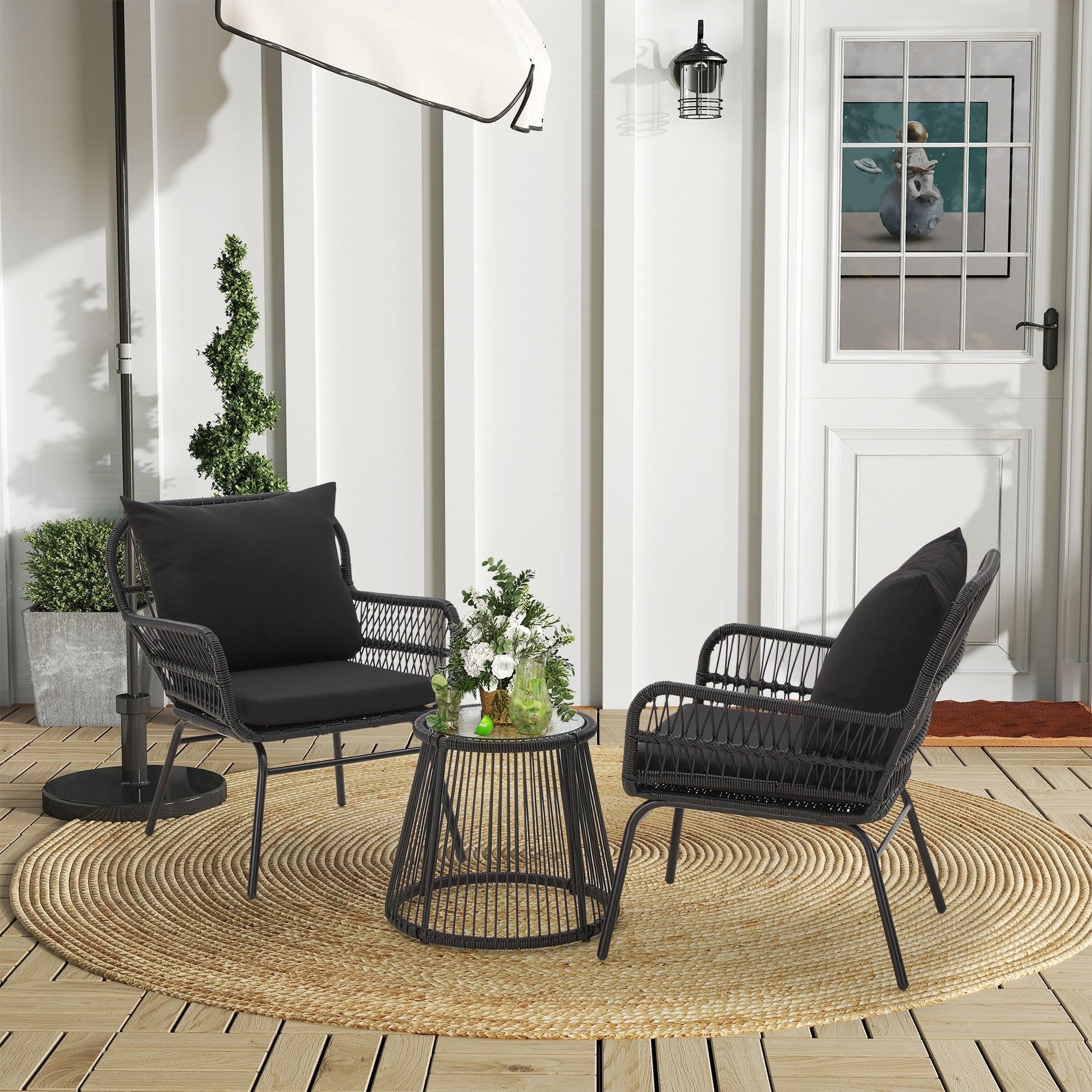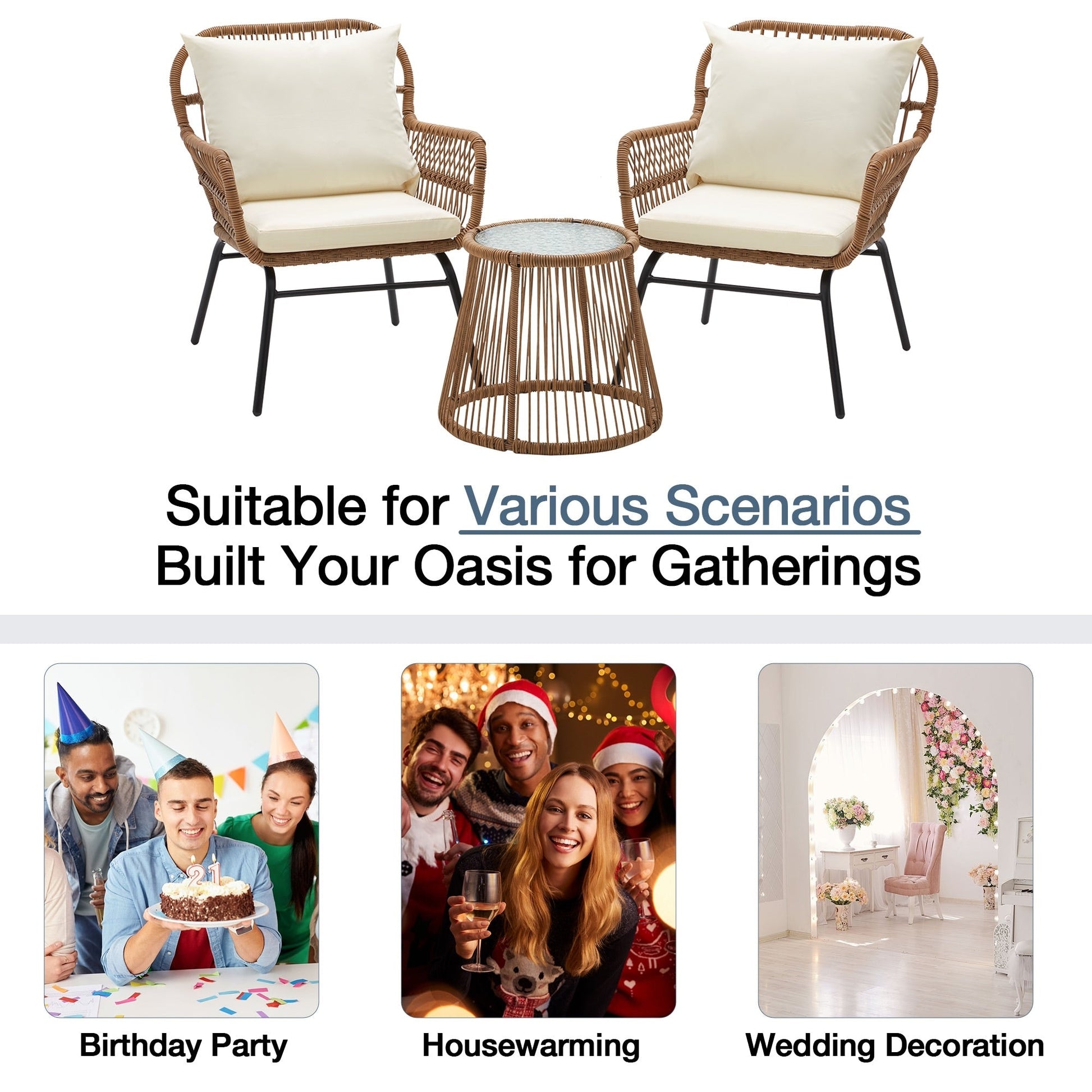 3-Piece Patio Conversation Bistro Set, Outdoor Rattan Furniture Set with Glass Table & 2 Wide Armchairs, Seat Cushions