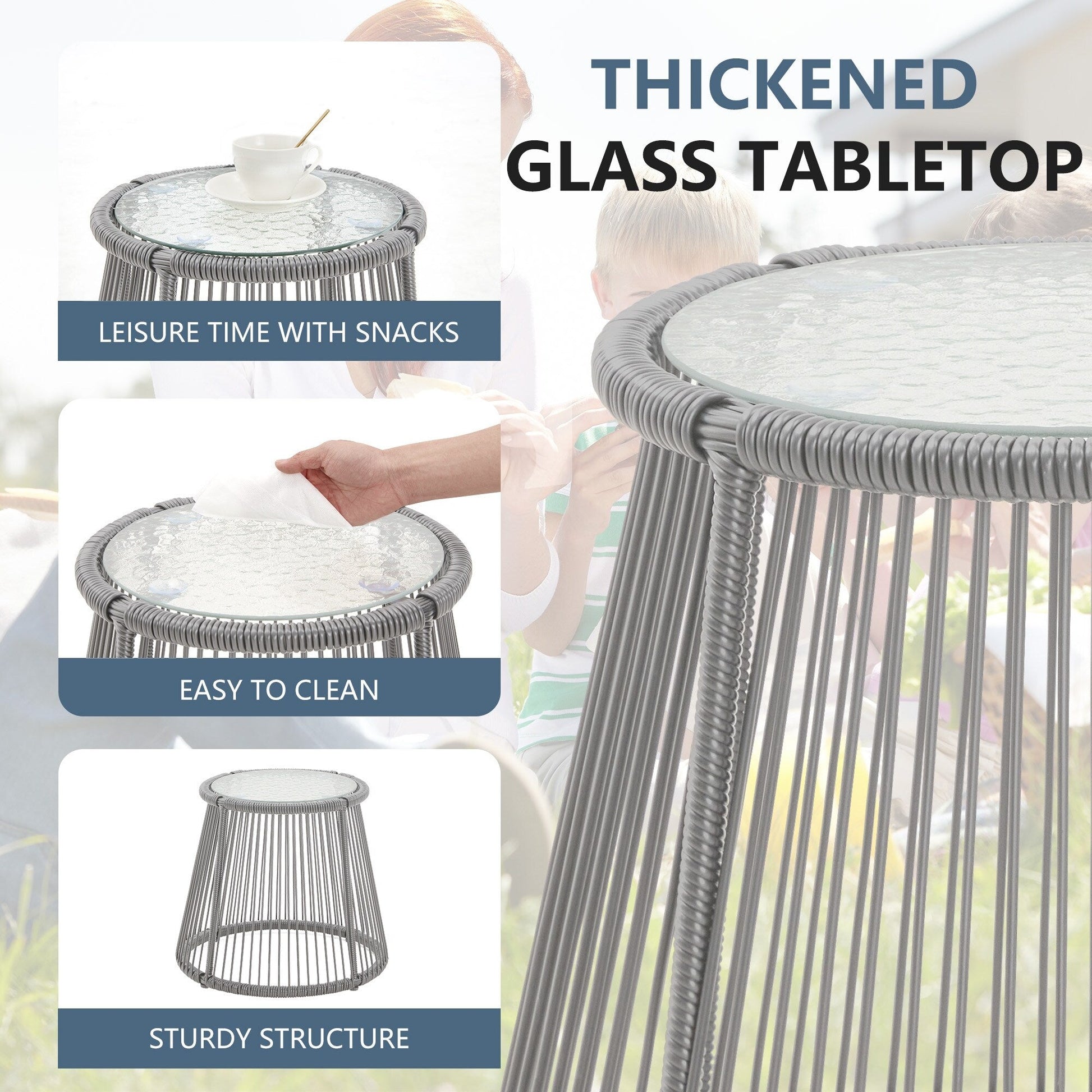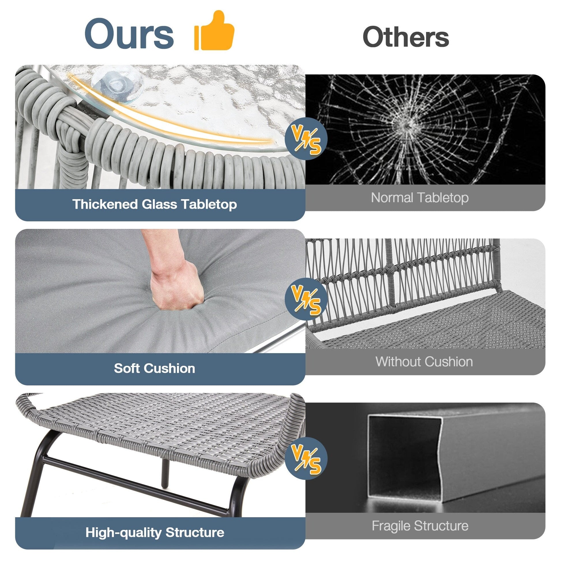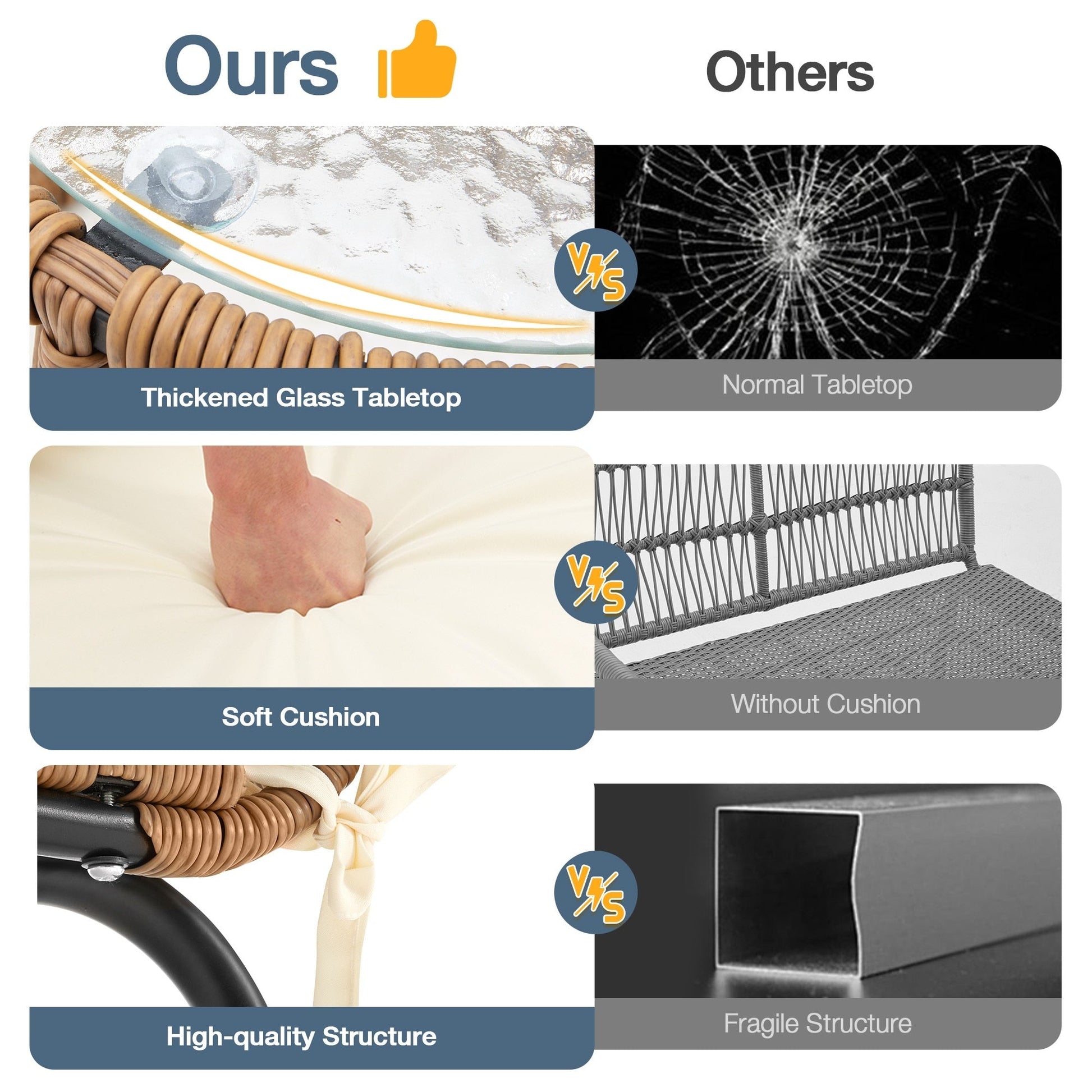 The elegant end table comes with a thickened glass top for easy cleaning, so you can put down your plate or coffee cup without getting dirty. The thickened table of the patio furniture set bears 50 pounds, and you can put books, tea cups, vases, and other items on it. -