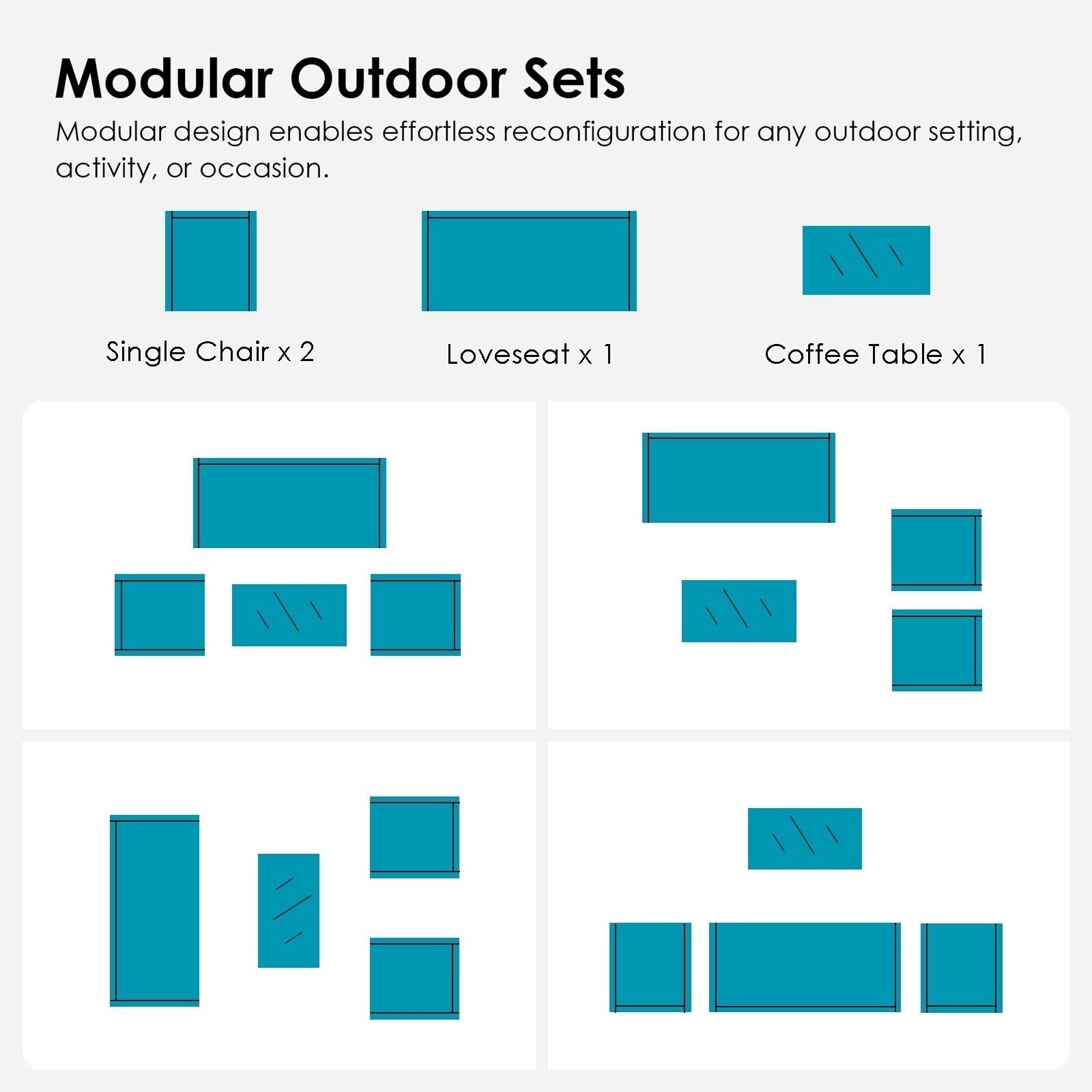 - Includes 1 loveseat, 2 single chairs, and 1 coffee table