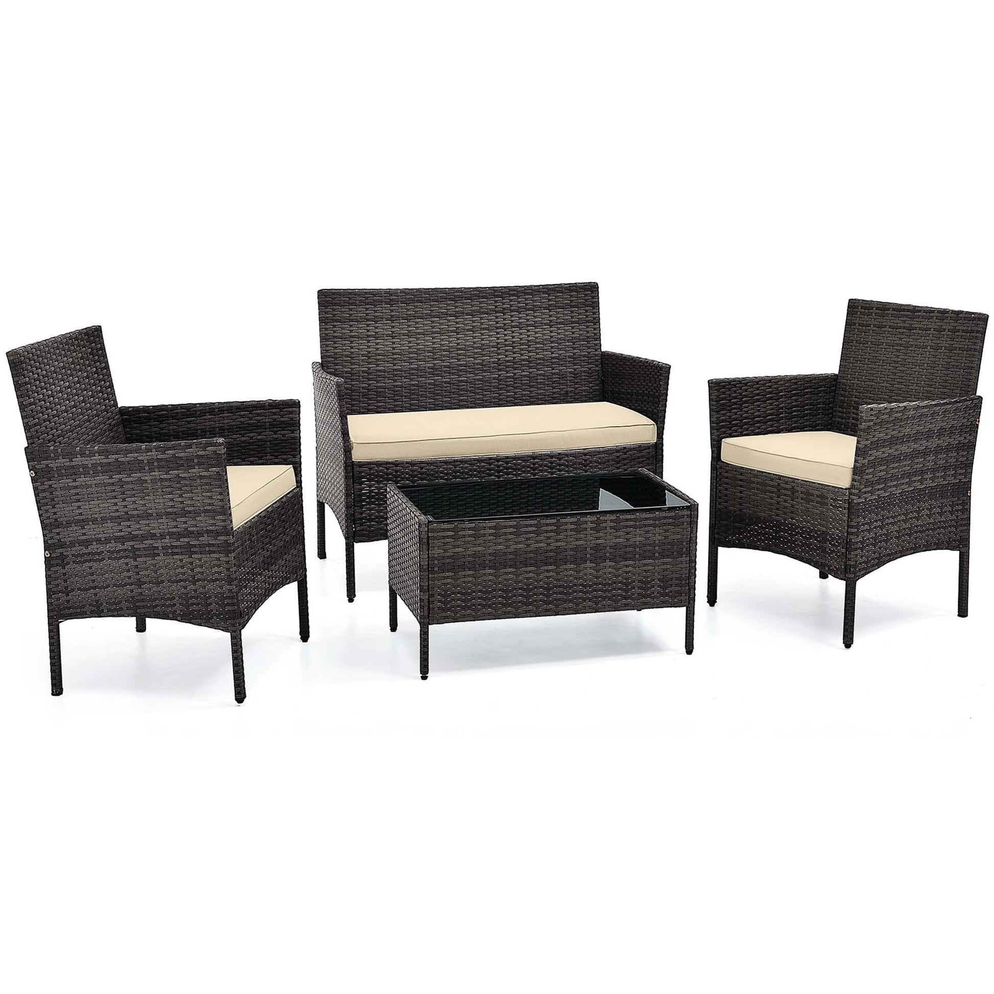 Immerse yourself in comfort with our 4 pieces patio furniture set!This outdoor sectional sofa set is made of fade-resistant and sun-resistant PE rattan in a mix brown color for long-lasting use. Besides, the chairs and loveseat are equipped with soft cushions that have smooth zippers for simple maintenance. The outdoor furniture set also includes a coffee table with a spacious tabletop, which makes items easily accessible. Furthermore, the solid metal frame with reinforced connections ensures overall stability. And the adjustable foot pads keep stable on uneven floors.