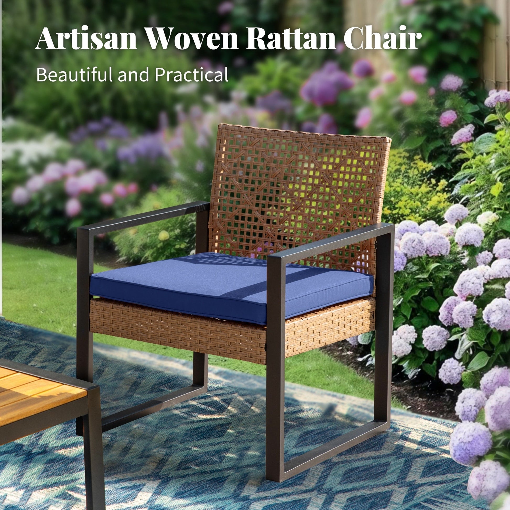 - Stylish Style: The excellent combination of dark and light colors and the typical modern style frame at 90 angles make this conversation set stand out among similar sets.The exotic and unique PE weave back design makes this chair look very special, and the table top is made of environmentally friendly solid Acacia wood material which is very high class and full of aesthetics