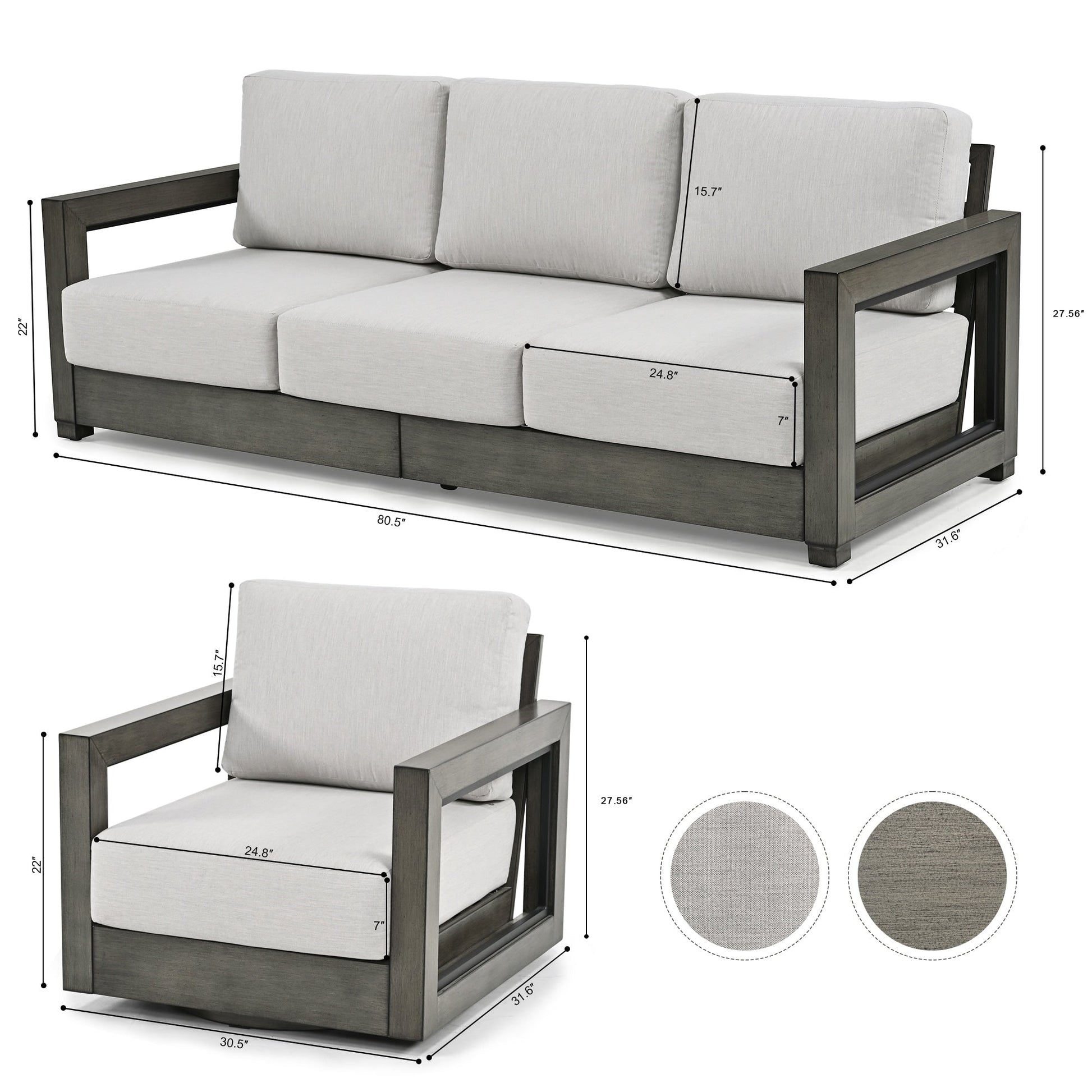 Introducing our exquisite Patio Conversation Set, the epitome of luxury and sophistication for your outdoor space. The high-quality aluminum frame ensures that the furniture is rust, water, and UV resistant, and the 7-inch-thick cushions provide a plush seating experience that is perfect for outdoor use. Each piece is meticulously brushed, creating a stunning visual appeal that enhances the overall aesthetics of your outdoor space. Don't miss the opportunity to elevate your outdoor experience. Order now and treat yourself to the epitome of outdoor luxury. PREMIUM AND STURDY - Our set boasts a wide-size aluminum frame that exudes elegance and durability. The high-quality construction ensures that the furniture is rust-resistant, waterproof, and UV-resistant, making it perfect for outdoor use. UNPARALLELED COMFORT - The sofas are designed with armrests and supportive backrests for exceptional comfort and lumbar support; generous 7-inch-thick cushions provide a plush seating experience; and the zipper design of the cushions makes them easy to clean and maintain. HAND-PAINTED FINISH - The hand-painted finish on the frame adds a touch of refinement and texture to our patio conversation set. Each piece is meticulously brushed, creating a stunning visual appeal that enhances the overall aesthetic of your outdoor space. PLEASE NOTE - Due to the hand-painted process, there may be slight variations in color under different lighting conditions. We have made every effort to accurately represent the colors in the product images, but please refer to the actual items received for accurate color representation. EASY ASSEMBLY - We provide detailed assembly instructions, and all necessary parts are included in the package. You can scan the QR code on the manual to get the installation video for reference. EXCELLENT SERVICE - You can rest assured with our packaging and service. This set is carefully packaged in 5 boxes, if you have any questions or need assistance our dedicated team is here to provide you with exceptional customer service.360-DEGREE SWIVEL - Our single chairs are designed to provide you with maximum flexibility. With a smooth 360-degree swivel feature, you can easily turn and face any direction, allowing for effortless conversation and interaction with your family and friends.