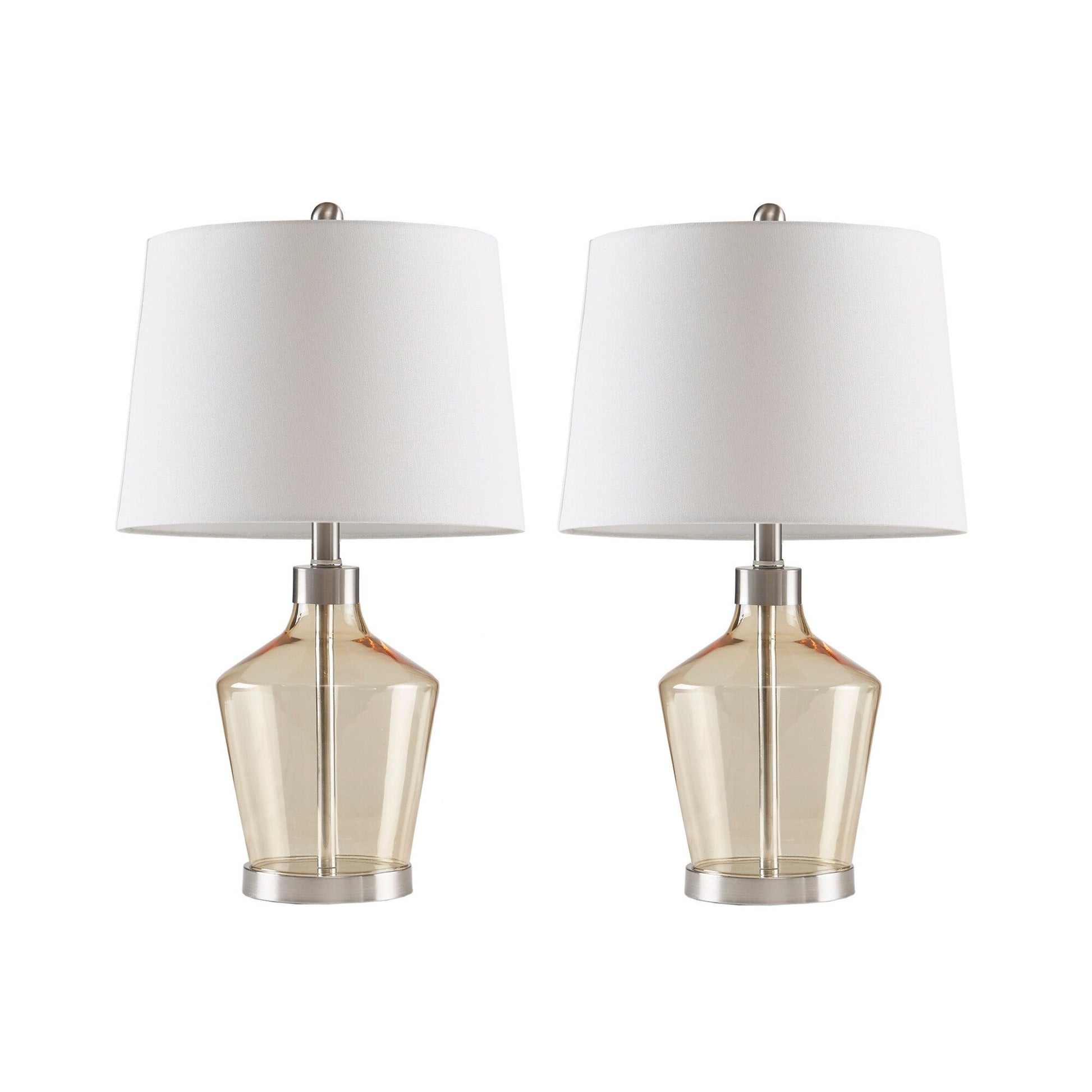 Update your living room or bedroom with the sleek style of the 510 Design Harmony Angular Glass Table Lamp, Set of 2. Beautifully designed, this glass table lamp flaunts a bold grey hue that adds a soft touch of color to your room. The white tapered drum-shaped lamp shade tastefully accents the base, while softly filtering the light to give off a warm glow. Comes with a 2-year warranty.