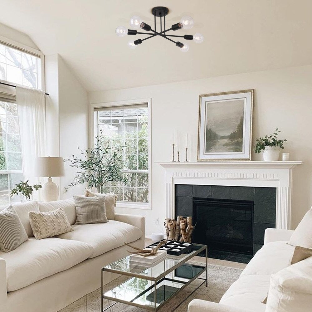 Elevate your interior design with this stunning 6-light modern metal black sputnik semi-flush mount ceiling light. The sputnik silhouette adds a contemporary touch to any room. Made from durable metal with a sleek black finish, it accommodates six E26 base bulbs (not included) to provide ample lighting. Dimmable and compatible with LED, incandescent, and halogen light bulbs. Ideal for indoor use in dry locations.