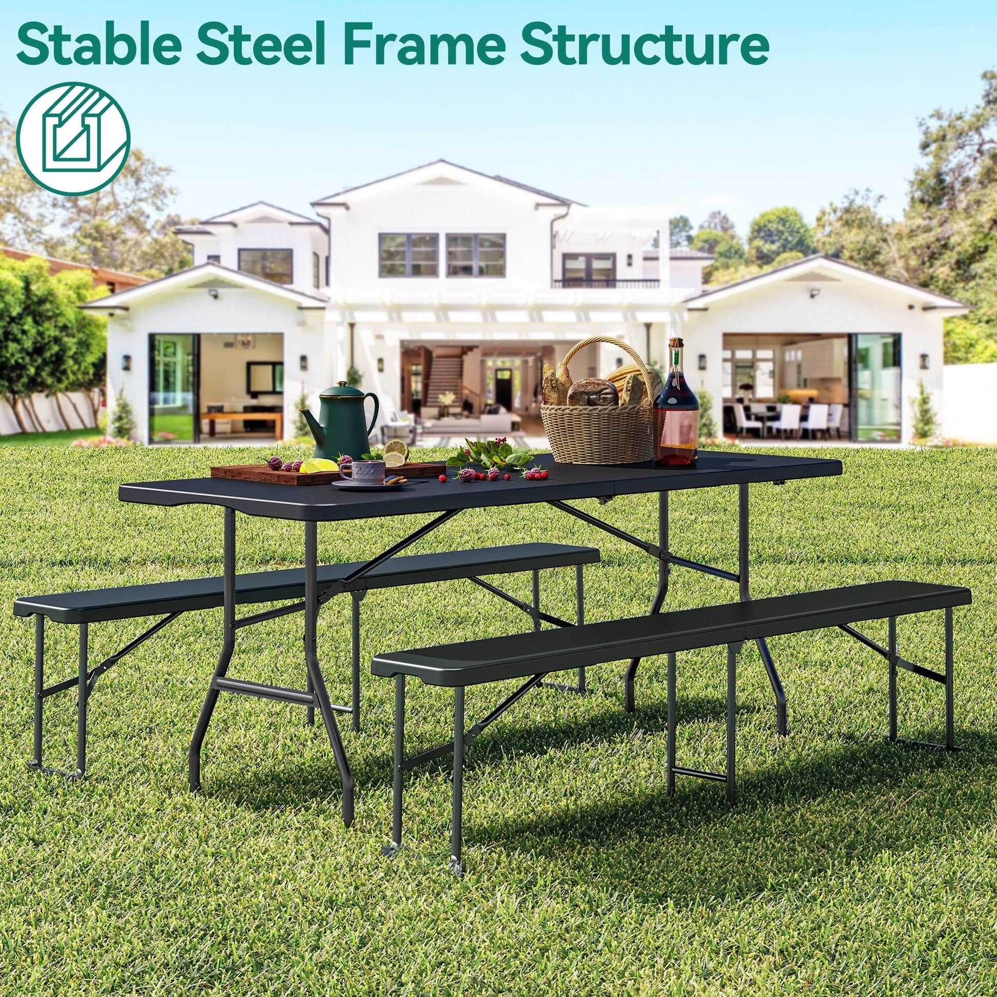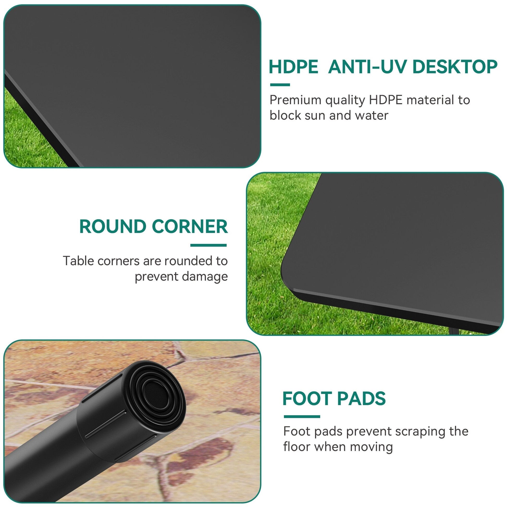 This dining set is a perfect solution for your outdoor space due to its decent price, durability, and large load capacity. With a 6ft length, our picnic dining set provides up to 8-person load capacity, making your whole family gathering outdoors workable. Powered-coating metal frame avoids rust during outdoor use, and high-density polyethylene tops bring anti-abrasion, waterproof, and UV-resistant performance. The non-porous table and bench tops make them easy to maintain: only wipe with a damp cloth. Benches and one table are individual which allows your outdoor rearrangement and adjustment easy. All of these make them ideal pieces for any of your weather and location.
