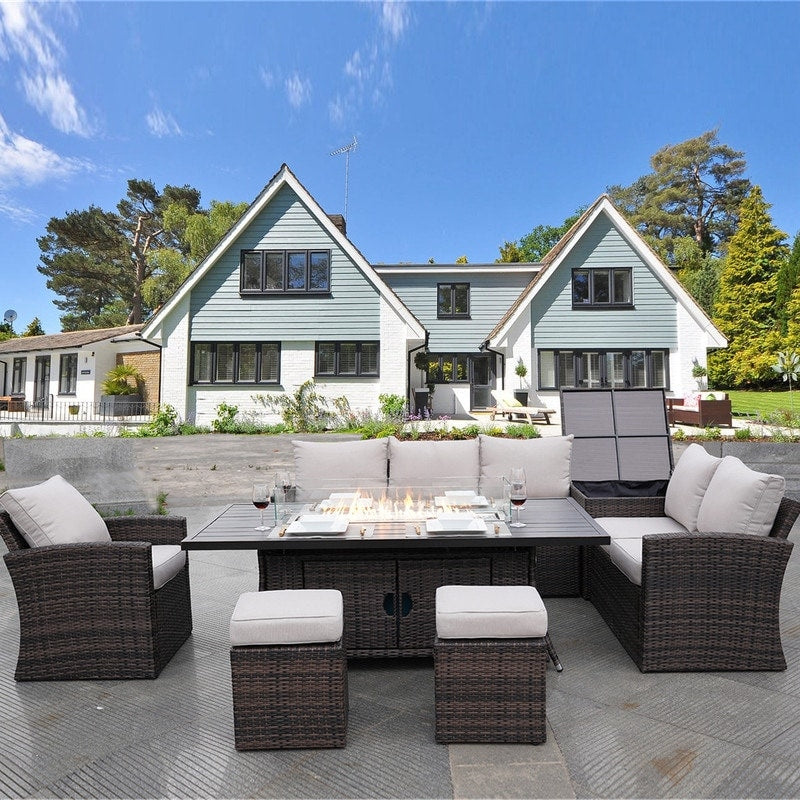 Relax and entertain in style with our 7-Piece Patio Conversational Sofa Set with Aluminium Firepit Table. This set is perfect for spending quality time with family and friends in your backyard. The firepit table serves as a beautiful centrepiece and is practical as well. Unlike other firepit tables, our table features a painted aluminum plate top that won't break during transportation or use, ensuring a longer lifespan. The seat frames are made of water and UV-resistant aluminum for durability, and the cushions are removable and washable for easy maintenance. Choose between grey or brown wicker with beige cushions to match your outdoor decor.