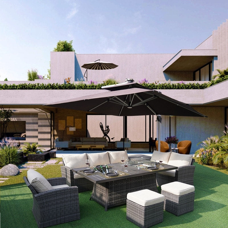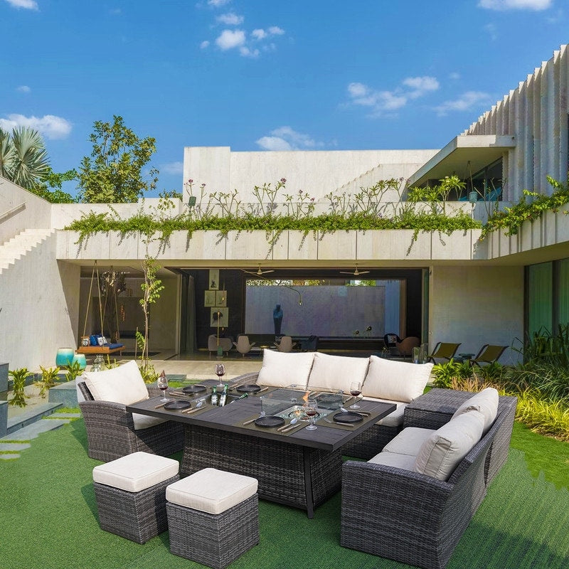 7-Piece Patio Sofa Set with Firepit and Ice Container Dining Table