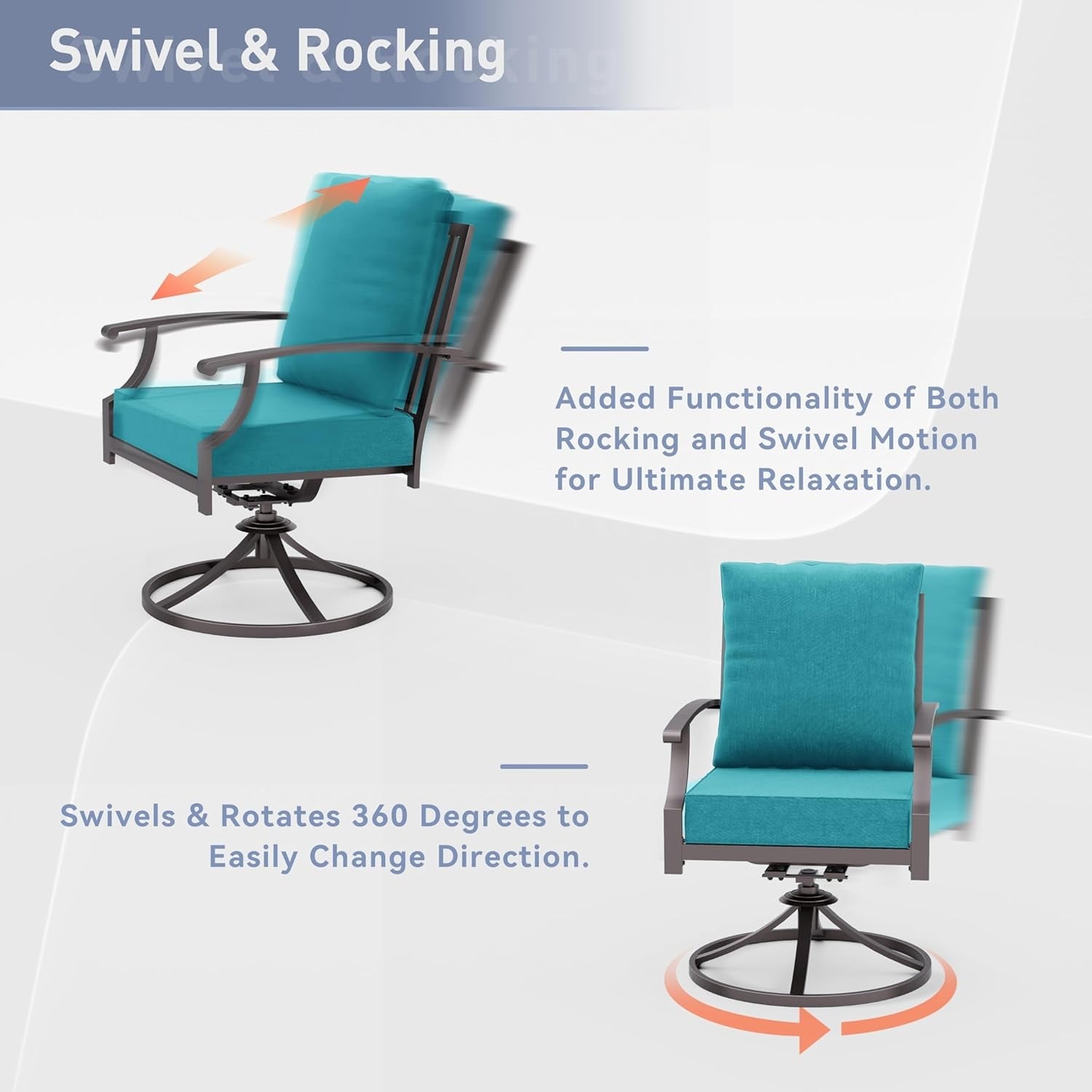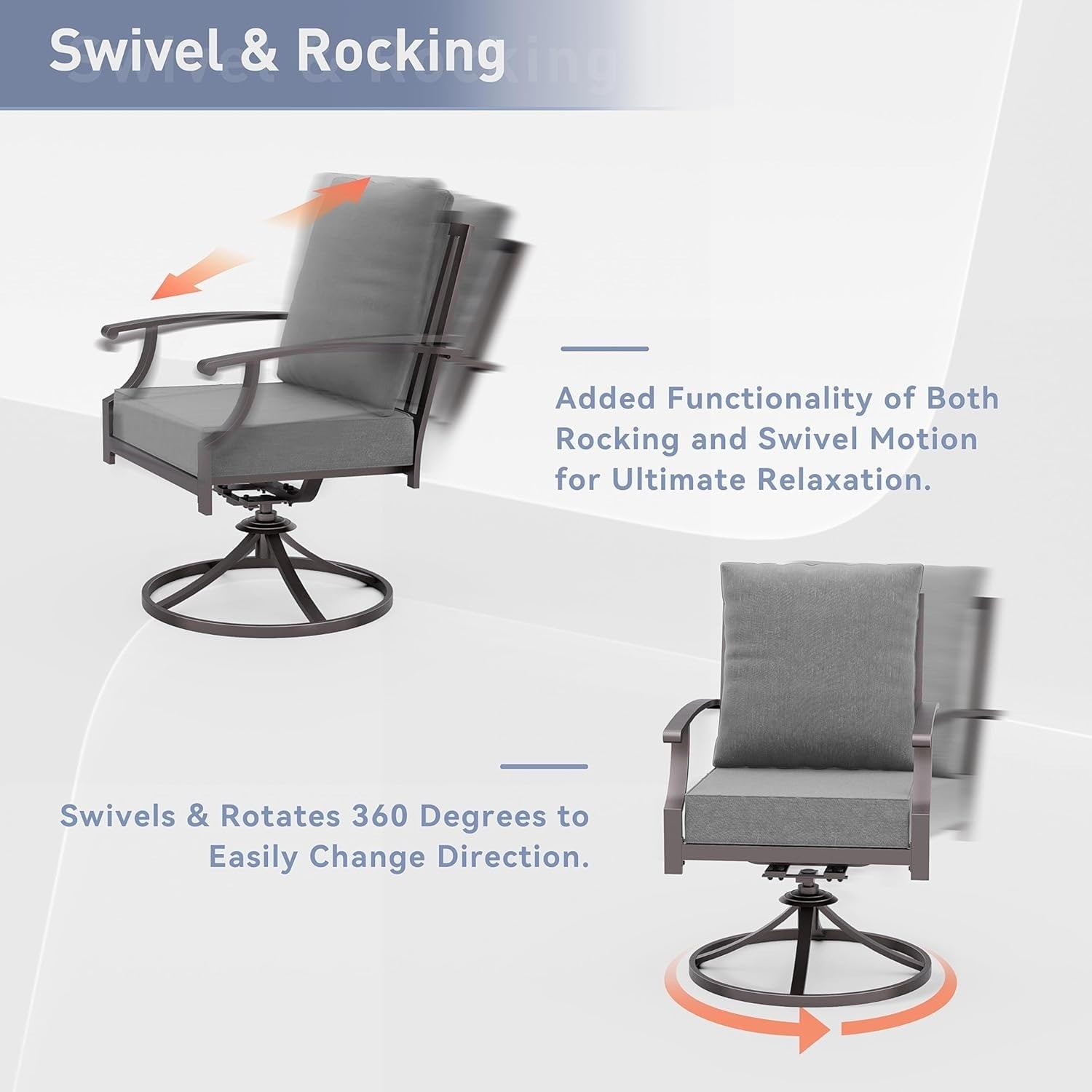 Featuring chairs with a gentle rocking motion, these steel-framed seats support up to 350 lbs and are crafted with rust-resistant materials to withstand outdoor elements. Indulge in the ergonomically curved armrests and 3.4-inch thick seat cushion while enjoying your meal.