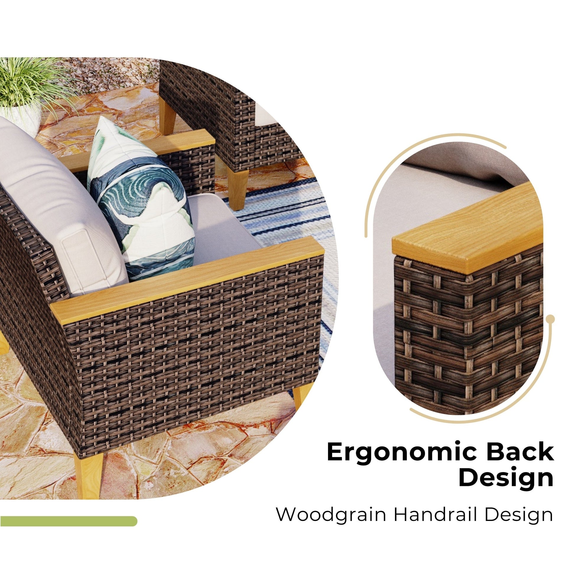 Durable Rattan & Sturdy Frame: This outdoor wicker furniture set is made of high-quality handwoven PE rattan. Additional reinforced ribs on both rattan edges make it more durable and suitable for different weather. Constructed with sturdy metal frame, can effectively improve weight capacity. Note: Pillows and other decorations are not included. Pls check description for more details.