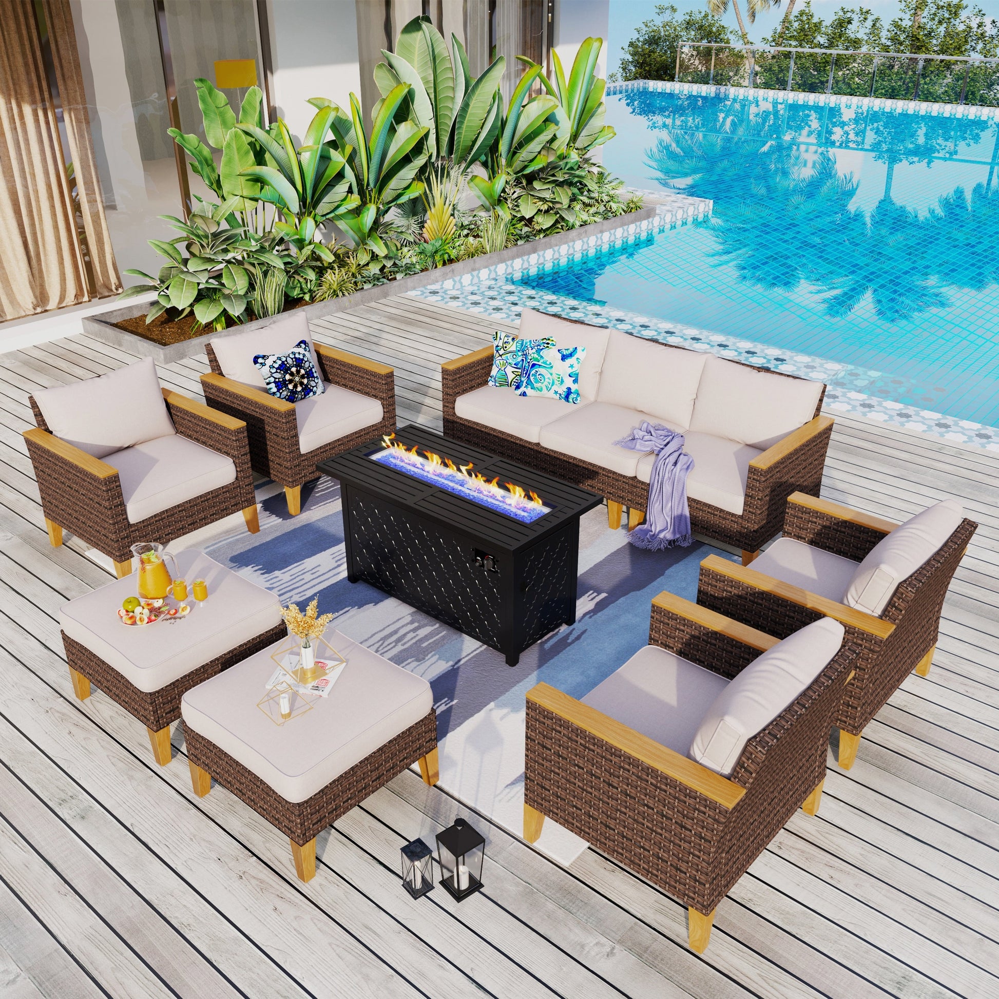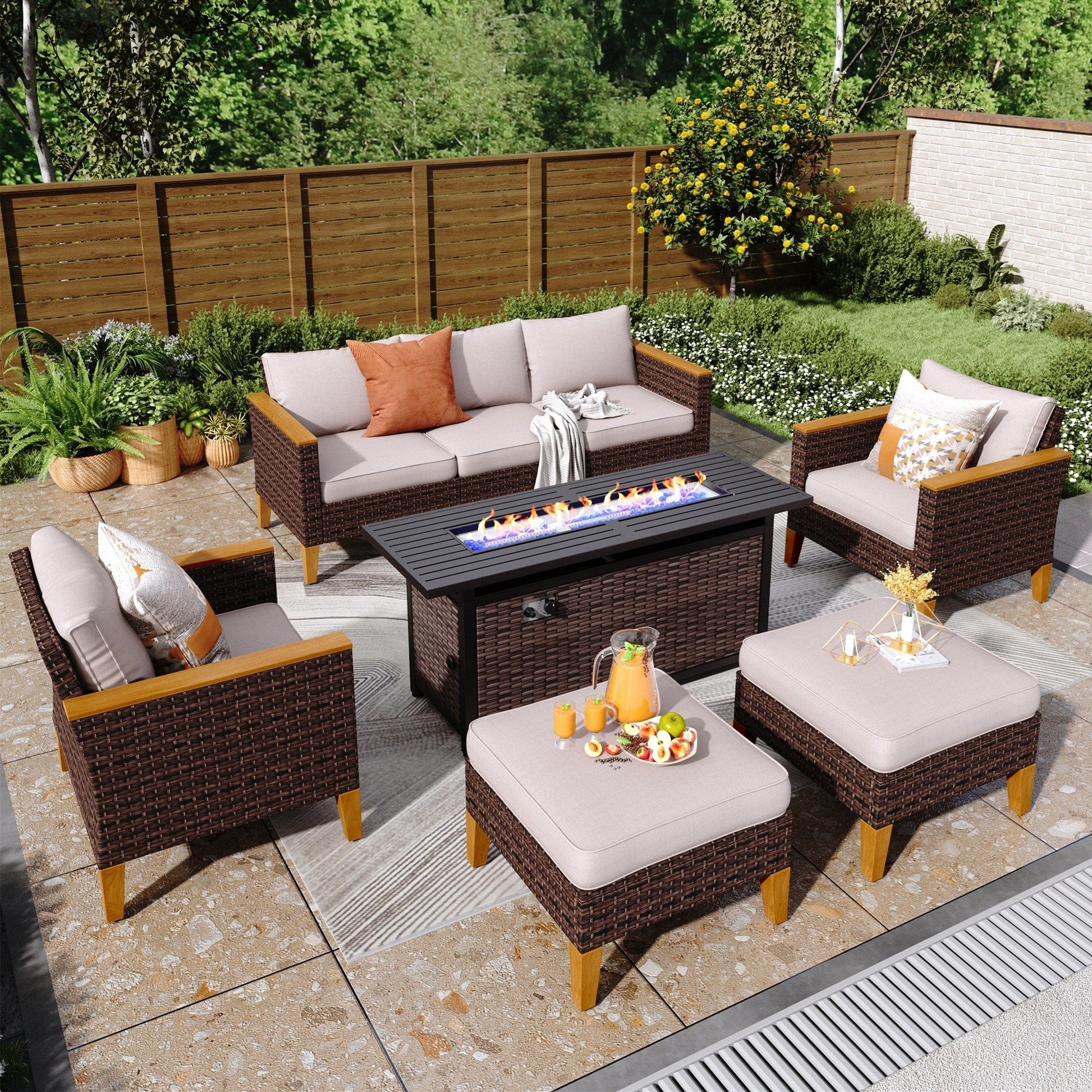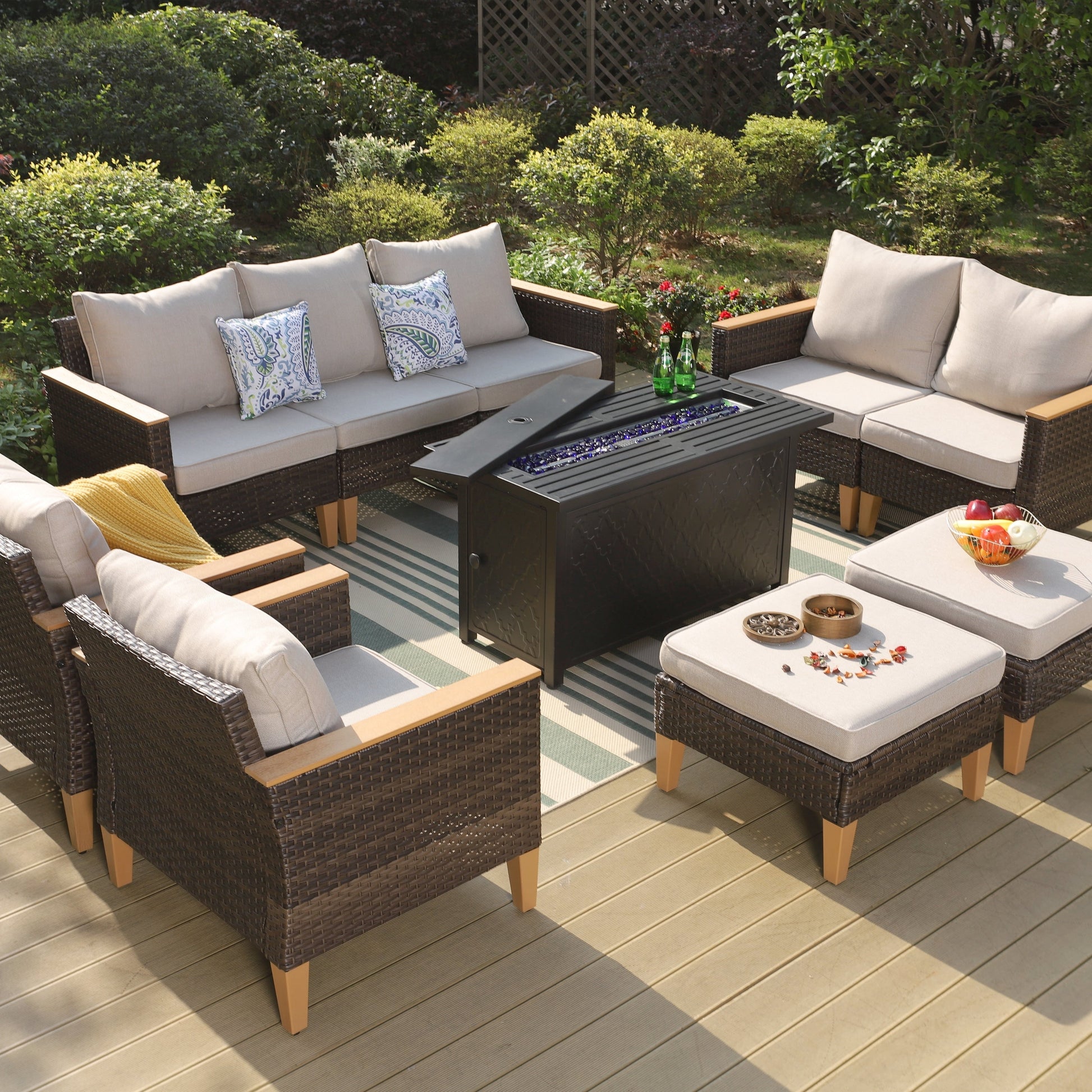 Freely Combined Patio Sectional Sofa Set: This patio furniture set includes 3- seat sofa, 2-seat sofa, armrest single sofa, armless sofa, ottoman, and 45' gas propane fire pit table, allowing you to create your perfect configuration to fit your outdoor space. Perfectly fitting with your garden, courtyard, balcony or poolside to create a comfortable leisure zone or get closer to the beautiful nature with family and friends.