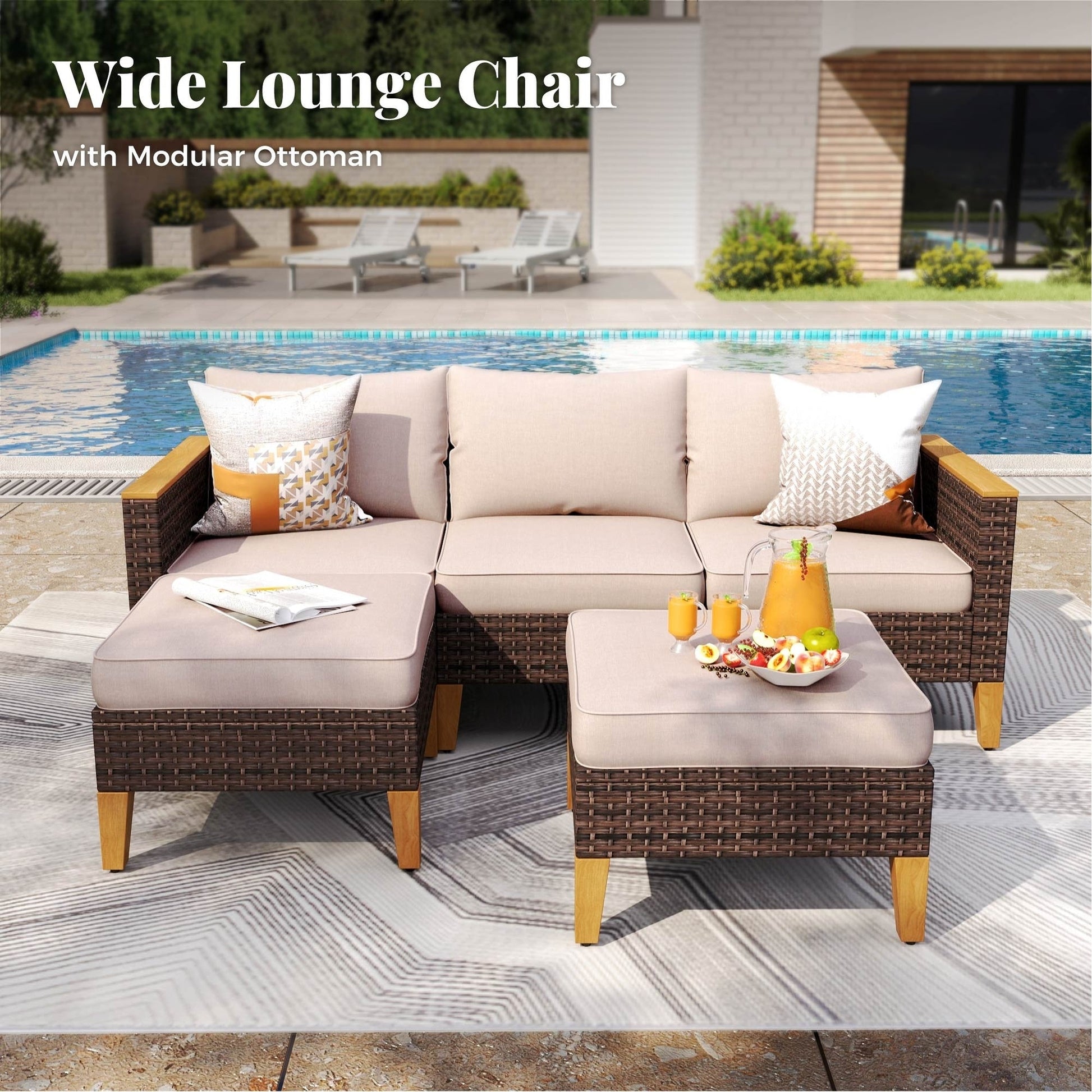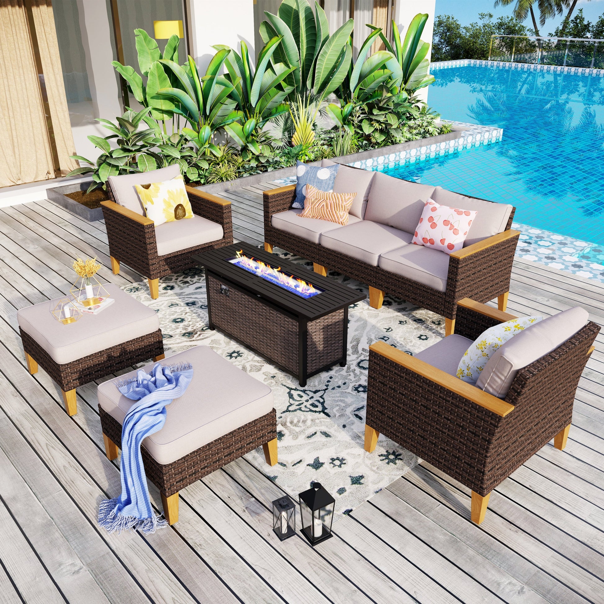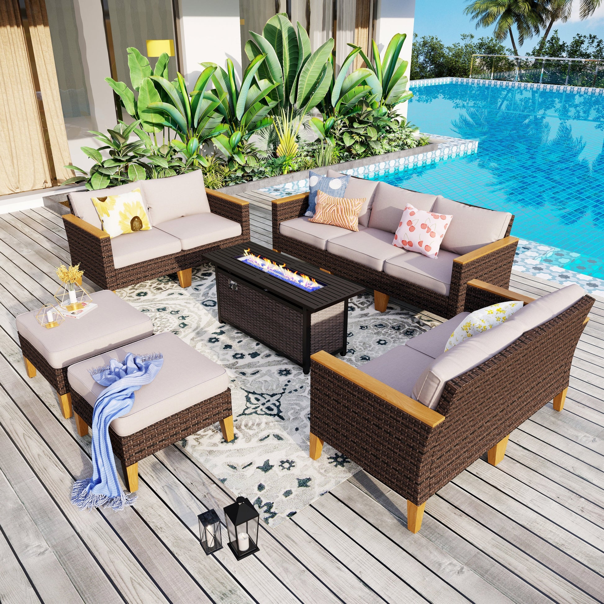 Freely Combined Patio Sectional Sofa Set: This patio furniture set includes 3- seat sofa, 2-seat sofa, armrest single sofa, armless sofa, ottoman, and 45' gas propane fire pit table, allowing you to create your perfect configuration to fit your outdoor space. Perfectly fitting with your garden, courtyard, balcony or poolside to create a comfortable leisure zone or get closer to the beautiful nature with family and friends.