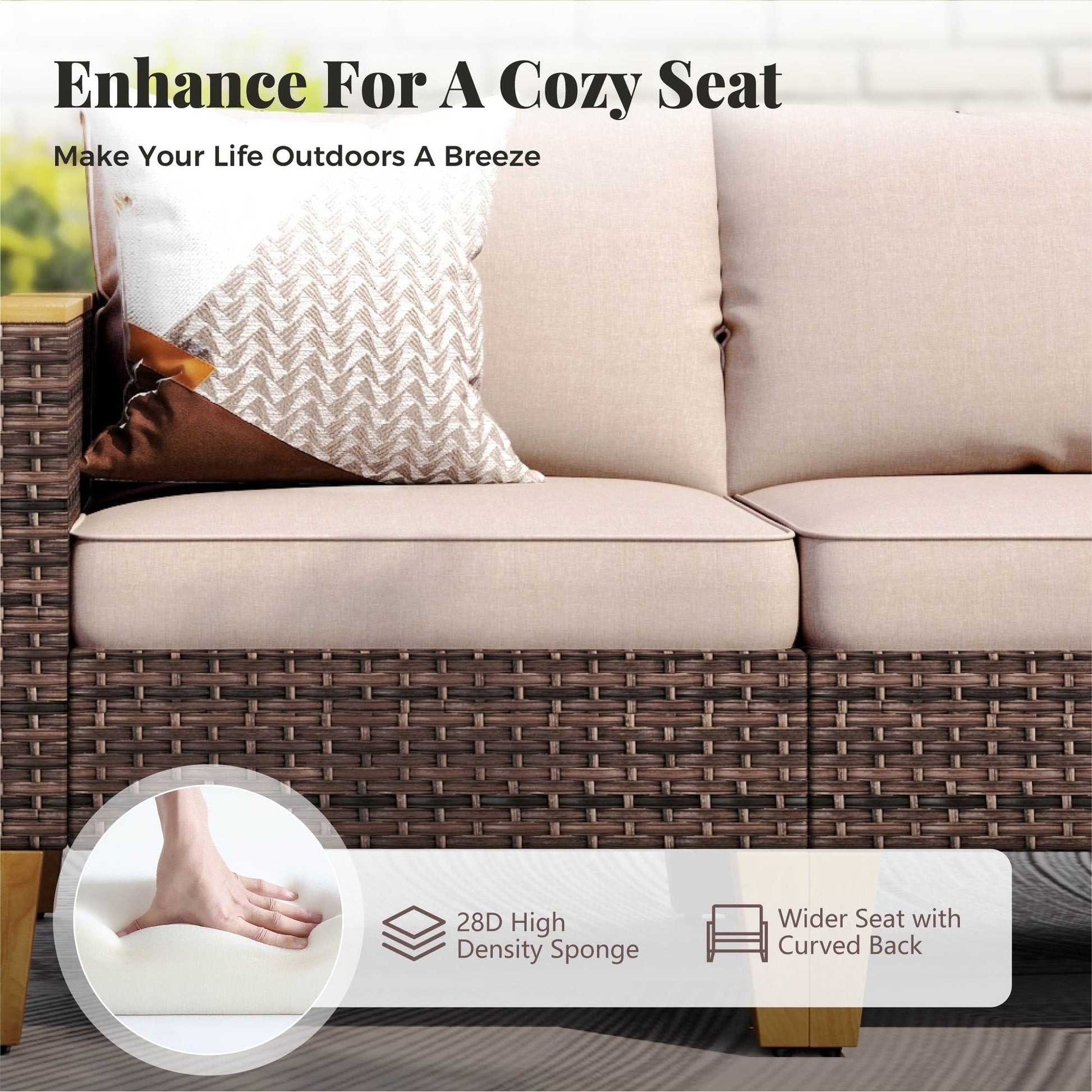 Upgraded Fabrics & Sponge Cushions: All the cushions are crafted from updated waterproof fabric processed by CUSHION PRO technology, ensuring that it will last for years to come. Anti soiling, UV resistant and easy to maintain. Equipped with high density sponge, 4' thick seat cushions would be more comfortable and not easy to deform.