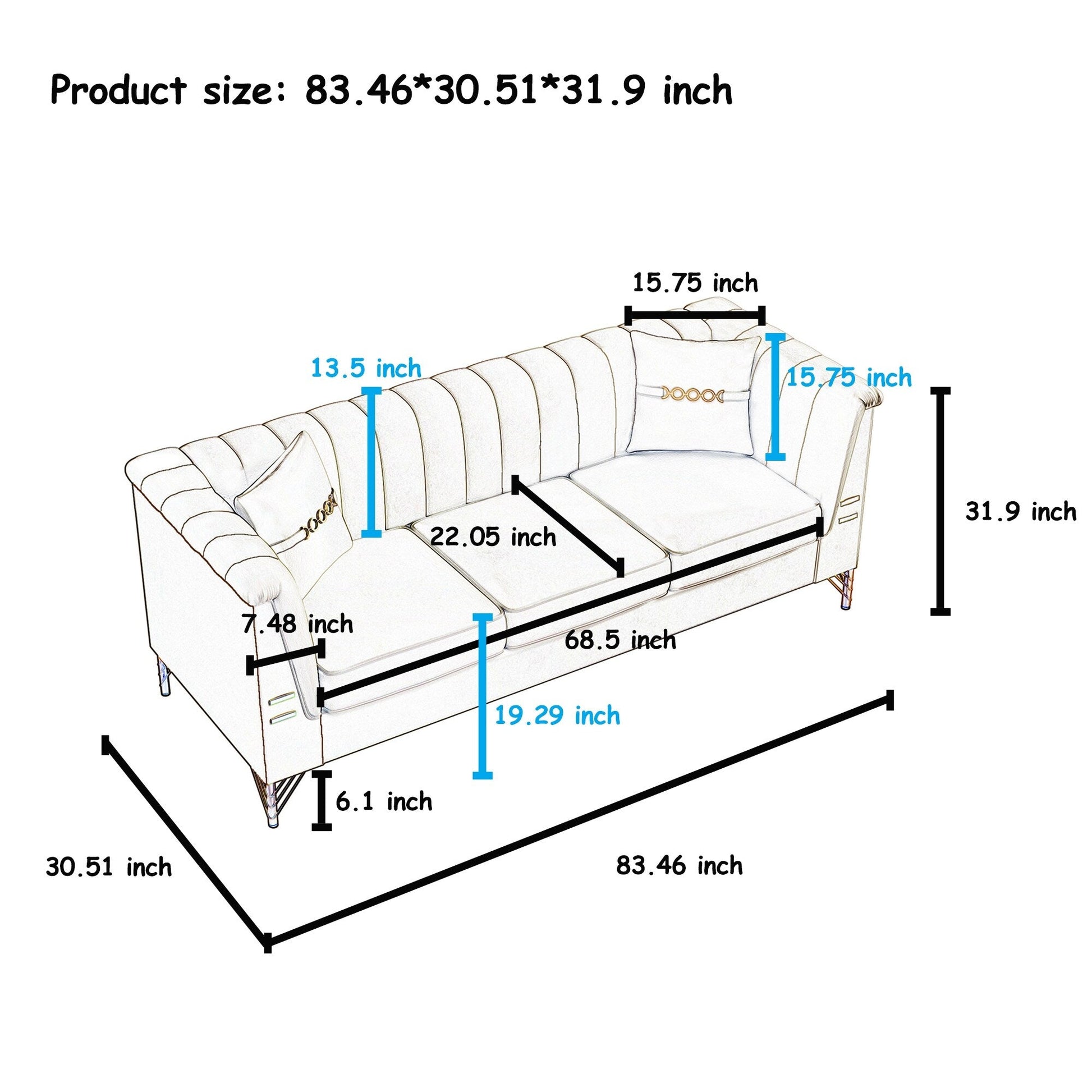 82.67 Modern Velvet 3-Seater Sofa, Vertical Channel Tufted Backrest, Gold Metal Legs, Chesterfield Style