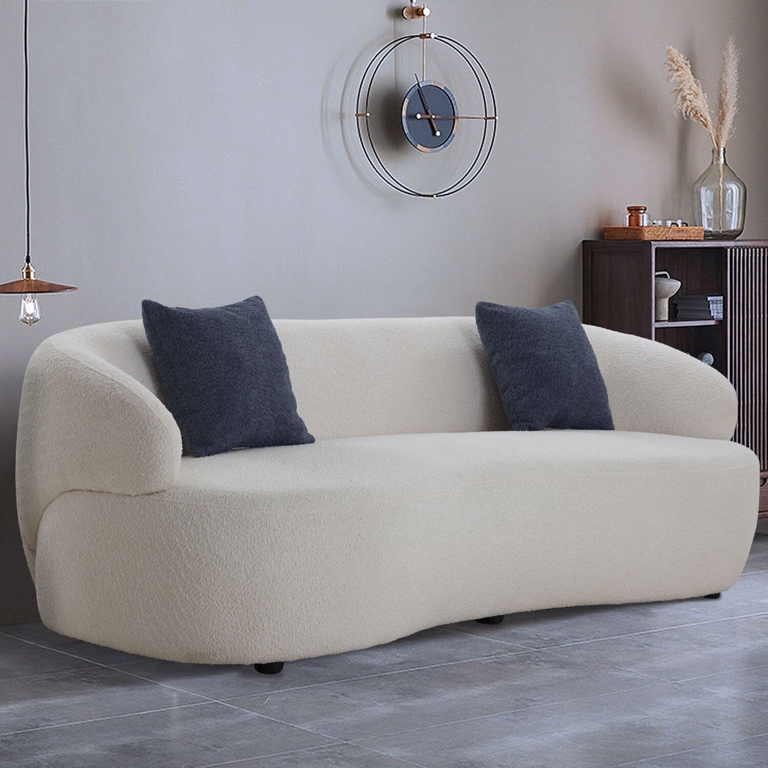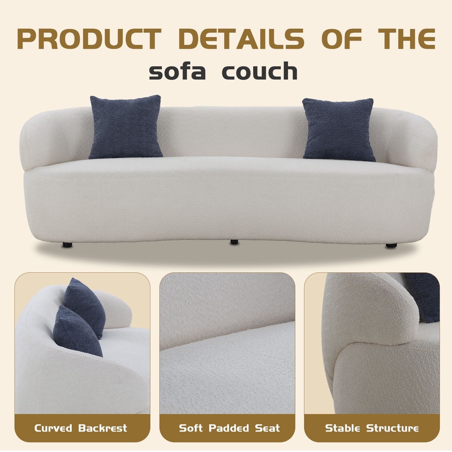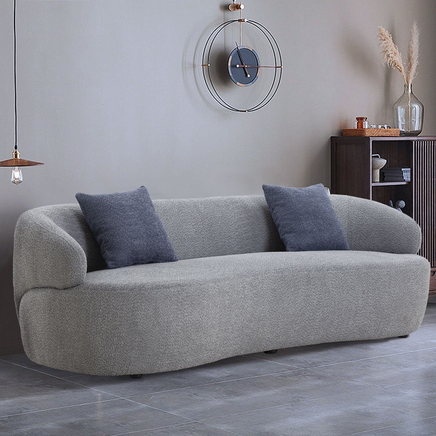 This 3-seater modern upholstered sofa will brighten up your living room. The curved shape of this sofa adds a contemporary touch to a traditional style. Three colorsâbeige, light gray, and blueâof the polyester fabric, which adds a distinctive touch, are available. This curved sofa is ideal for individuals seeking a mid-century design that is simple to match and adds sophistication to their living area. The sofa is moderately firm. A semi-firm sofa is always a wise purchase. It may endure a very long time and offers more support than a soft sofa. One sofa and two matching pillows are included in the package. What's even better? You may save time and hassle since there are no need to assembled.