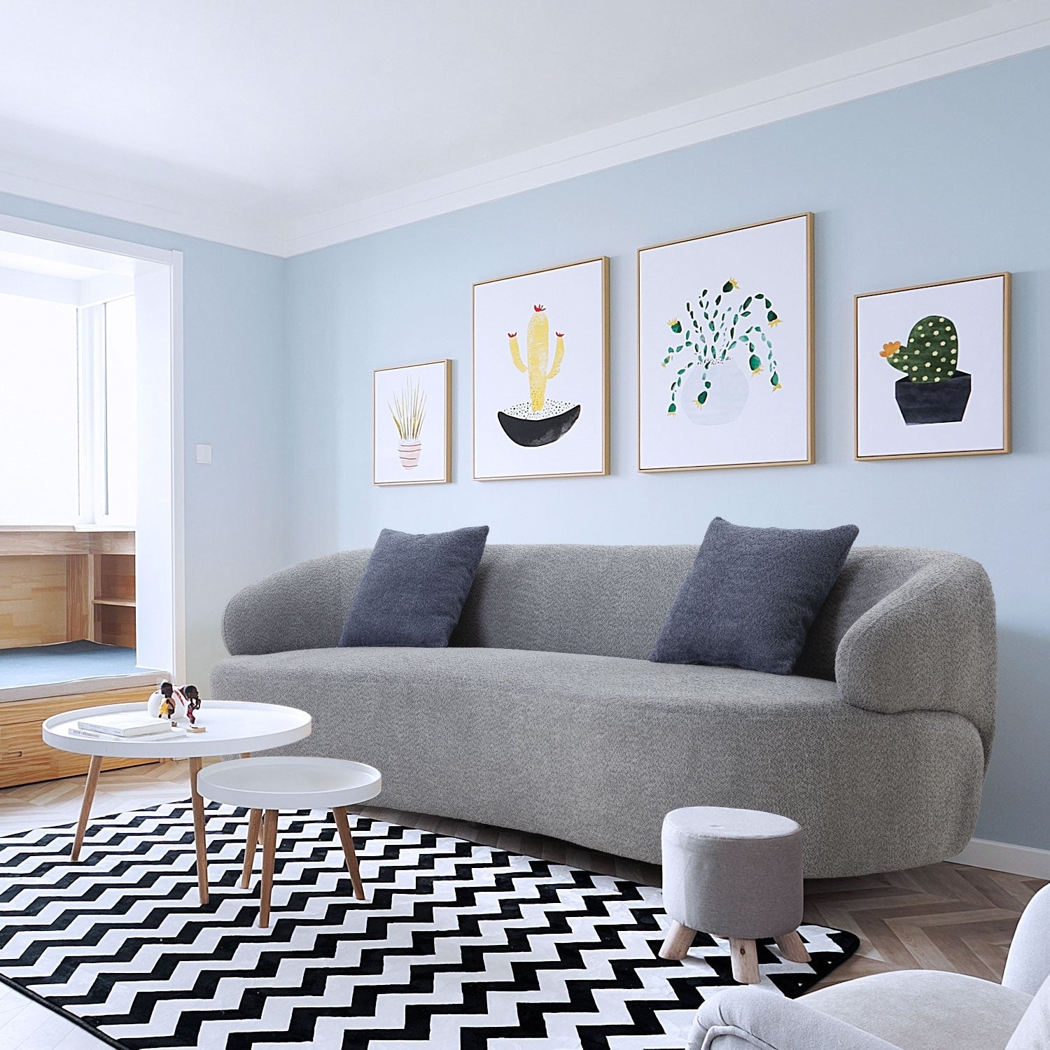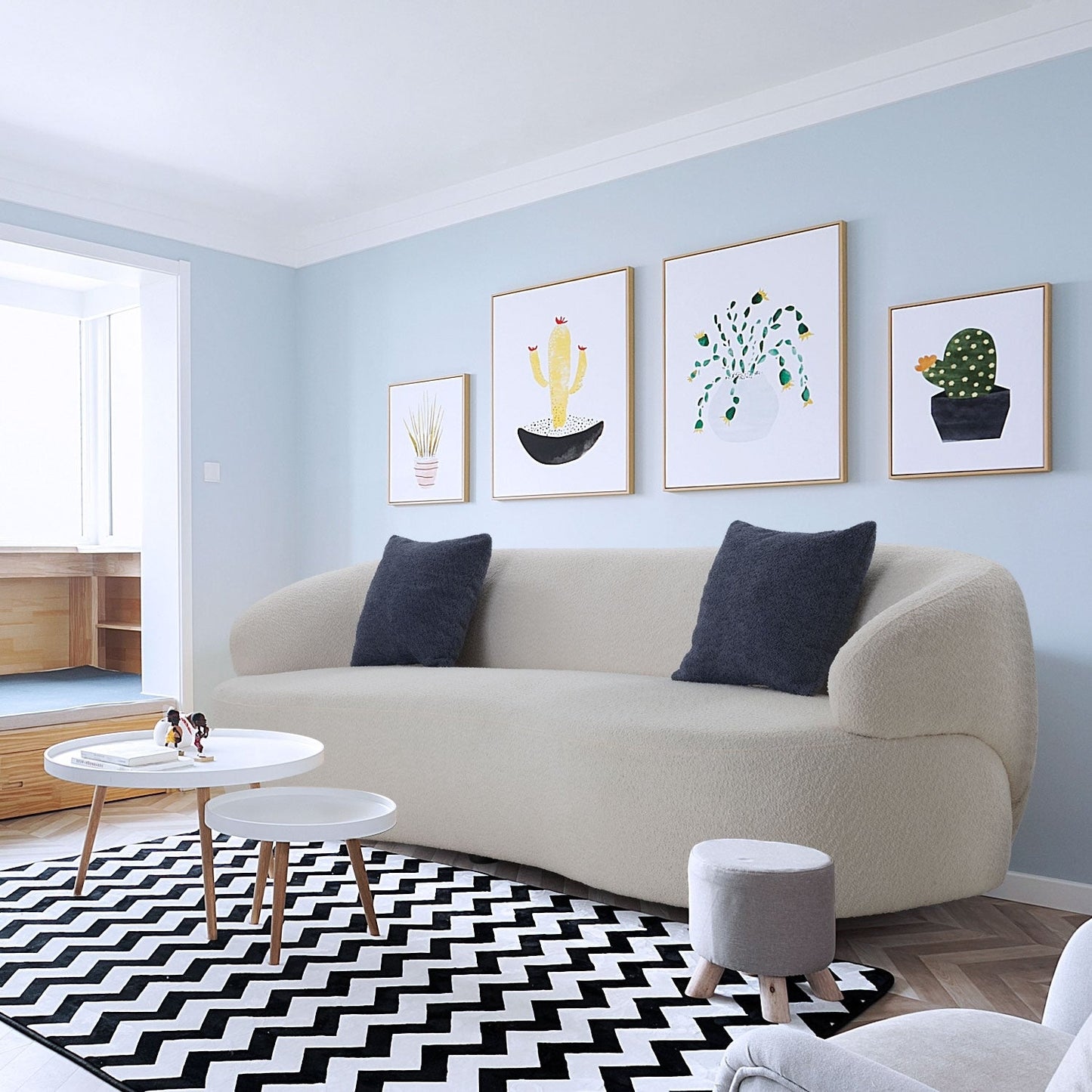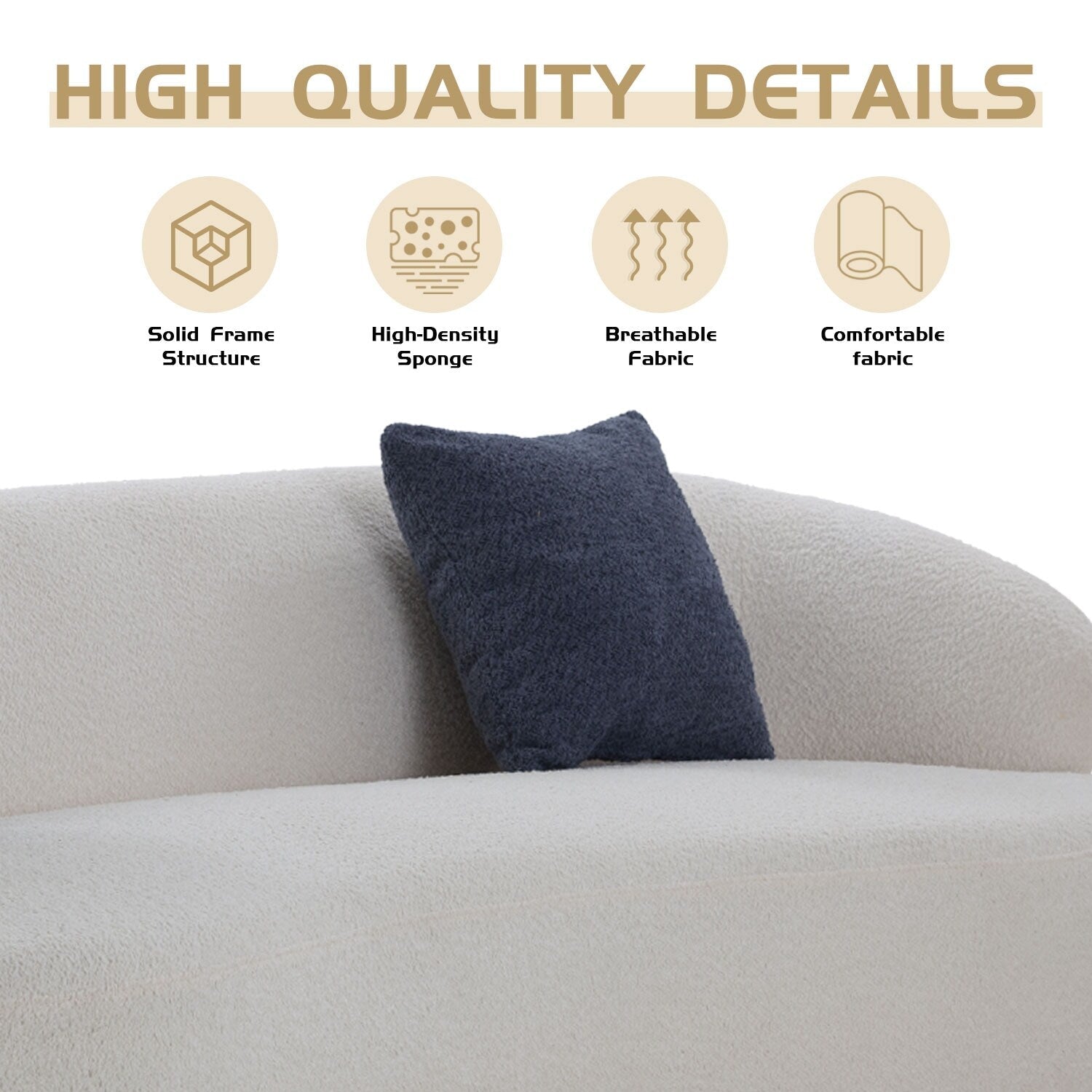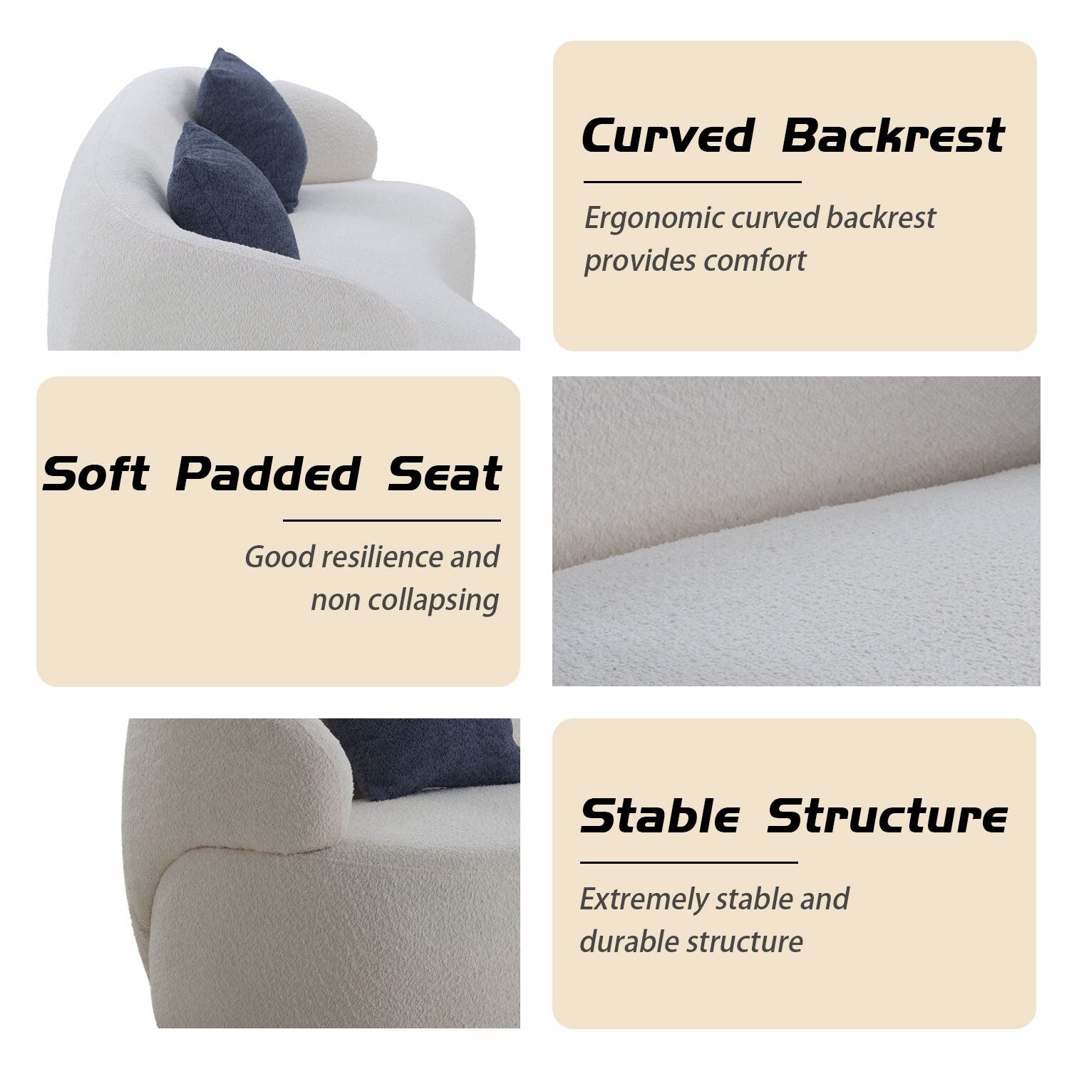This 3-seater modern upholstered sofa will brighten up your living room. The curved shape of this sofa adds a contemporary touch to a traditional style. Three colorsâbeige, light gray, and blueâof the polyester fabric, which adds a distinctive touch, are available. This curved sofa is ideal for individuals seeking a mid-century design that is simple to match and adds sophistication to their living area. The sofa is moderately firm. A semi-firm sofa is always a wise purchase. It may endure a very long time and offers more support than a soft sofa. One sofa and two matching pillows are included in the package. What's even better? You may save time and hassle since there are no need to assembled.