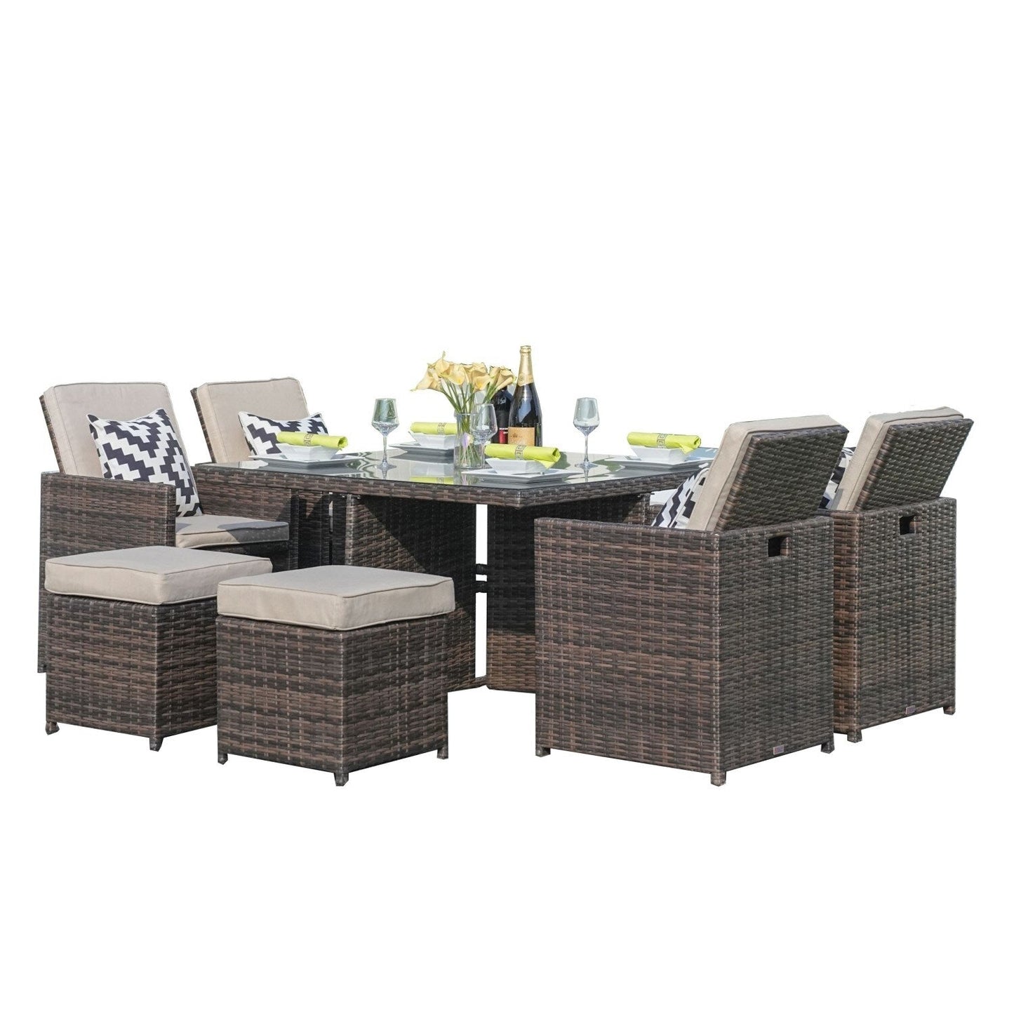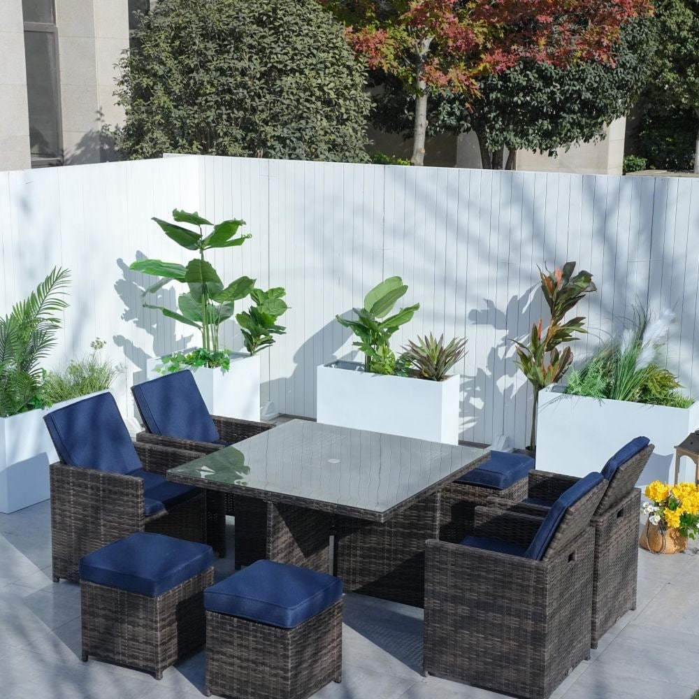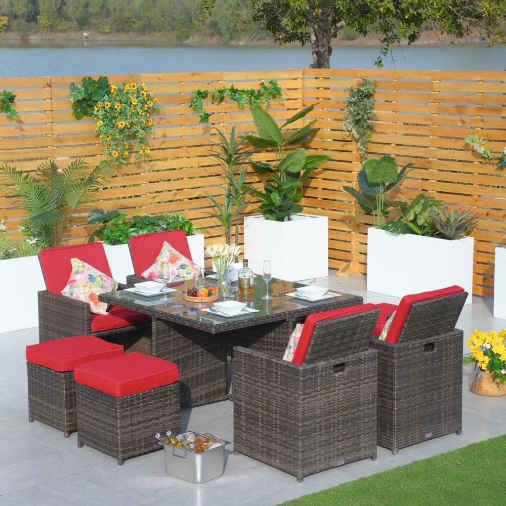 Create a stunning outdoor dining experience with this 9-piece Outdoor Dining Table Set with Cushions. This high-quality dining set comfortably seats up to eight people and features a fully weaved table top and flip-up chair backs for added comfort. The chairs and footstools tuck neatly away under the table when not in use, making it a practical and space-saving addition to your garden. The wicker rattan construction adds a natural, outdoorsy look to your space, while the parasol hole provides shade on sunny days.