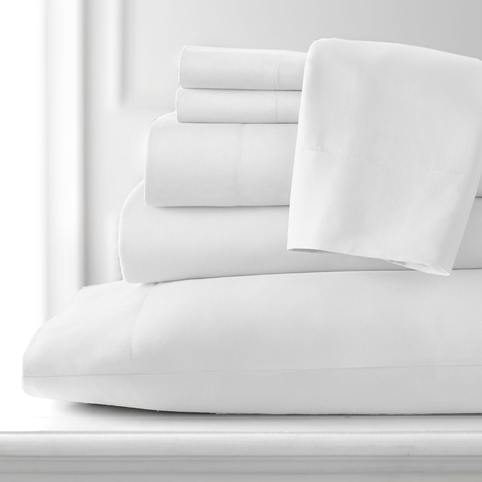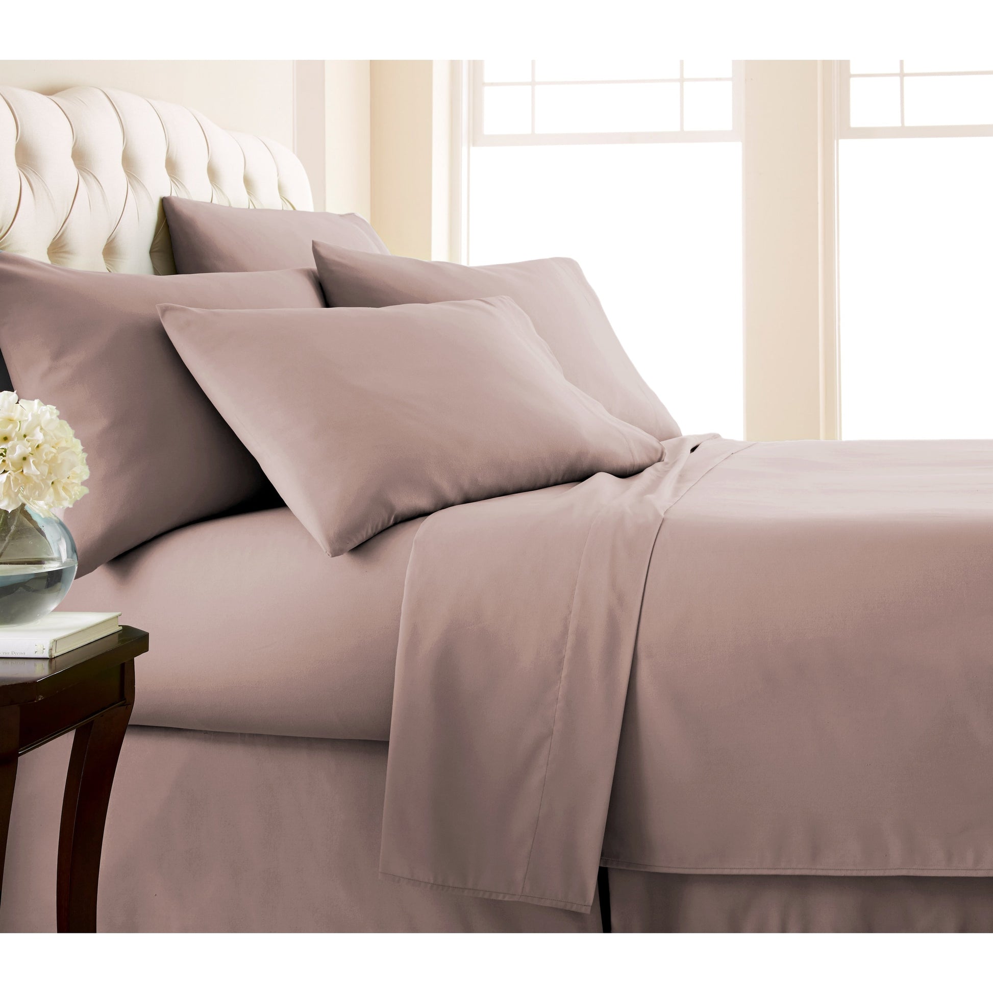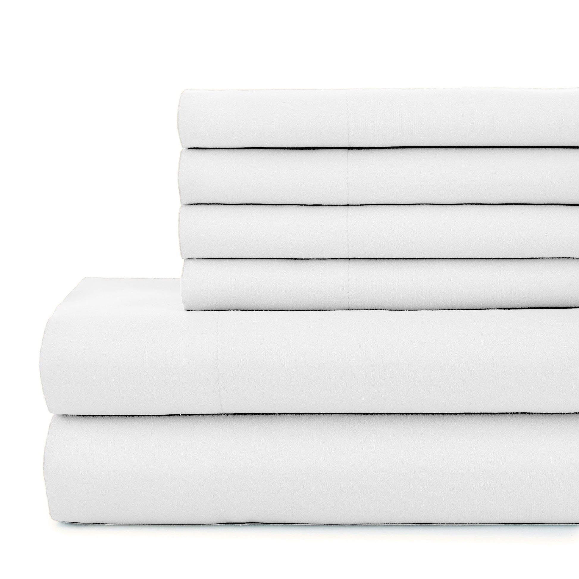 - 7-piece set includes: 1 flat sheet, 2 fully elasticized fitted 16-inch deep pocket sheet, and 4 pillowcases
