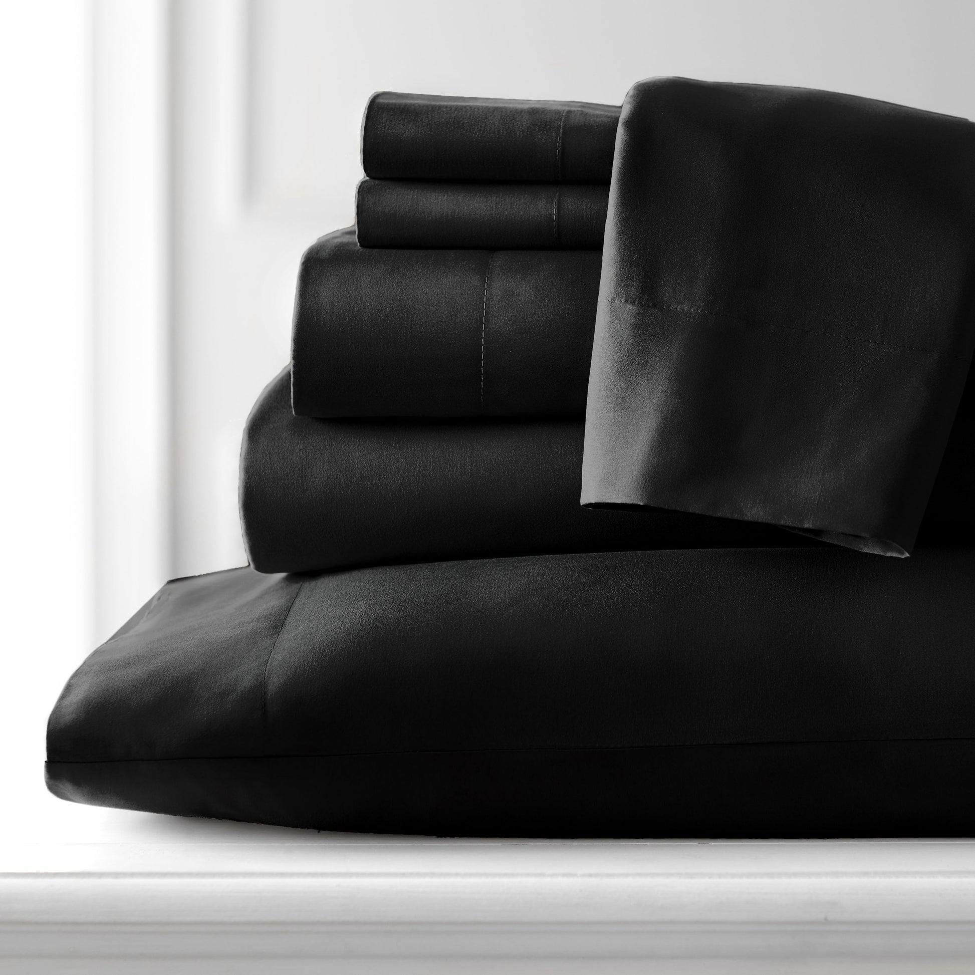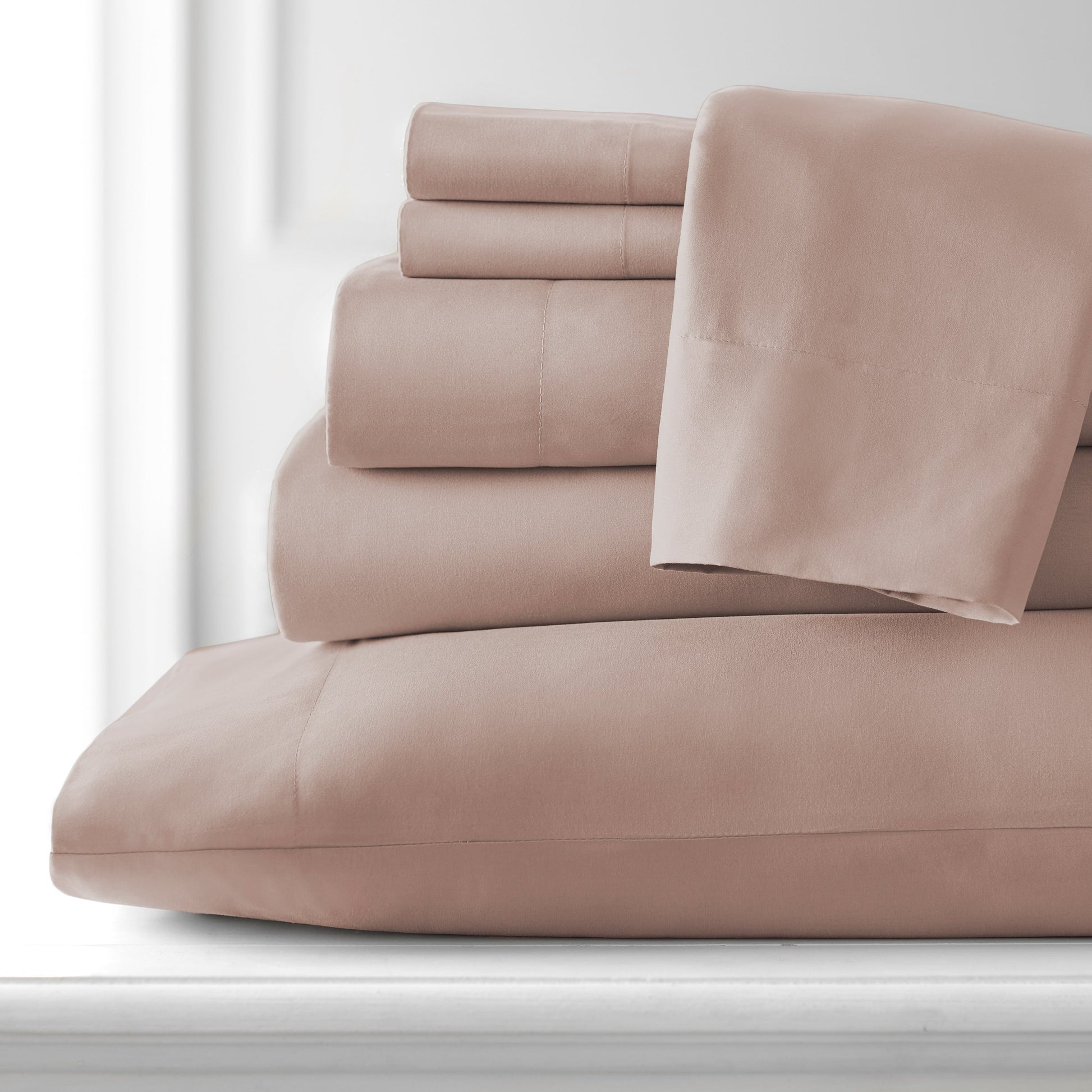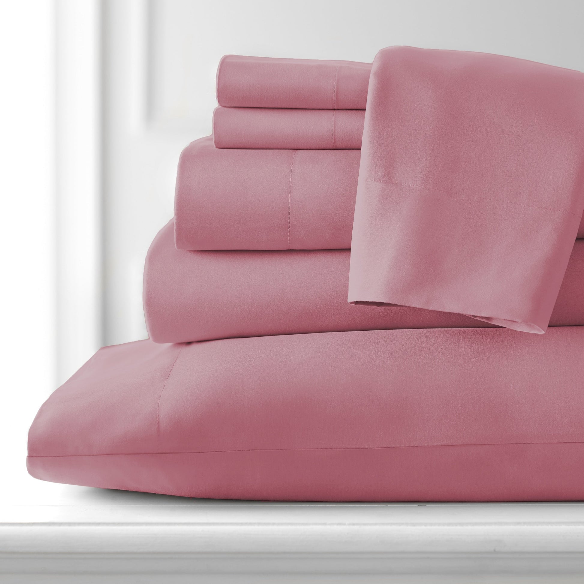 - 7-piece set includes: 1 flat sheet, 2 fully elasticized fitted 16-inch deep pocket sheet, and 4 pillowcases