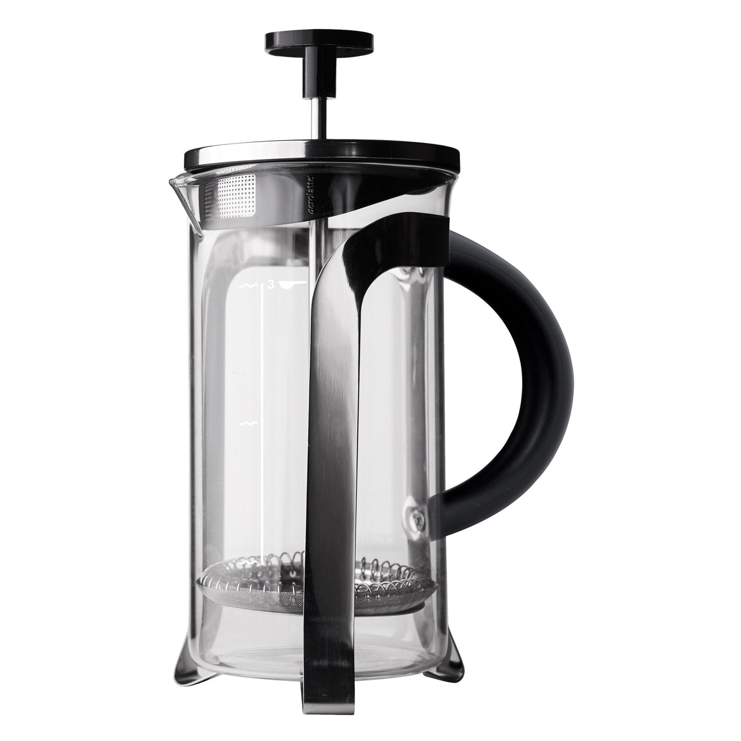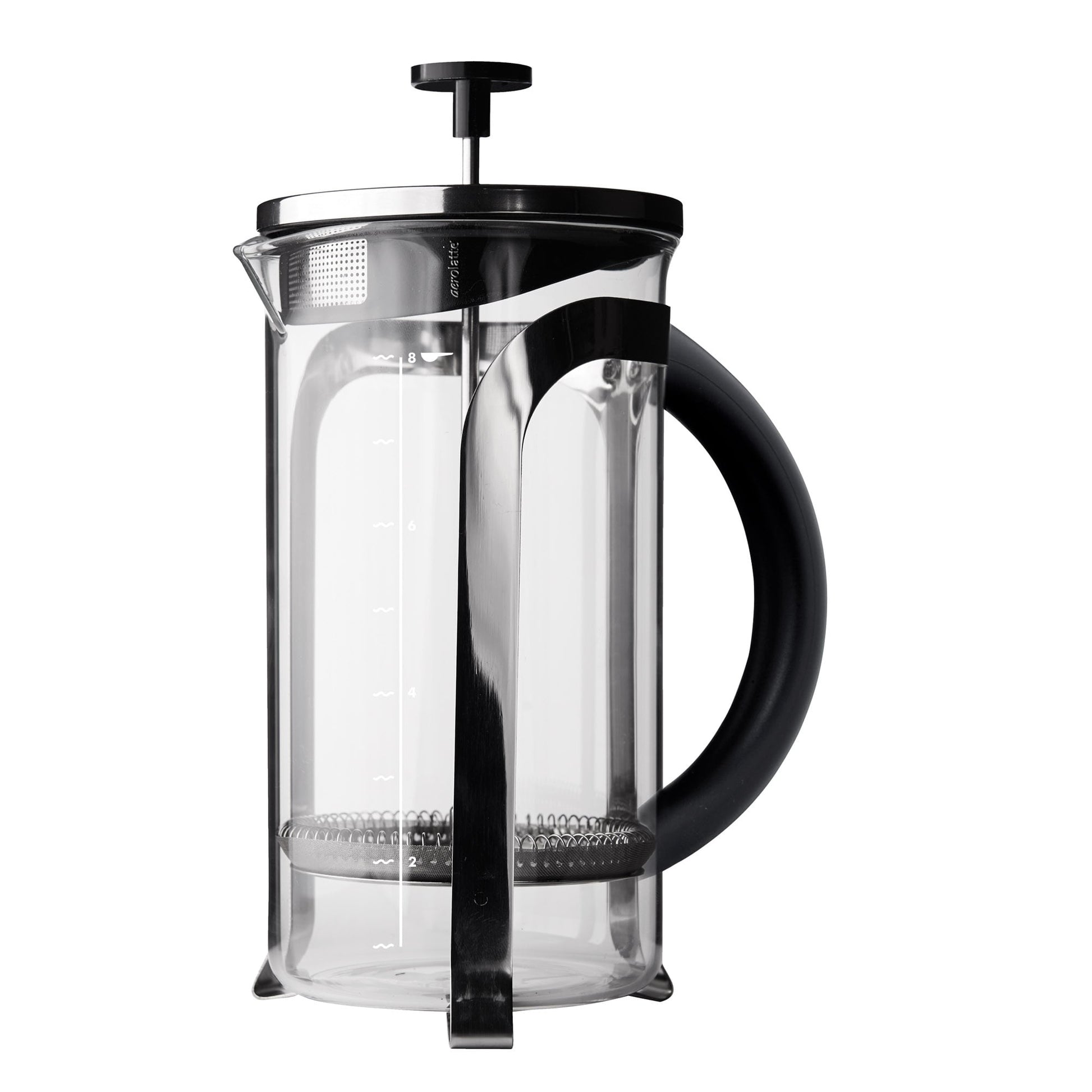 Aerolatte's French Press Coffee Maker allows precise control for making a better brew at home. Perfect for the coffee enthusiast or at-home baristas, it's designed to extract the most flavor from ground coffee and achieve a more flavorful brew without buying expensive machines that hog up precious counter space. Water levels marked on the glass, along with the included coffee scoop, help measure the precise water-to-coffee ratio for the perfect cup every time. Its plunger lid, with a built-in microfilter in the spout, pushes grounds to the bottom of the pot and filters out sediment when pouring fresh-brewed coffee. Simply measure medium-ground coffee directly into the glass (approximately 2 rounded tablespoons per 8-ounces of water, or to desired taste). Pour in a small amount of boiled water, gently stir grounds so they sink, and wait 30 seconds for coffee to 'bloom' in the water so it releases more flavor. After the 30 seconds, pour in the rest of the water. Position the plunger lid inside the pot with the filter just above, and level to, the water line. Allow coffee to brew for 3 to 5 minutes. Once coffee is brewed, slowly plunge the grounds (about 20 seconds) to the bottom of the pot. Grounds will continue to brew at the bottom of the pot and make coffee even stronger. Be sure to pour and enjoy coffee immediately. Made from high borosilicate glass and stainless steel, Aerolatte's French Press Coffee Maker is easy to use and clean. The durable glass beaker easily lifts out from the frame for cleaning. All parts are Proposition 65 compliant and dishwasher safe for easy cleanup. Replacement glass beaker (063R) and mesh filter (063WR) are available.