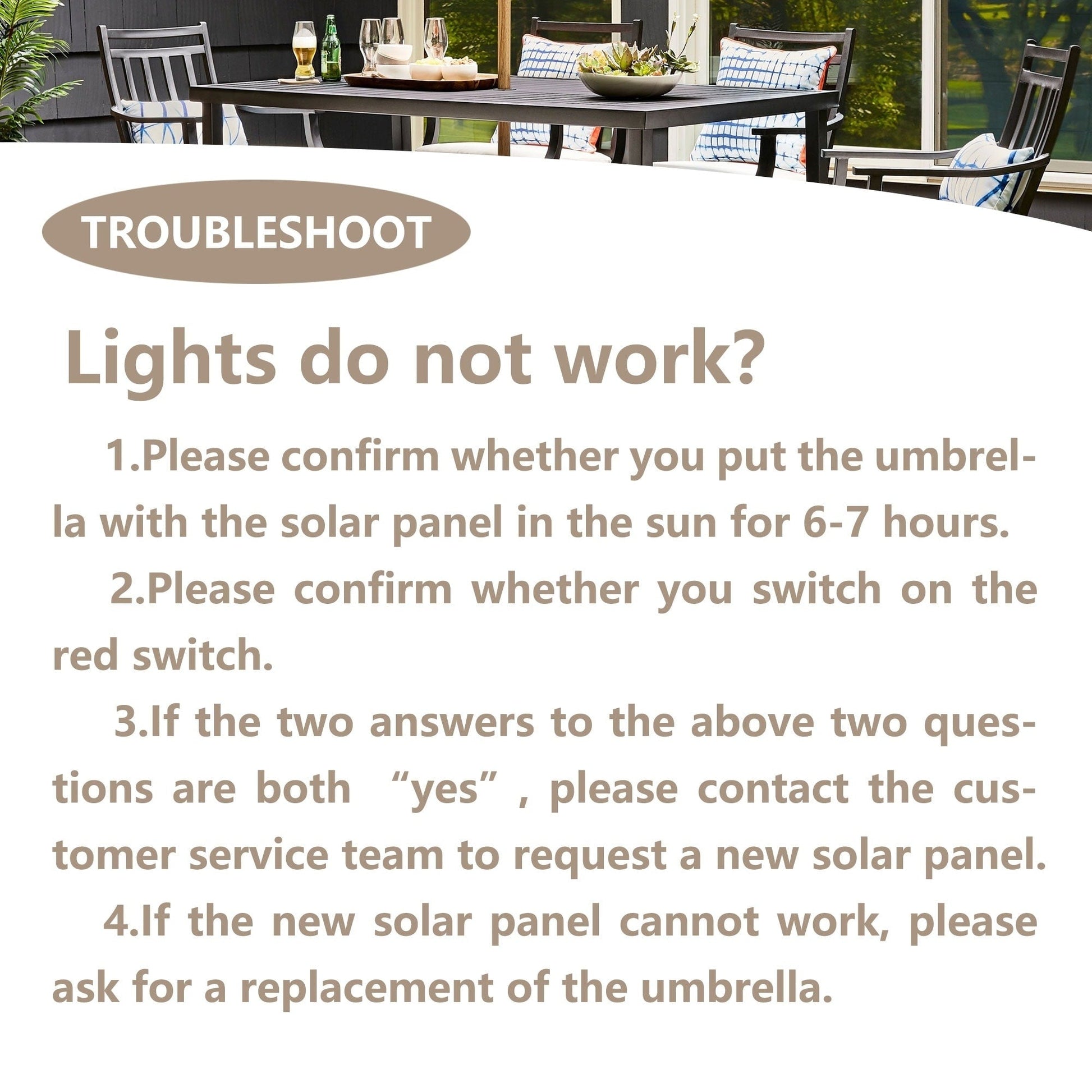 1. Solar panel requires 6-7 hours in the sun to be fully charged. If lights do not work, please fully charge the panel before trying again. There is one switch to control on/off of lights.