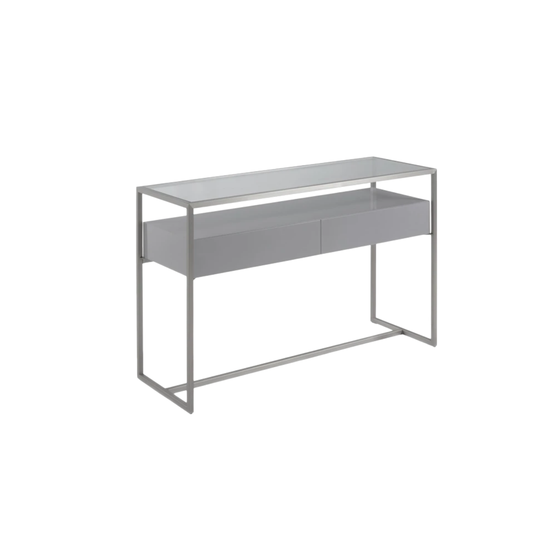[description] La console Alfred est le meuble idéal pour une entrée moderne ou un grand couloir. Son design épuré est assuré par sa structure en acier brossé, son espace de rangement avec deux tiroirs laqués gris foncé mat et son plateau en verre fumé. Son alliance de matériaux et de fonctionnalité la rend unique et s'intègre facilement dans les entrées, les chambres, les salons et les bureaux.