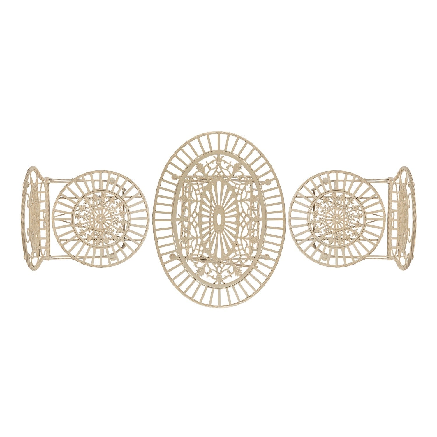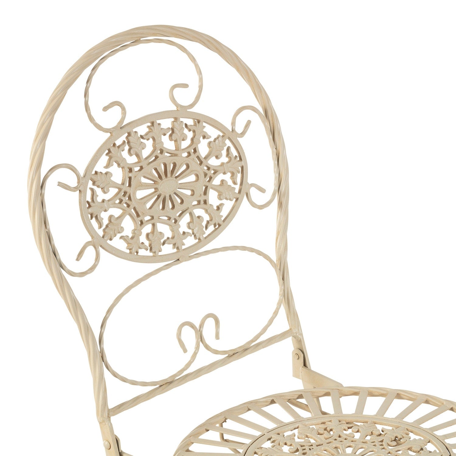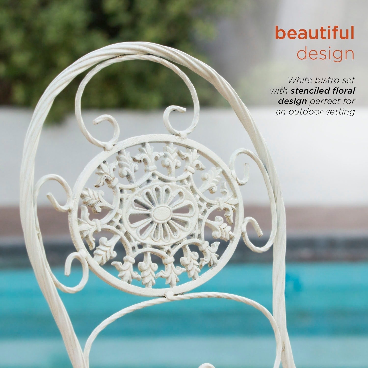 Enhance the charm of your outdoor living area with Alpine Corporation's Indoor/Outdoor 3-Piece Bistro Set. This beautiful set features an antique oval tabletop and two matching chairs with a stenciled floral design that exudes elegance. Made of durable steel and finished in a neutral white, this weather-resistant patio set is perfect for al fresco dining or indoor use. Being lightweight and foldable, it is easy to store and transport, making it an ideal fit for smaller spaces. Cleaning is effortless with mild soap and water.