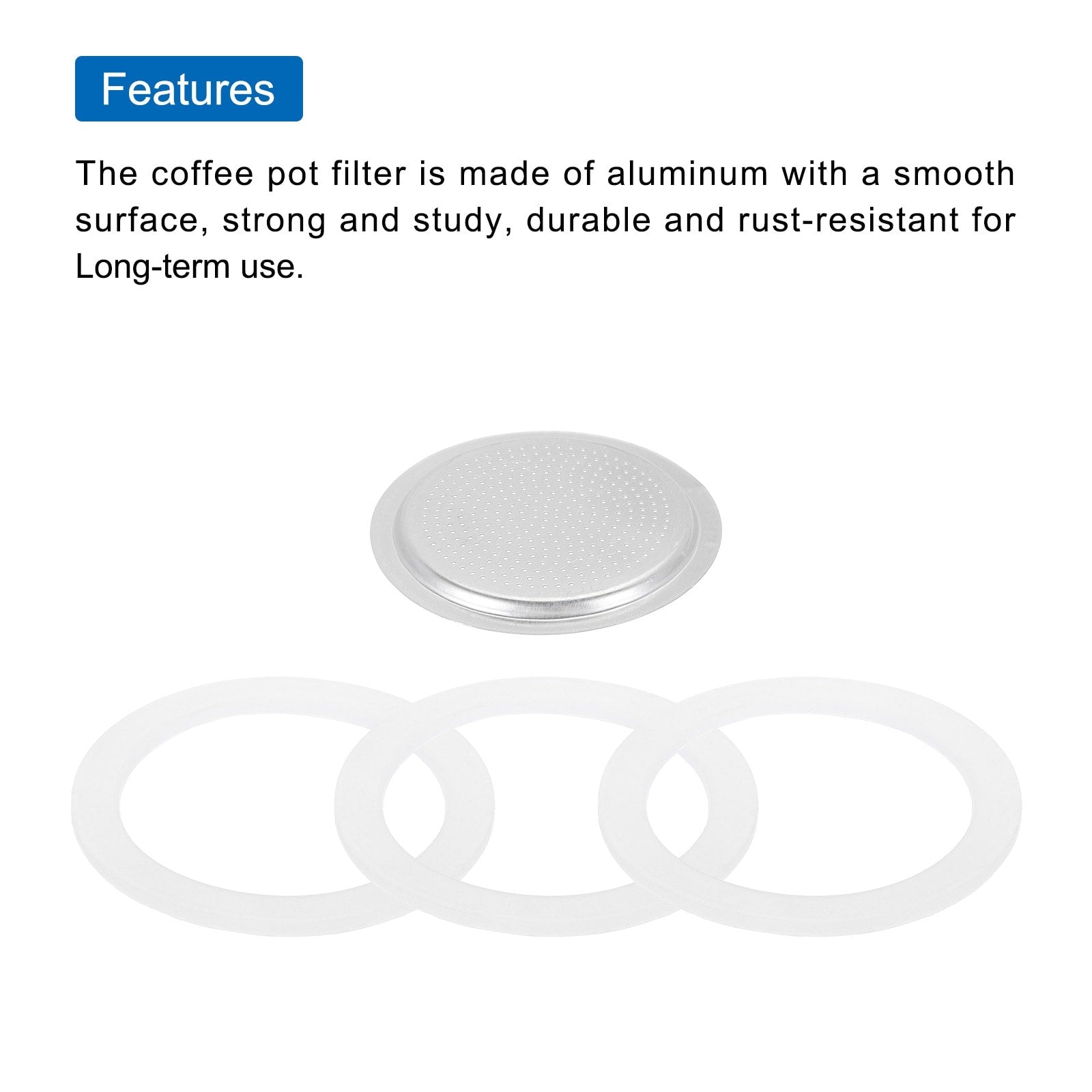The mocha pot filters,size: 64x54x3mm/2.52x2.13x0.12 inch(OD*ID*H);Type: Fit for 6-Cup use mocha coffee pot, Material:Aluminium;Color: Silver,Package Content(4PCS):1 × Aluminium Filter,3 x Seal Gaskets,