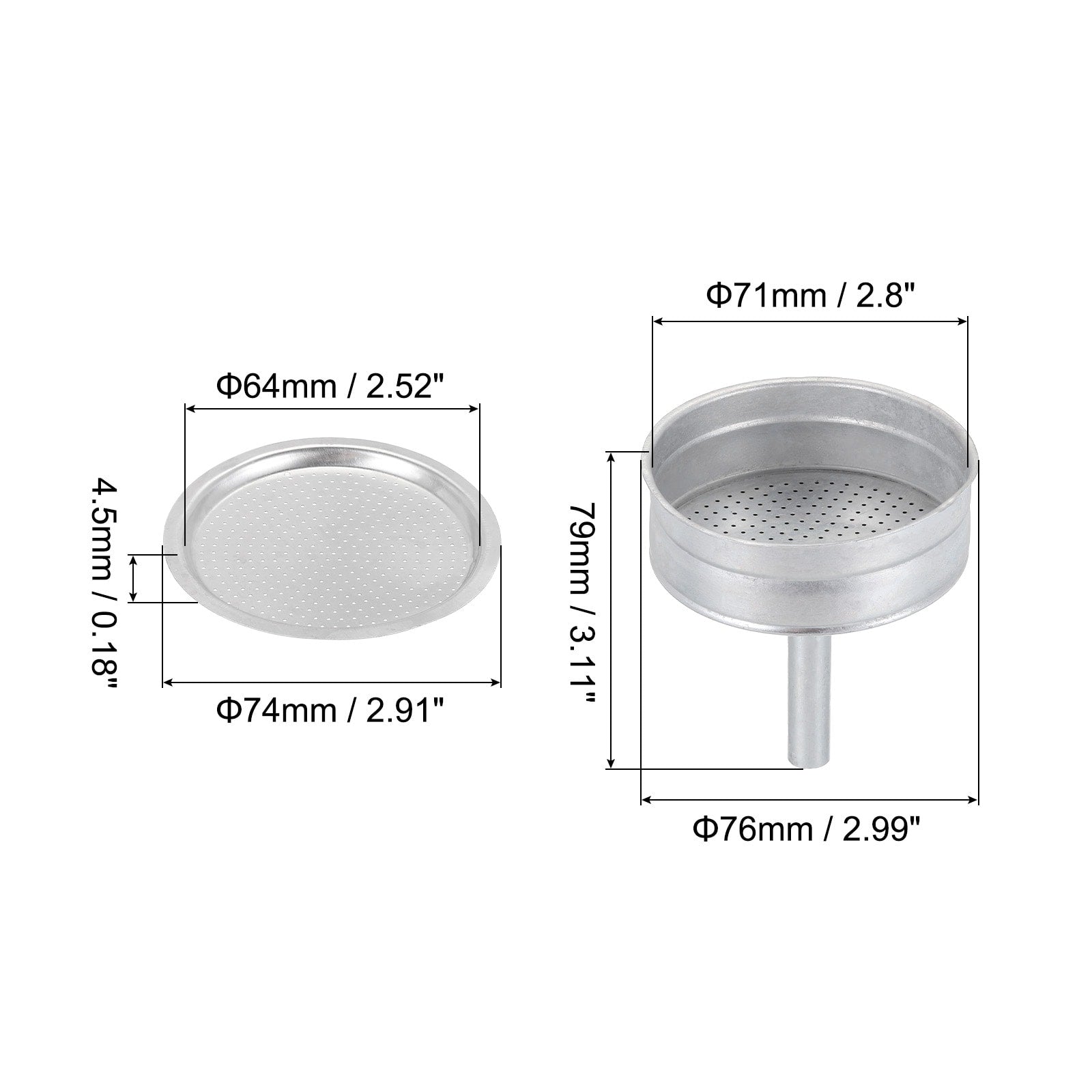The mocha pot Funnel filters,size: 74x64x4.5mm/2.91x2.52x0.18 inch(OD*ID*H);Funnel size:76x71x8x79mm/2.99x2.8x0.31x3.11 inch(OD*ID*H);Type: Fit for 9-Cup use mocha coffee pot, Material:Aluminium;Color: Silver,Package Content(5PCS):1 × Aluminium Filter,3 x Seal Gaskets,1 x Funnel.