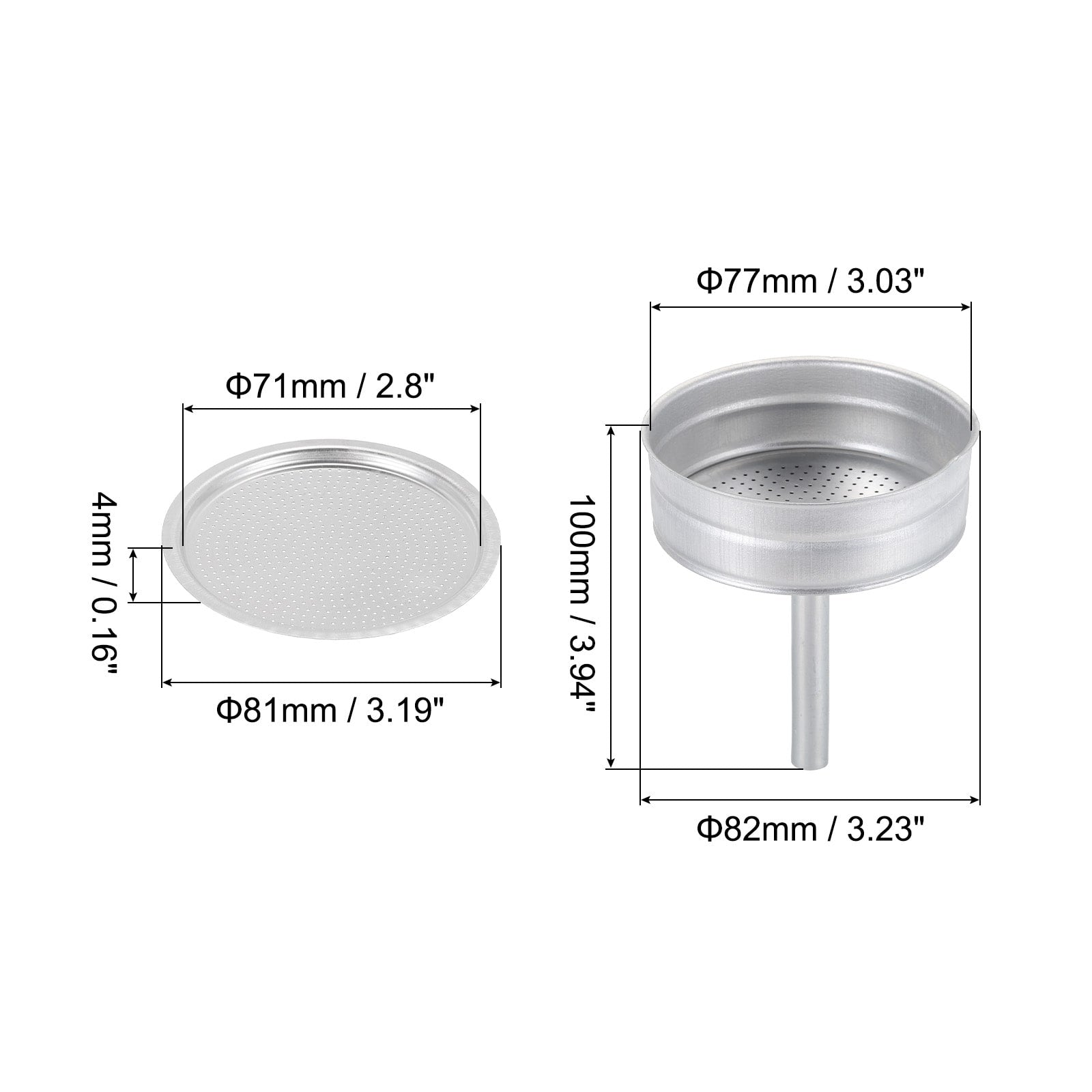 The mocha pot Funnel filters,size: 81x71x4mm/3.19x2.8x0.16 inch(OD*ID*H);Funnel size:82x77x8x100mm/3.23x3.03x0.31x3.94 inch(OD*ID*H);Type: Fit for 12-Cup use mocha coffee pot, Material:Aluminium;Color: Silver,Package Content(5PCS):1 × Aluminium Filter,3 x Seal Gaskets,1 x Funnel.