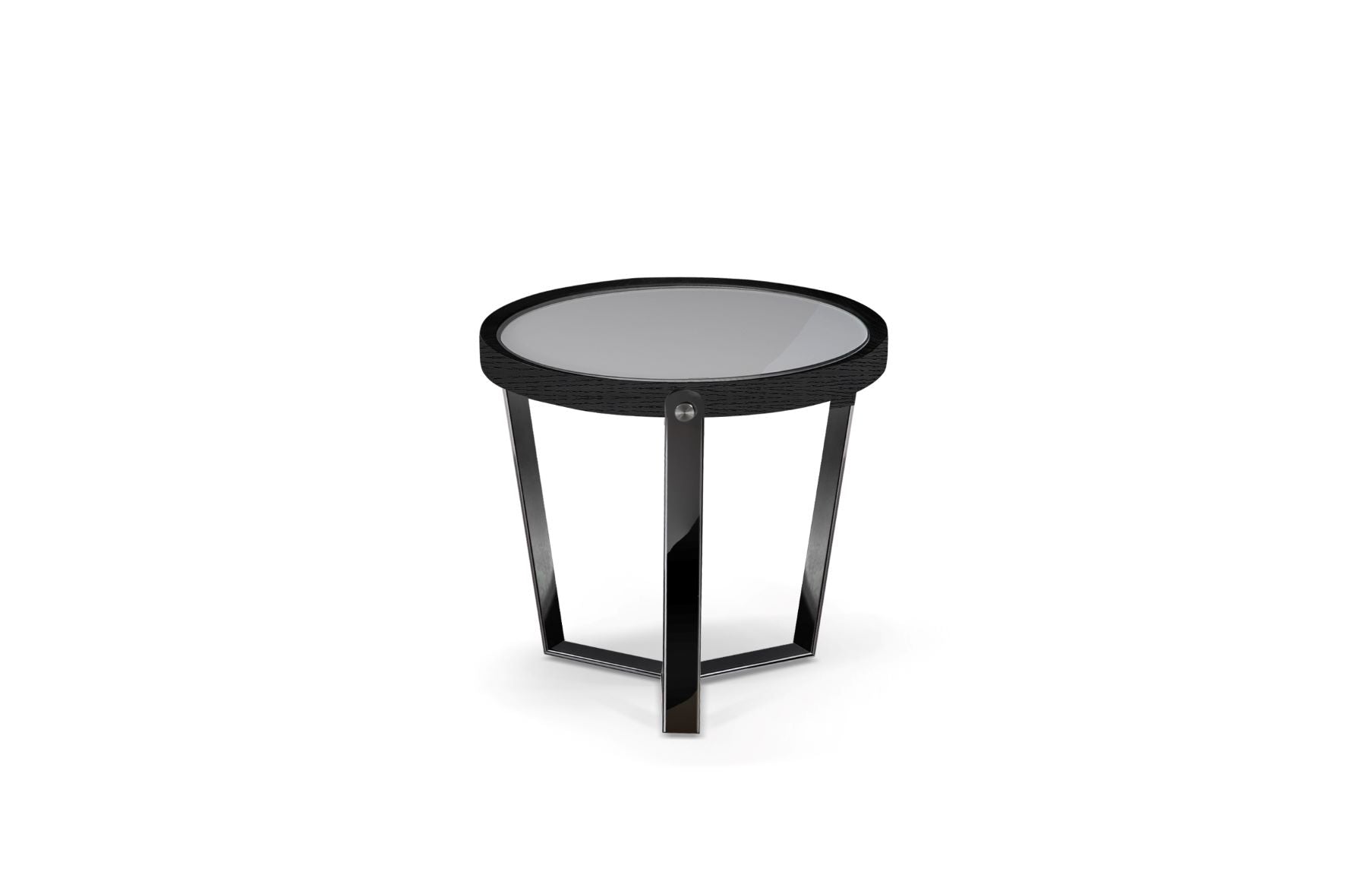 La table d'appoint ronde Ambra allie sophistication et beauté intérieure du design contemporain haut de gamme. Elle présente une structure ronde en chêne gris foncé, un plateau en verre fumé et des pieds en acier nickelé noir.