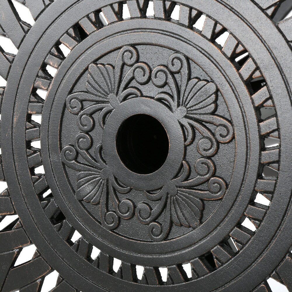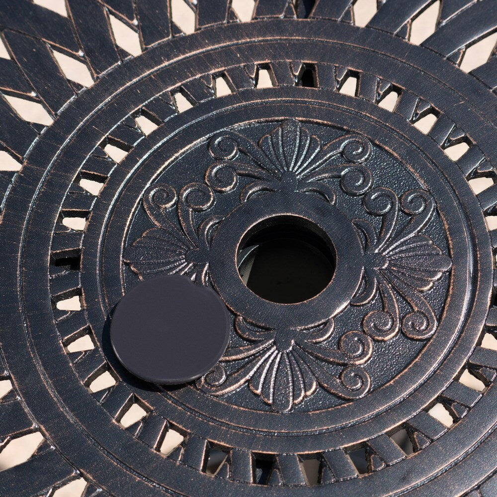 With its raised chairs, this bar set can be used by seated or standing guests to rest their drinks. Perfect for relaxing by the pool or on the patio. The table features a cast iron base but an aluminum top so that it is stable but highly easy to move. ?An excellent addition to your existing outdoor furniture.