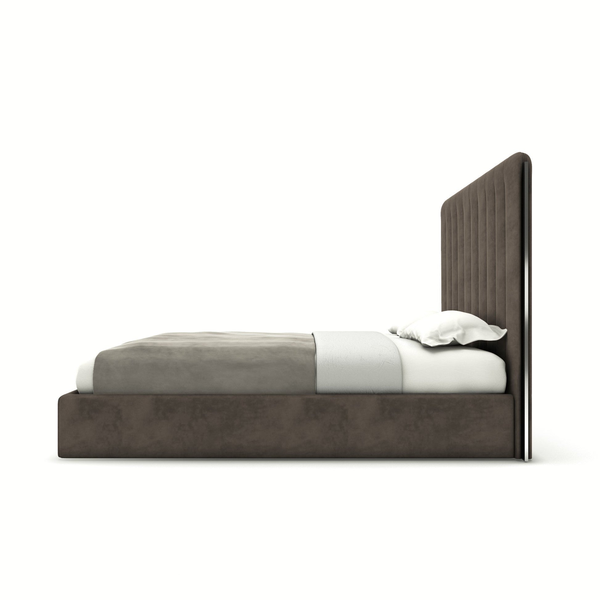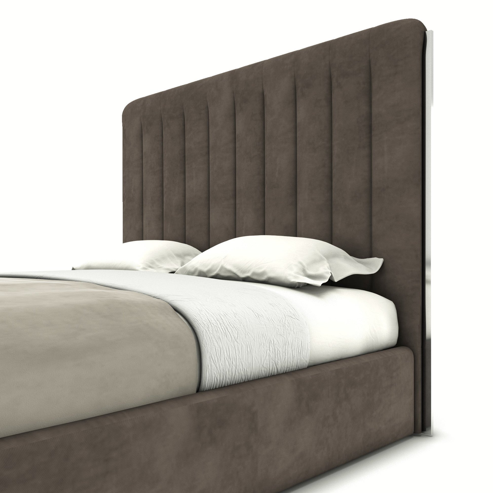 luxueux et moderne tête de lit haute à larges rayures verticales détails en métal chromé de chaque côté de la tête de lit structure en bois massif et manufacturé. lattes en bois avec cadre en métal entièrement rembourré |