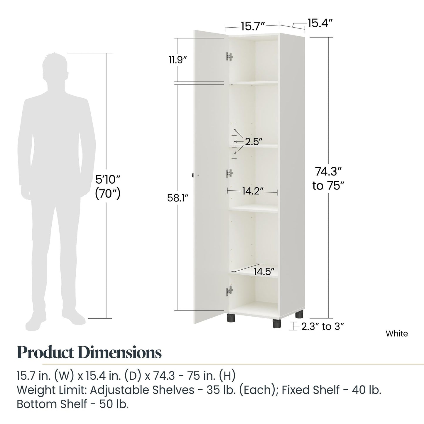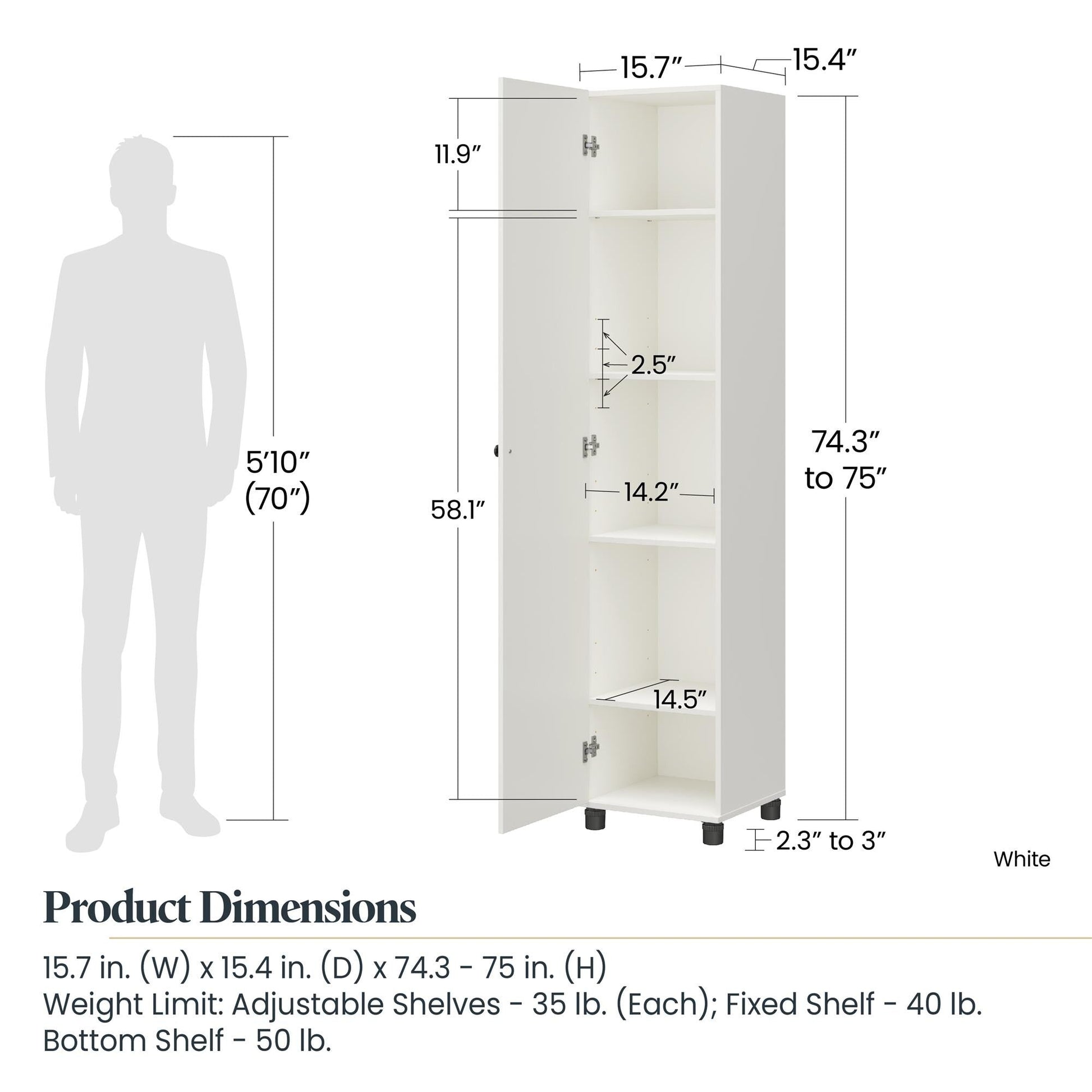 - SPECS: Overall Product Size: 15.67in. W x 15.39in. D x 74.29in. H; Shelf area (each): 14.17in. W x 14.53in. D; Max weight capacities: Adj. shelves: 35 lbs. each; Lower fixed: 50 lbs.; Top fixed: 40 lbs.; Assembled weight: 80 lbs.
