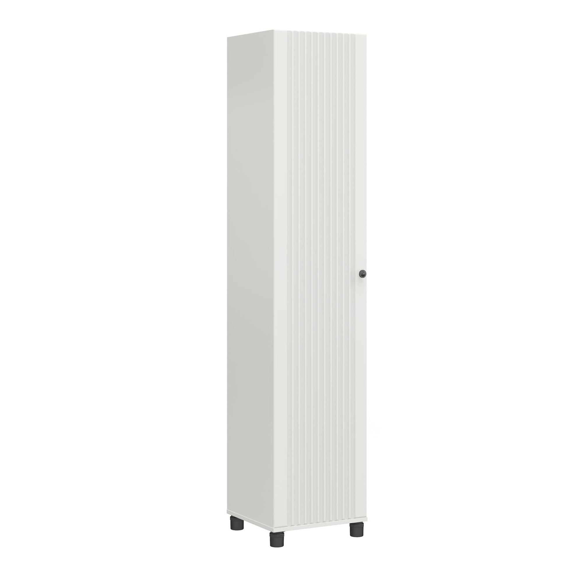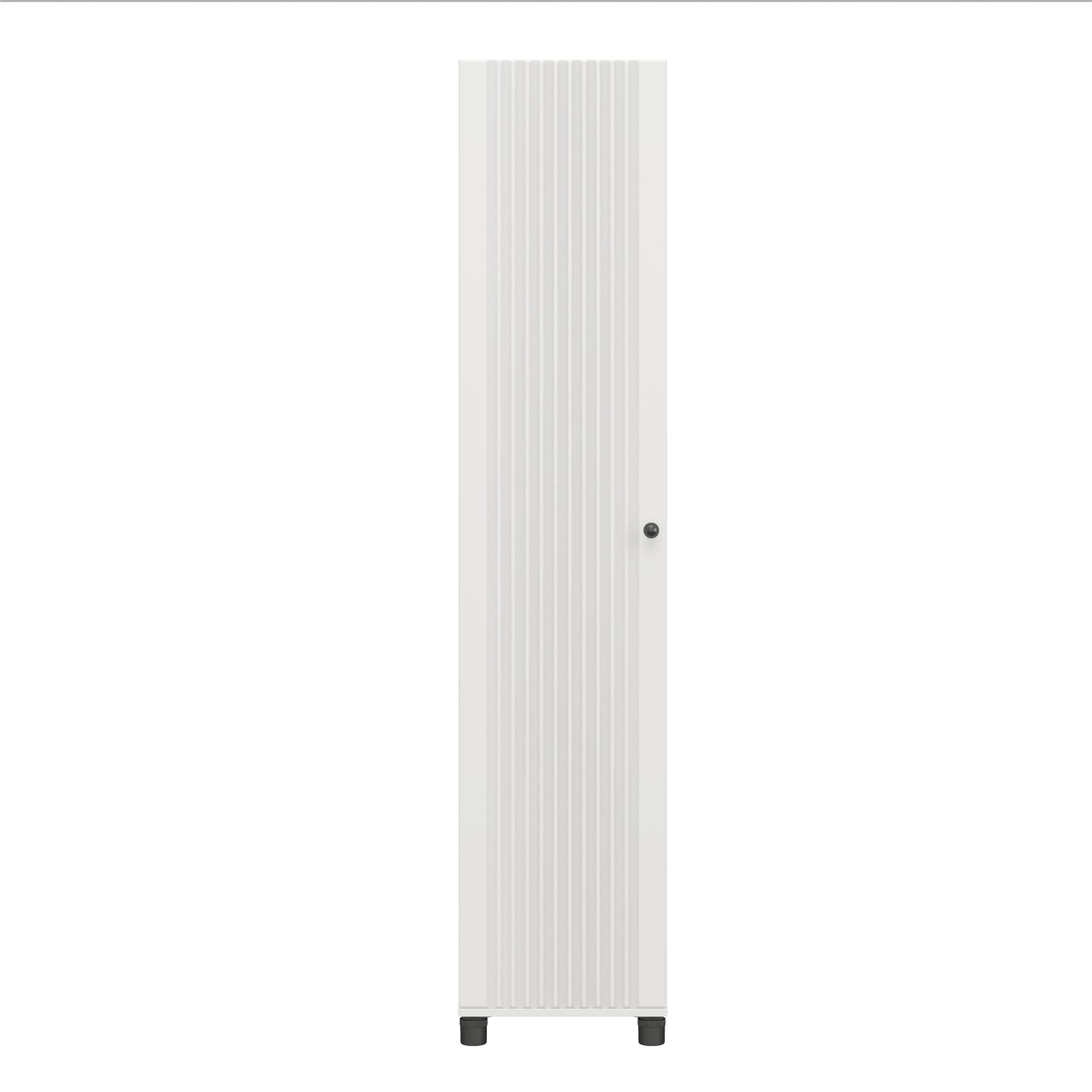 The Baldwin Fluted 16 inch Wide Storage Cabinet by Avenue Greene offers stylish organization for any room. Perfect for your laundry room, garage, entryway, basement, or bathroom, this cabinet impresses with its sleek design. It features five spacious shelves (two fixed, three adjustable) for storing all your essentials. The fluted vinyl doors add elegance, while the black metal hardware and adjustable black feet provide durability and functionality. Adjustable plastic feet keep the unit stable on uneven floors, protecting your items from spills and damage. With its versatile design, this cabinet accommodates cleaning supplies, linens, tools, and sports equipment. It's the perfect solution for stylishly organizing any space in your home.