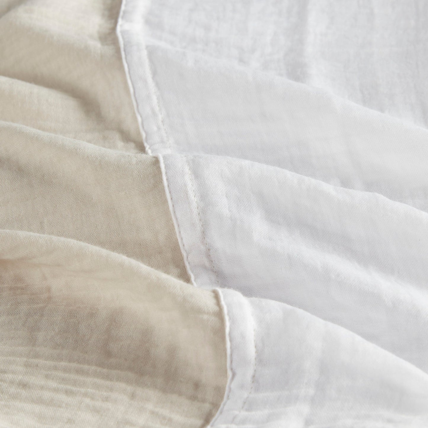 - Duvet Cover/Sham: 100-percent polyester gauze face, solid dyed and pieced; soft brushed microfiber reverse, solid dyed