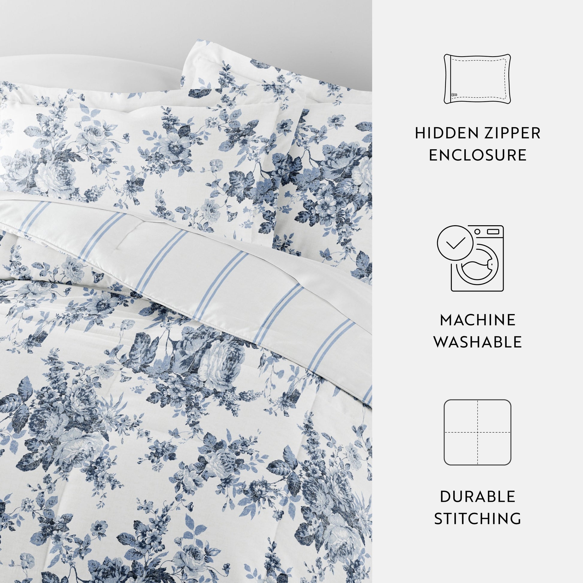 Give your bedding a brand new look and feel with this lightweight, all season patterned reversible comforter set. Presenting a down alternative quality, it's incredible softness makes it the perfect comforter to keep you cozy all year round. Our premium yarns are twice as durable than cotton, which means less risk of rips and wear. The sewn through box stitching prevents the fibers from shifting.
