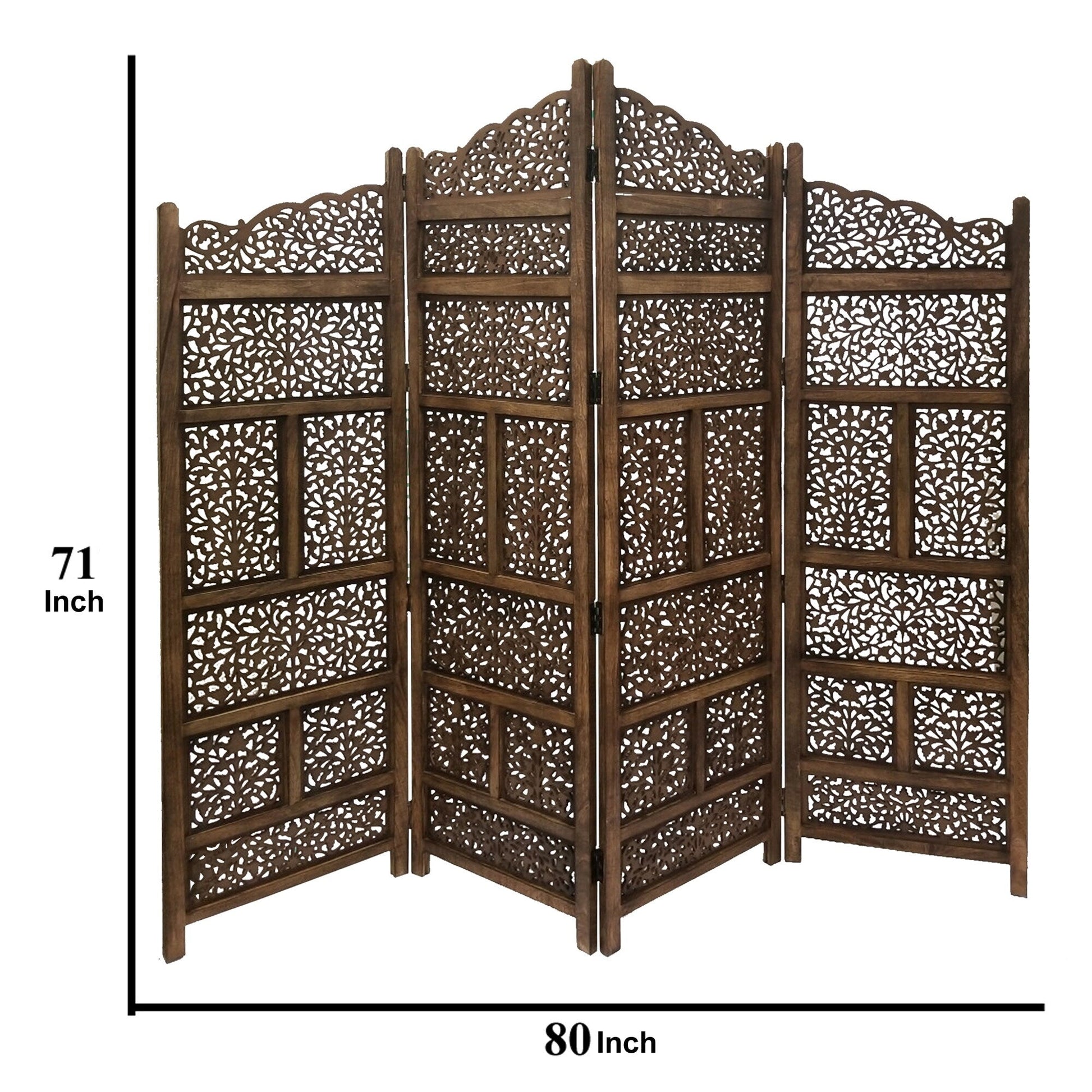 Benzara Hand Carved Foldable 4 Panel Wooden Partition Screen/RoomDivider,Brown
