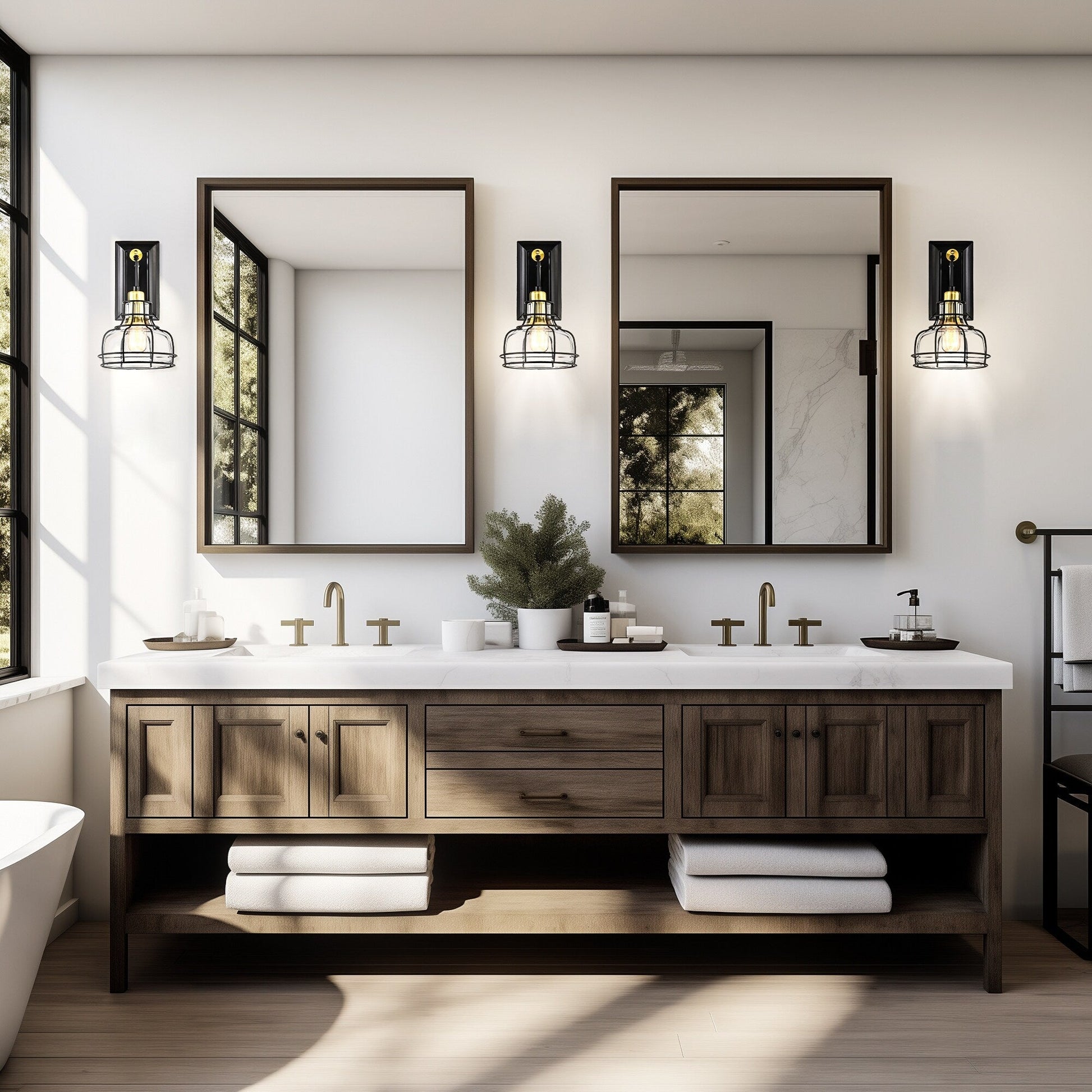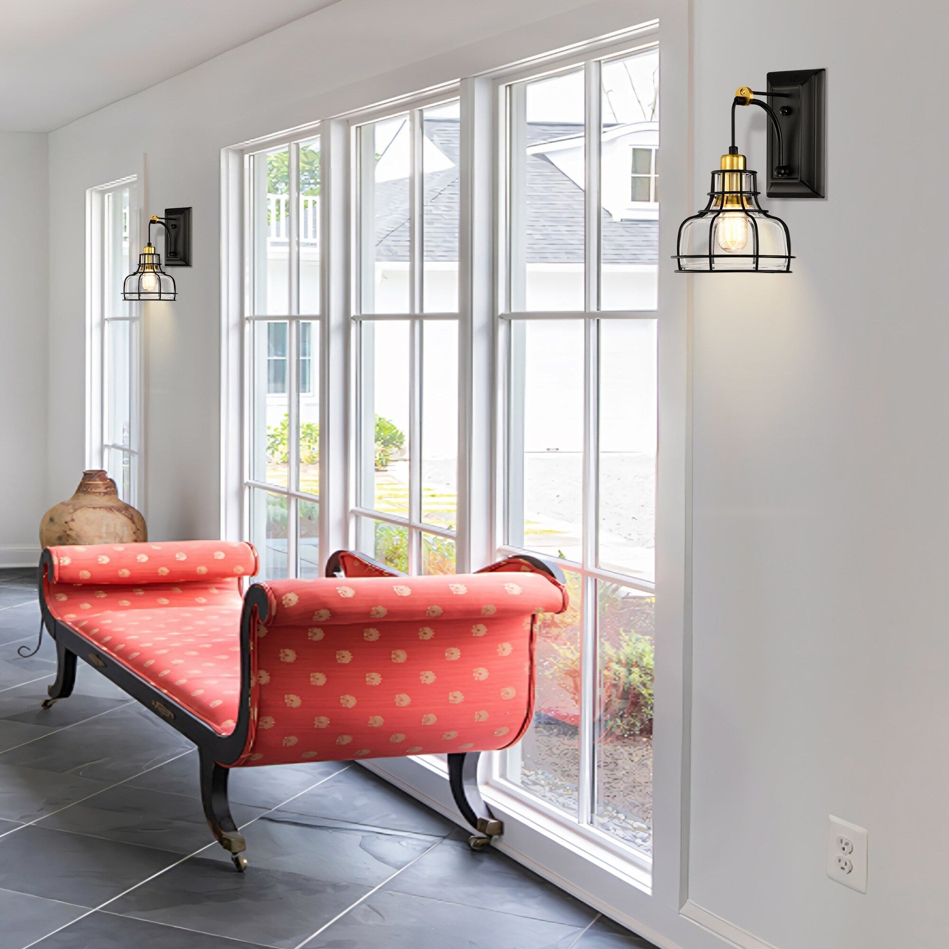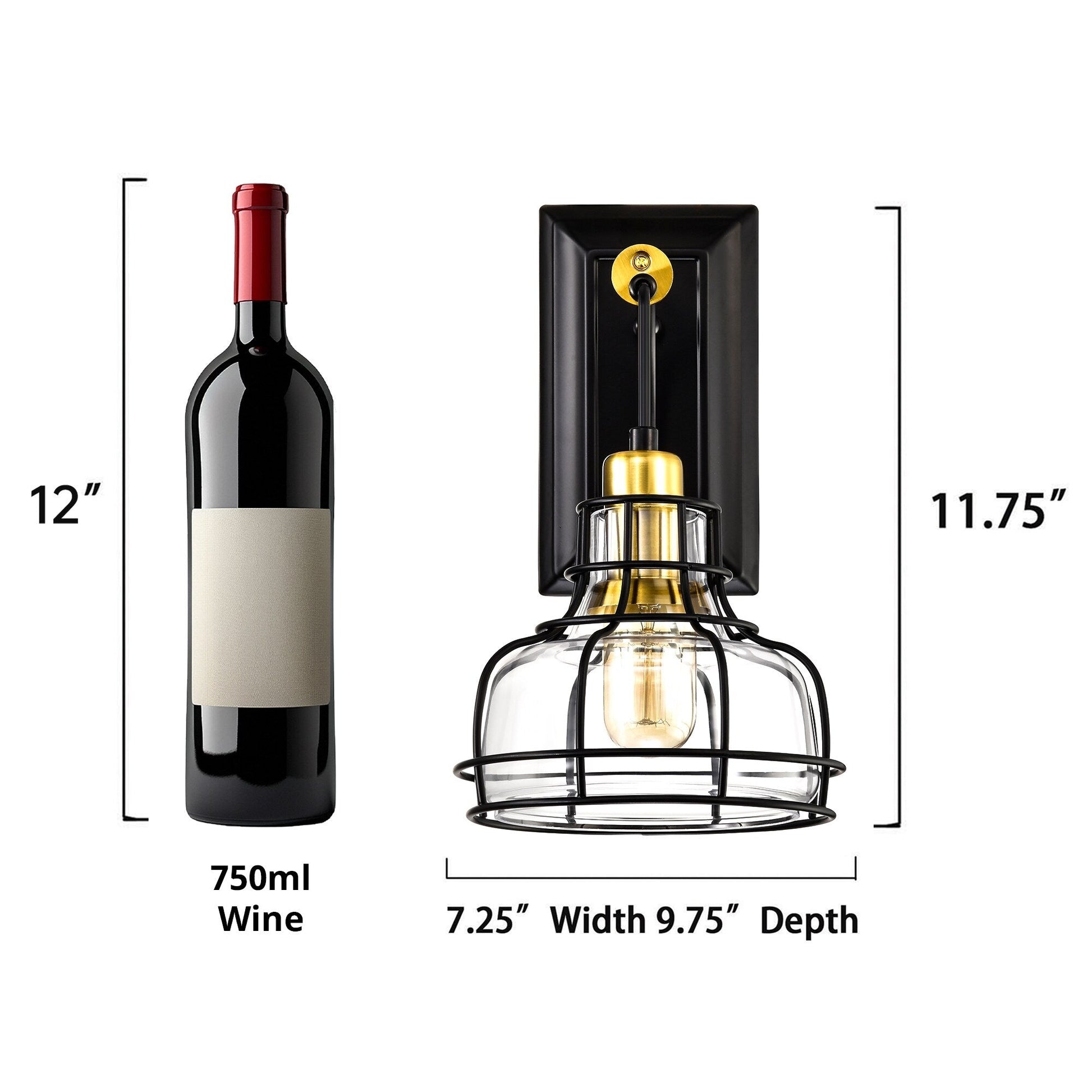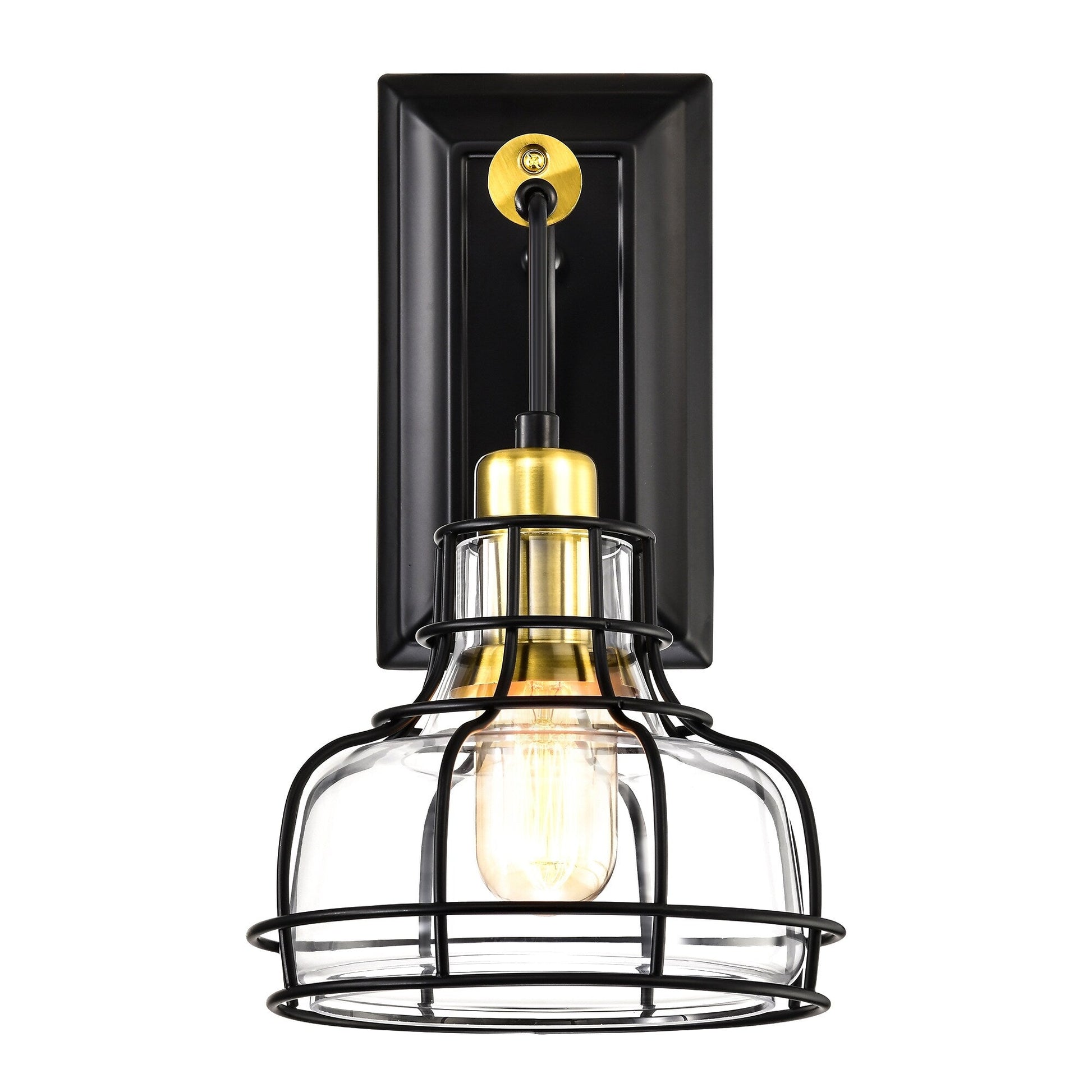 Embrace the industrial design movement with this wall sconce. This stylish fixture features a glass shade that is wrapped by a black metal cage. The combination of the black metal, the antique gold, and the thick cage wire give your space an industrial vibe. Use the wall sconce to create various levels of lighting in your design plan.